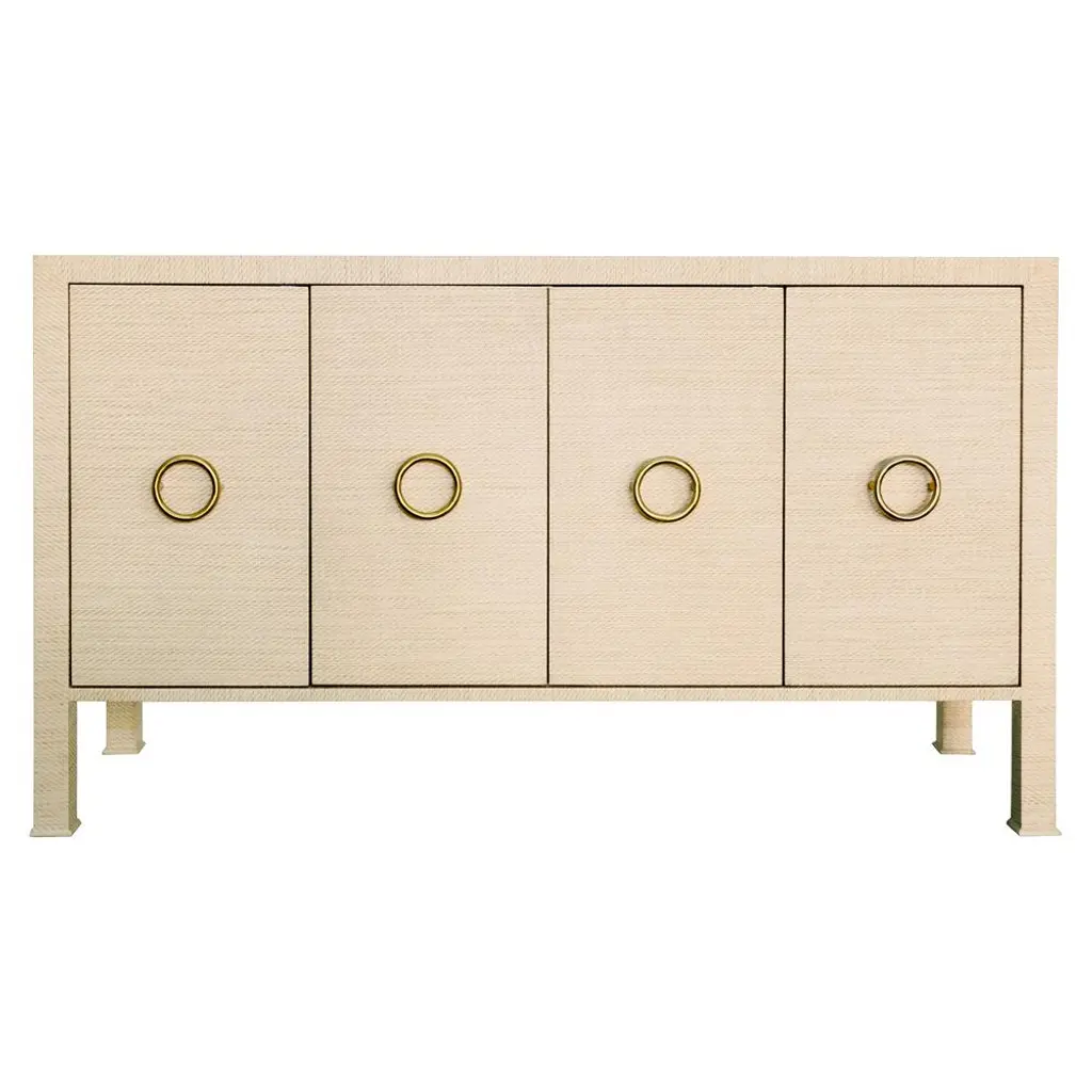New special order item. Not vintage. Four Door Buffet with Antique Brass Circle Hardware in Natural Grasscloth. 58" W X 34" H X 20" D *Grasscloth has natural variations and may differ slightly between panels. Width:58.00" Height:34.00" Depth:20.00"
