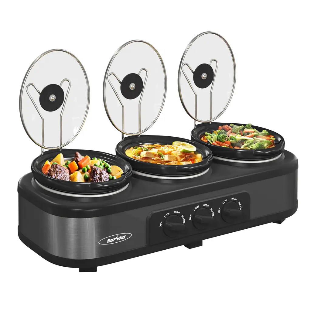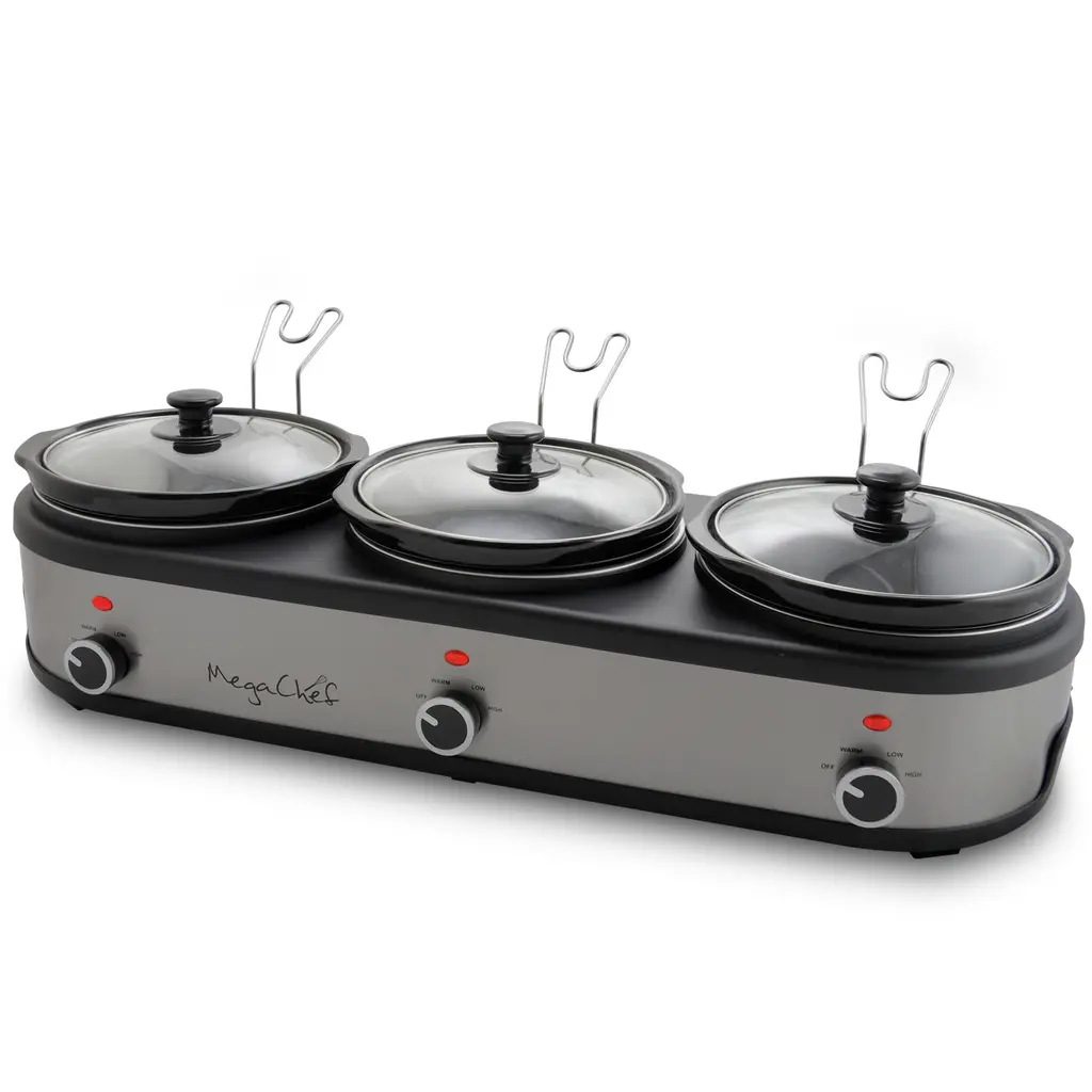 With the New MegaChef Triple 2.5 Quart Slow Cooker and Buffet Server in Brushed Silver and Black Finish with 3 Ceramic Cooking Pots and Removable Lid Rests will be your helping hand whenever you need to prepare multiple meals simultaneously without the hustle and bustle of a restaurant kitchen! With this incredible kitchen tool, you will be able to not only cook 3 individual meals at the same time without having to monitor the stove, but you will also be able to keep those meals hot and serve them to your family and friends or guests and coworkers without breaking a sweat. This stunning slow cooker and buffer server features 3 Ceramic 2.5 Quart Cooking Pots with their own settings allowing you to control the heat level for each meal you cook. With the included detachable lid rests, your guests can easily serve themselves hassle free. Once you try serving meals with such ease it may be difficult to go without this unit again at any gathering! CUT YOUR COOKING TIME IN 3: Each of the 2.5 quart Ceramic Slow Cooker Pots is equipped with individual controls for your convenience. Allowing you to cook 3 individual dishes simultaneously! 3 SETTINGS PER EACH POT: Each Ceramic Slow Cooker Pots offers a LOW, HIGH and WARM Setting. Allowing you to not only cook 3 individual meals but keep them warm to be served to your family or guests! REMOVABLE LID RESTS: A convenient detachable lid rest is included for each of the Ceramic Slow Cooker Pots! Once you are ready to serve simply place the lids into their rests to allow easy access to the delicious meals you've prepared! ANTI SLIP FEET: This unit features anti slip rubber feet to ensure your Buffet Server Slow Cooker stays safely secure while you serve. CUT YOUR COOKING TIME IN 3: Each of the 2.5 quart Ceramic Slow Cooker Pots is equipped with individual controls for your convenience. Allowing you to cook 3 individual dishes simultaneously! 3 SETTINGS PER EACH POT: Each Ceramic Slow Cooker Pots offers a LOW, HIGH and WARM Setting. Allowing you to not only cook 3 individual meals but keep them warm to be served to your family or guests! REMOVABLE LID RESTS: A convenient detachable lid rest is included for each of the Ceramic Slow Cooker Pots! Once you are ready to serve simply place the lids into their rests to allow easy access to the delicious meals you've prepared! ANTI SLIP FEET: This unit features anti slip rubber feet to ensure your Buffet Server Slow Cooker stays safely secure while you serve. 1000 Watts x 3