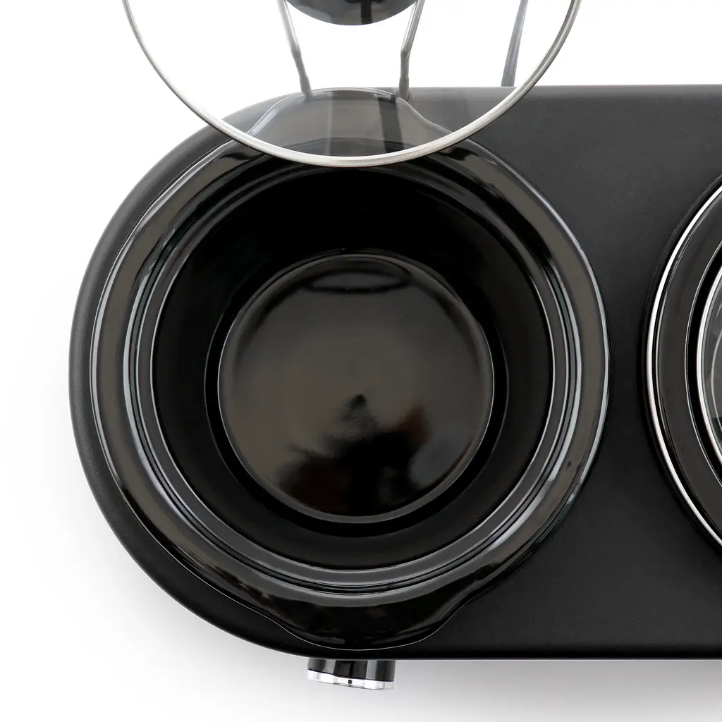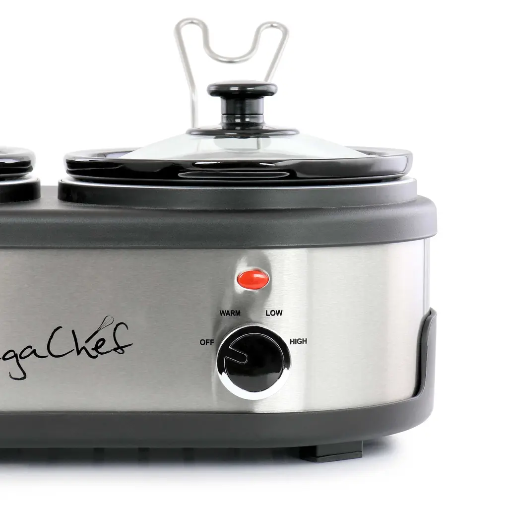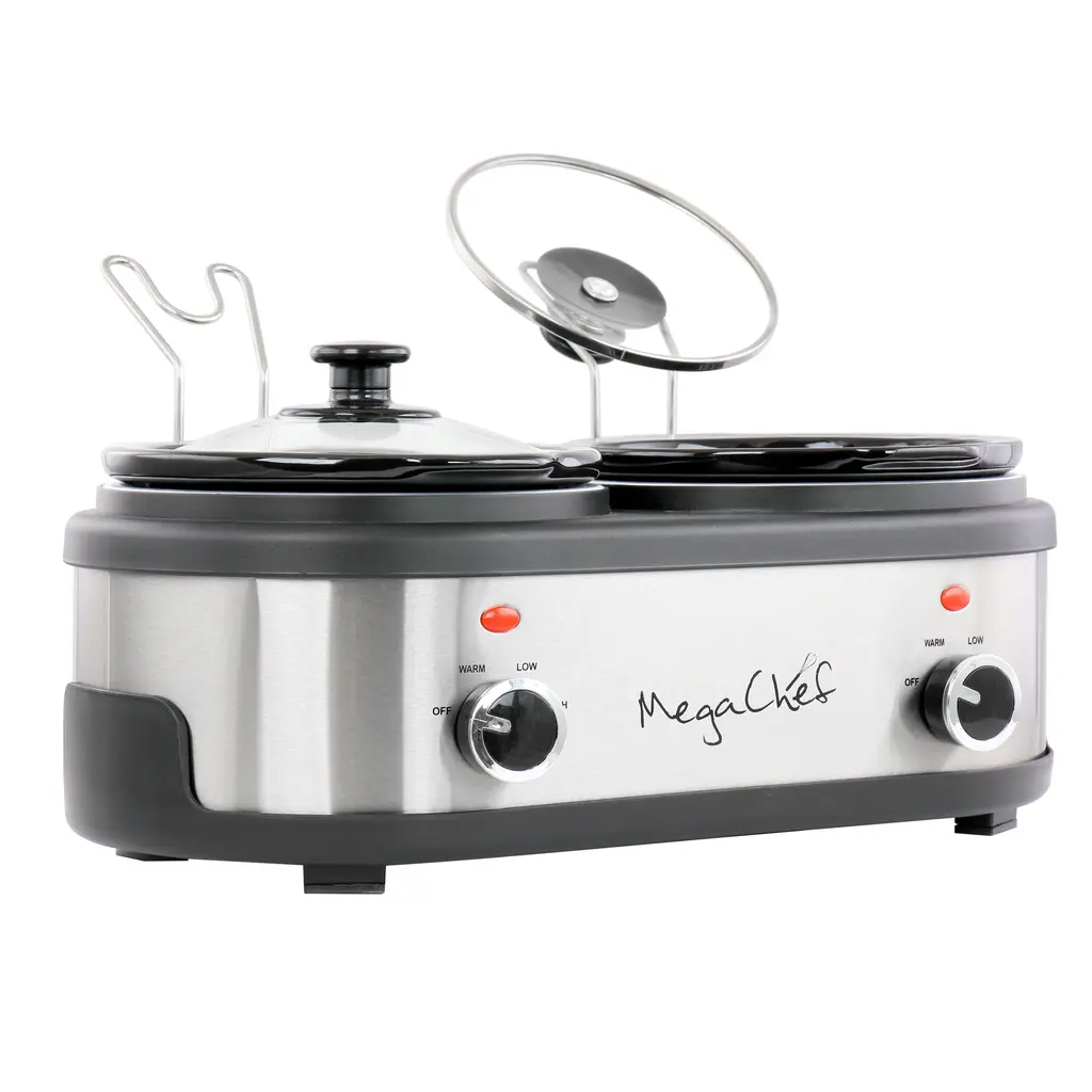 MegaChef's Dual Slow Cooker Buffet Server will keep food warm, fresh and delicious all the time. Cook and serve up two different dishes directly in the crocks and keep them warm for hours. Featuring two 1.5 Liter removable Ceramic crocks, this slow cooker also has dual function cooking knobs giving you the flexibility to cook two different meals at the same time. See through glass lids, lid holders, non-skid rubber feet and the cool touch handles and knobs are perfect for entertaining guests. Crocks and lids are dishwasher safe, allowing for more time to entertain and less fuss over cleaning.