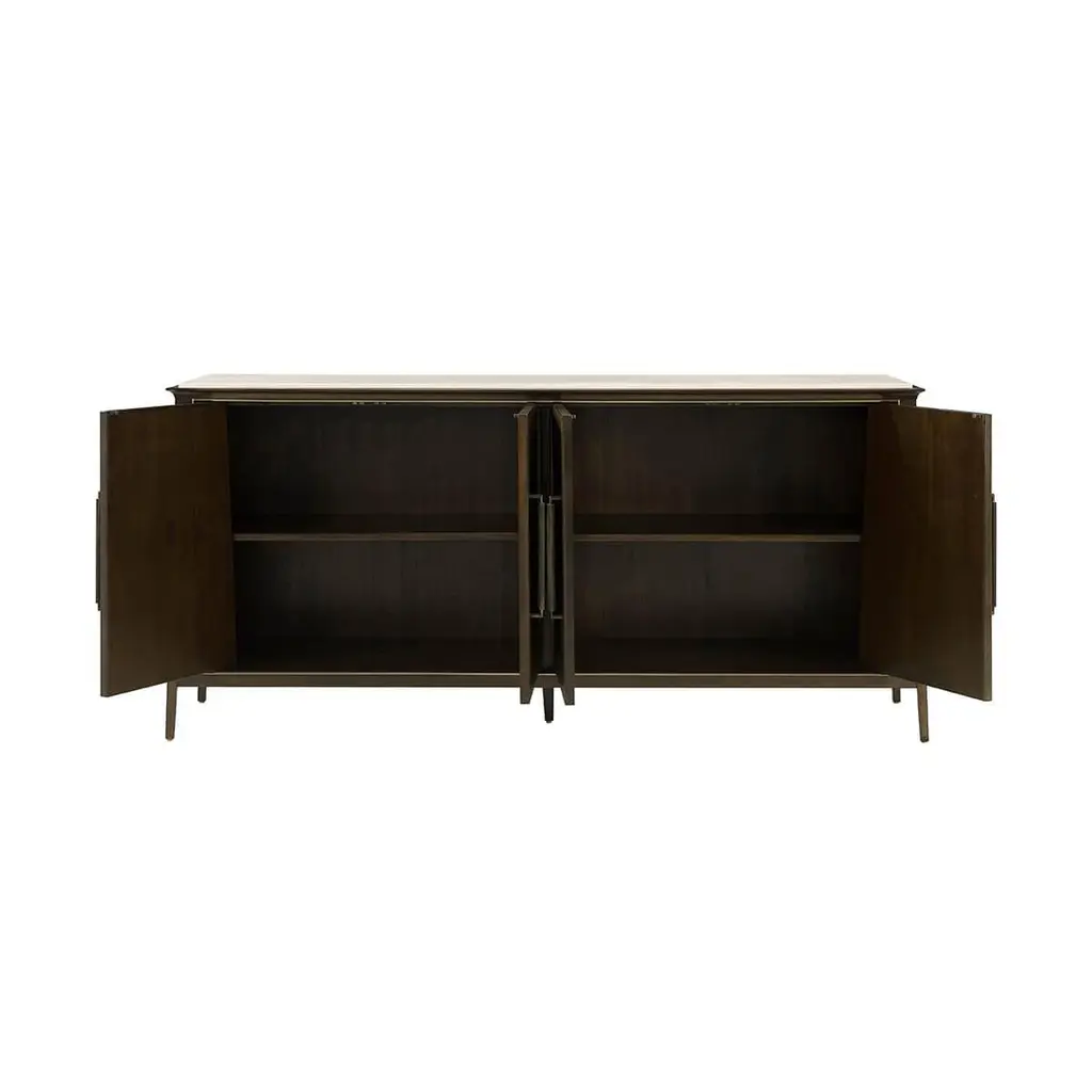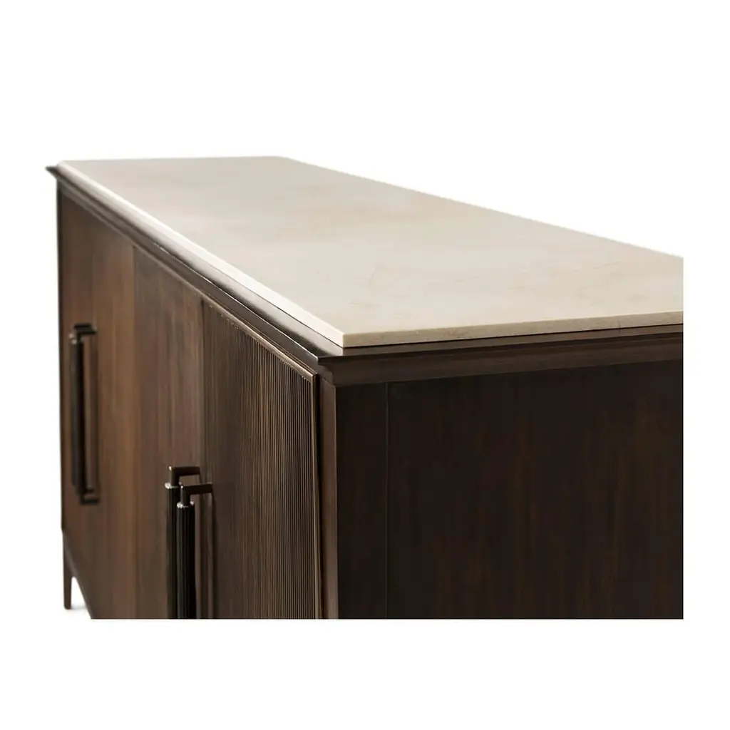 Featuring a sophisticated tapering silhouette and reeded angular doors, in the dark Bistre finish and complimented by a beautifully honed inset Crema Marfil marble stone top. The custom forged hardware, finished in a dark rubbed bronze, echoes the reeded details throughout.Dimensions: 71.5" W x 19" D x 34" H