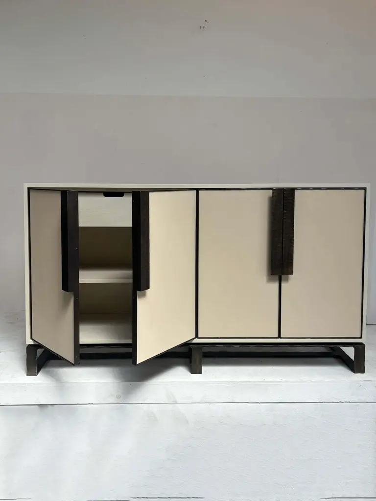 Modern Chelsea Leather Four Door Buffet by Ercole Home has a 4-door front, with a Sand finish on Oak. Leather covers each of the hand-hammered metal framed doors, with hand-hammered handles and base in a Bronze finish. There is drawer and one adjustable shelf in each compartment. Custom sizes and finishes are available, as well as drawers and compartments in varying sizes. Made in Brooklyn, NY