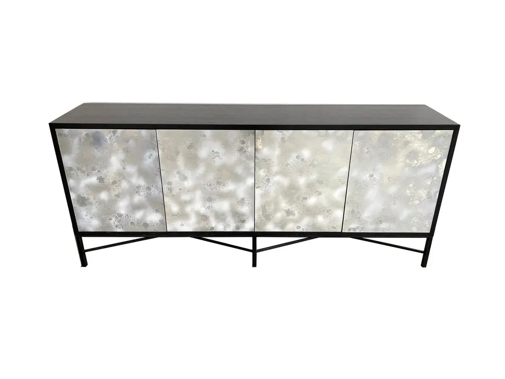 The Industrial buffet or credenza by Ercole home has a 4-door front with touch latch.The wood is finished in a Wenge on oak.Hand-painted white dust eglomise glass are on the door surfaces which is handpainted in out Brooklyn NY studio.The Modern style base with straight legs and X-shape stretchers are finished in a Blackened Natural Steel There is one pull out drawer and adjustable interior shelf in each compartment.Custom sizes and finishes are available. You can add drawers and compartments in varying sizes to the interior as well.Made in New York City.