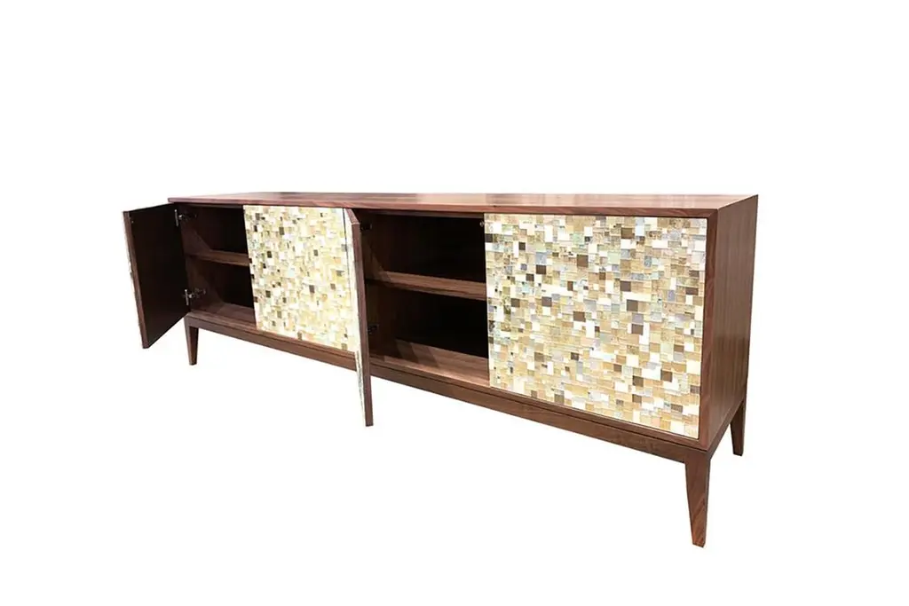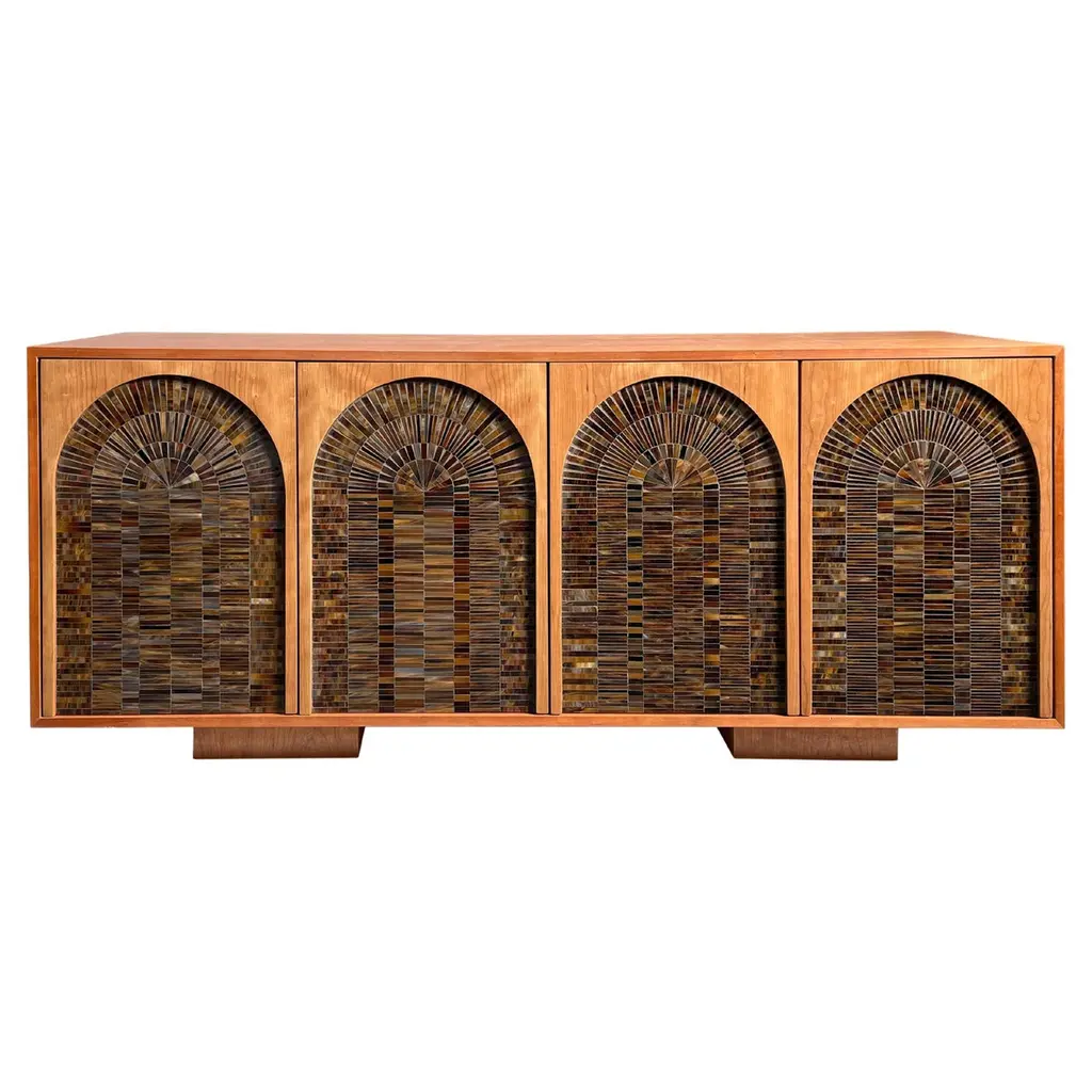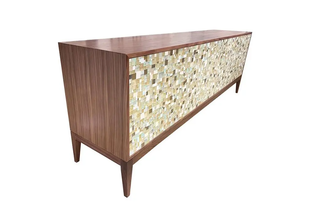 The Modern Milano Buffet by Ercole Home, with 4 touch latch doors within a Natural Walnut case. The doors feature hand-cut and hand-painted glass mosaic in our geometric Mondrian pattern. The glass colors include Ivory, Gold, Celadon, and Silver, creating a quietly elegant look. Inside the two compartments you will find adjustable wood shelves providing ample storage. Custom sizes, glass colors, and wood finishes are available. This piece is hand crafted by Ercole's team of mosaic artists at our Brooklyn, NY studio.