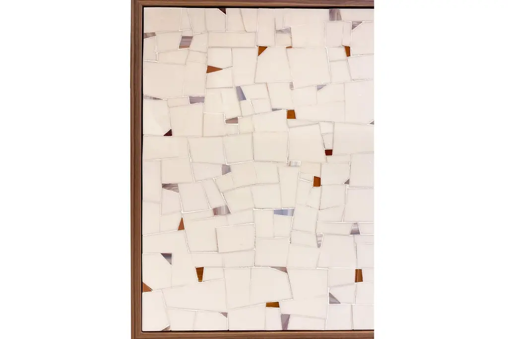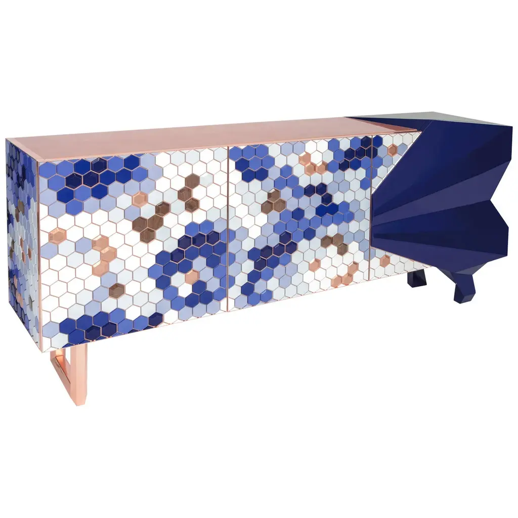 The platform buffet by Ercole Home has a 6-door front, with a natural wood finish on Walnut. Handcut glass mosaics in Light ivory/pink glass mosaic decorate the surface in a continuous Terrazzo pattern. There is one adjustable interior shelf in each compartment, with touch latches on each door. Custom sizes and finishes are available. You can add drawers and compartments in varying sizes to the interior as well. Please inquire if of interest.Made in New York City.