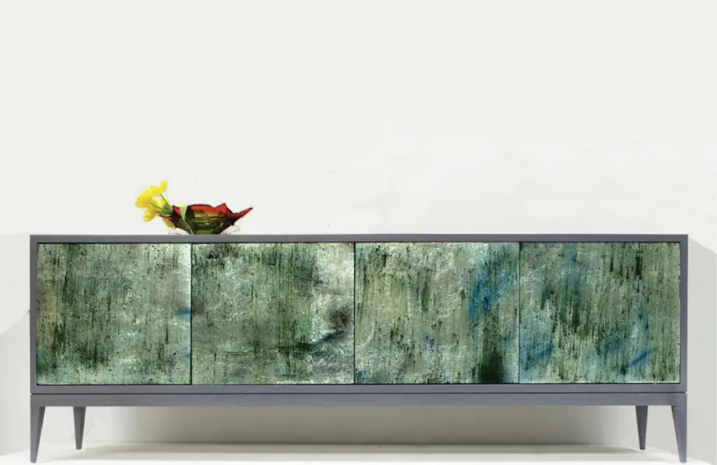 The Milano buffet by Ercole Home has a 4-door touch latch on the front front, with reversed painted glass in moss greens and blues and a painted gray wood finish on oak. Adjustable interior shelving on each compartment.custom sizes and colors available.Made in New York City.