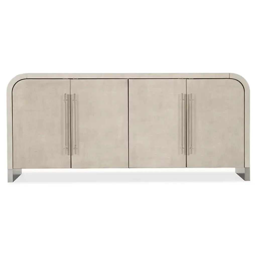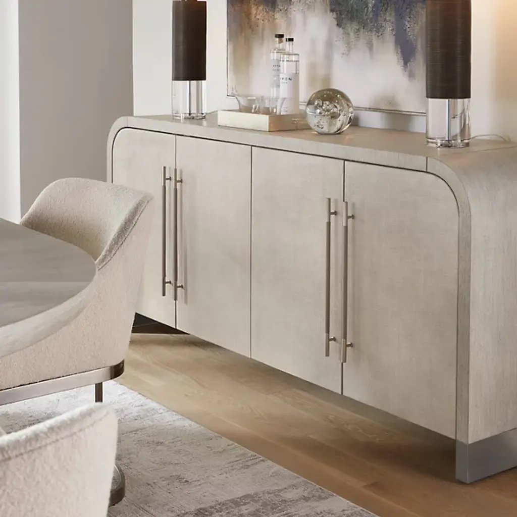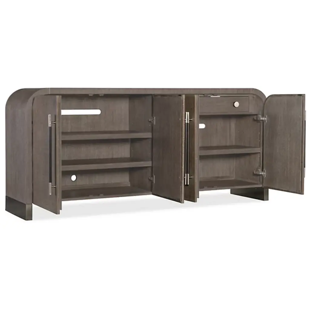 The Modern Mood Buffet from Hooker Furniture features a soft, modern style with a substantive form. Matching this theme, the four drawers are equipped with soft-close hinges with magnetic catches. Behind these, adjustable shelves, ventilated back panels, wire management holes, and a three-plug electrical outlet accommodate the needs of contemporary life. Its design draws upon a variety of decades and design movements, unconstrained by any single one, to create a modern aesthetic that transcends time.