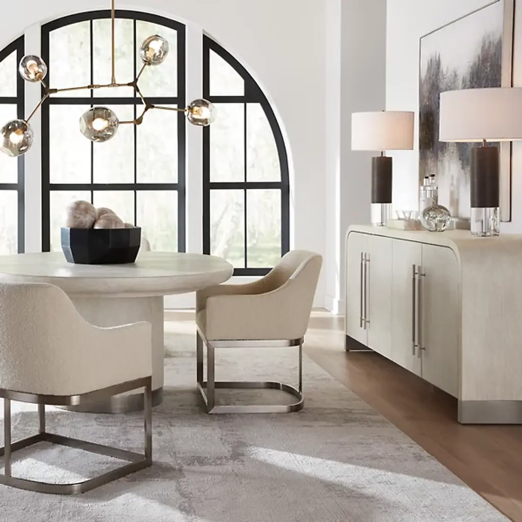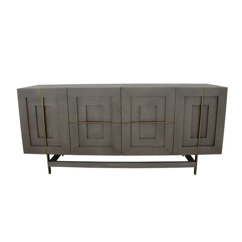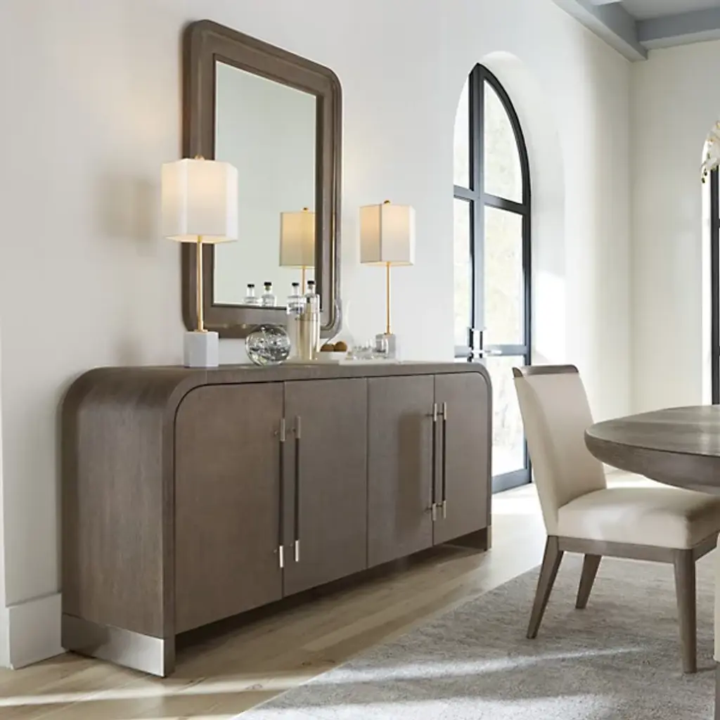The Modern Mood Buffet from Hooker Furniture features a soft, modern style with a substantive form. Matching this theme, the four drawers are equipped with soft-close hinges with magnetic catches. Behind these, adjustable shelves, ventilated back panels, wire management holes, and a three-plug electrical outlet accommodate the needs of contemporary life. Its design draws upon a variety of decades and design movements, unconstrained by any single one, to create a modern aesthetic that transcends time.