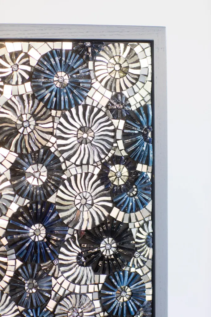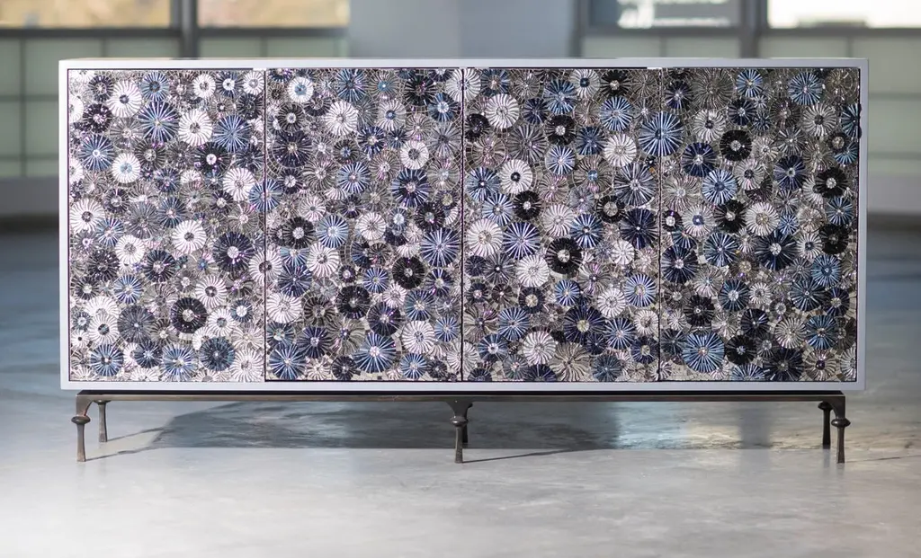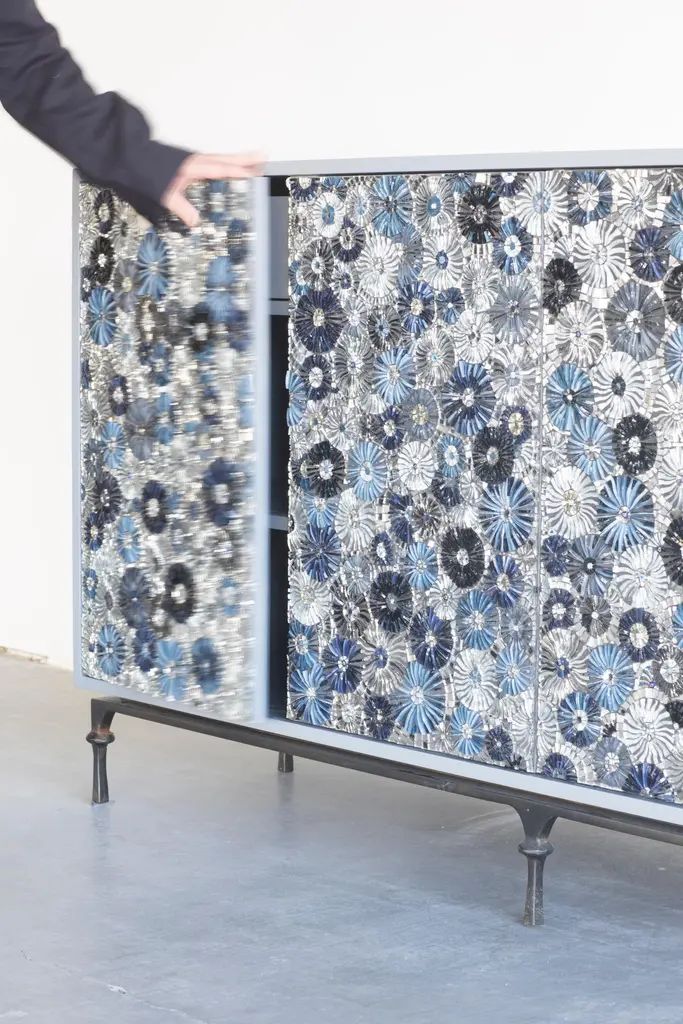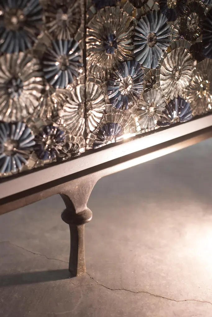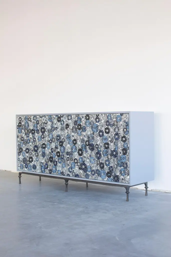 This show stopping 4 door Buffet by Ercole Home is a sparkling new addition to our Blossom Collection. This buffet is made up of two compartments, 4 drawers, and adjustable shelves. The touch latch doors are adorned in a mixture of deep blues and a variety of silver and pewter glass in our iconic blossom pattern. The way light interacts with these glass doors will leave you speechless. The exterior of the cabinet is finished in our painted gray on oak with grain. Finally, this buffet sits on top of a forged metal base that is a natural steel finish. Custom sizes and finishes are available. You can add drawers and compartments in varying sizes to the interior as well.Made in New York City.