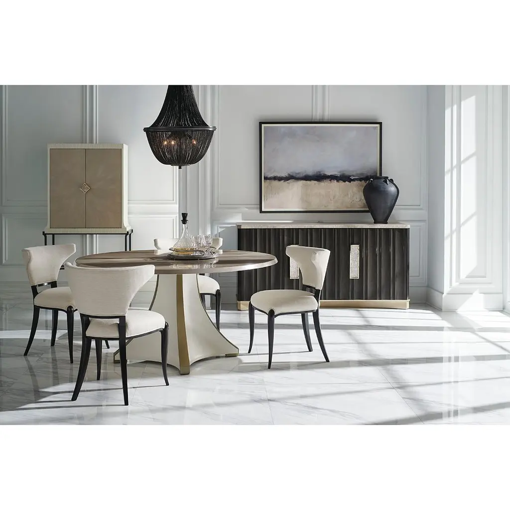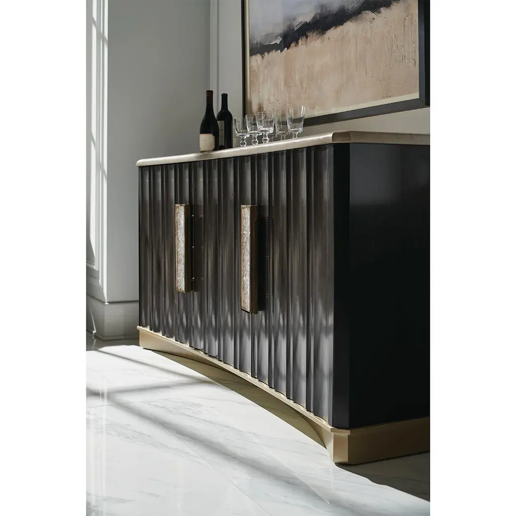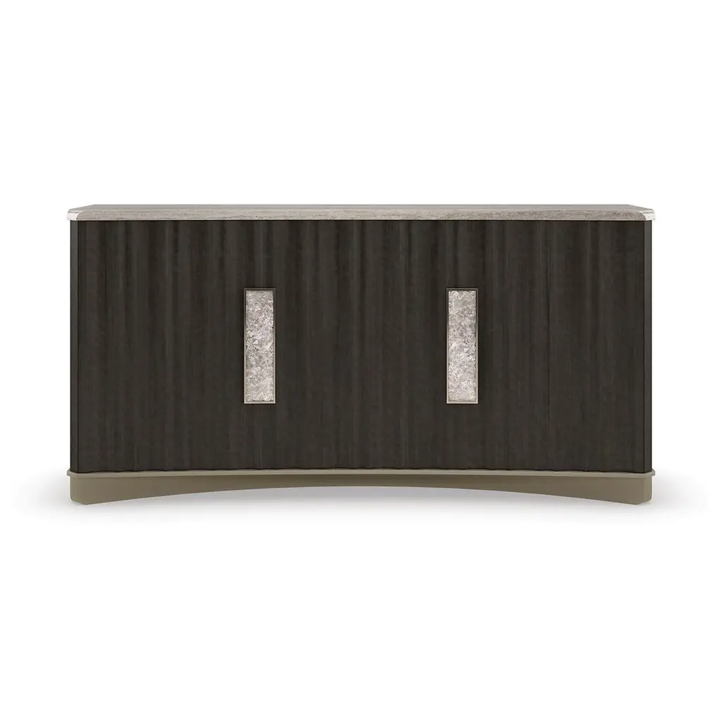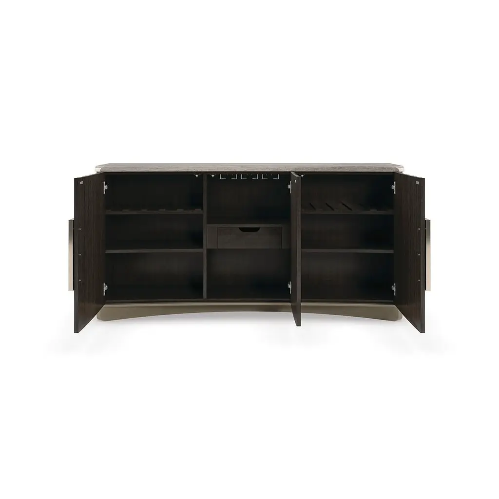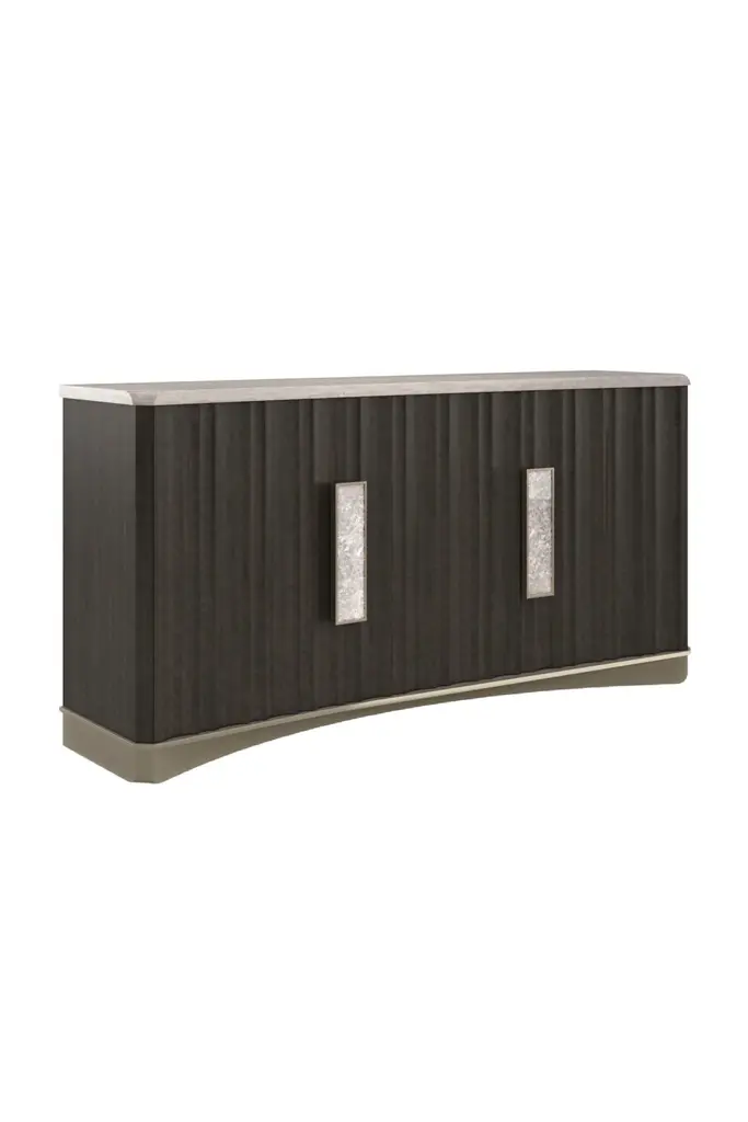 Modern stone top Buffet, meticulously handcrafted with a curtain-fold carving on the doors and subtly curved plinth base. Gold-plated, rectangular door pulls inset with crushed crystal acrylic create warmth and shimmer against its dark, the case finished in charred bark. Featuring a silver Travertine stone top and ample storage for linens and entertaining essentials, including a top shelf that flips to store stemware and bottles.Dimensions: 72" W x 18" D x 35" HTop is a natural stone. Natural variations in color, veining and spotting will vary from piece to piece. Natural materials are porous in nature and care should be taken protect the surface.
