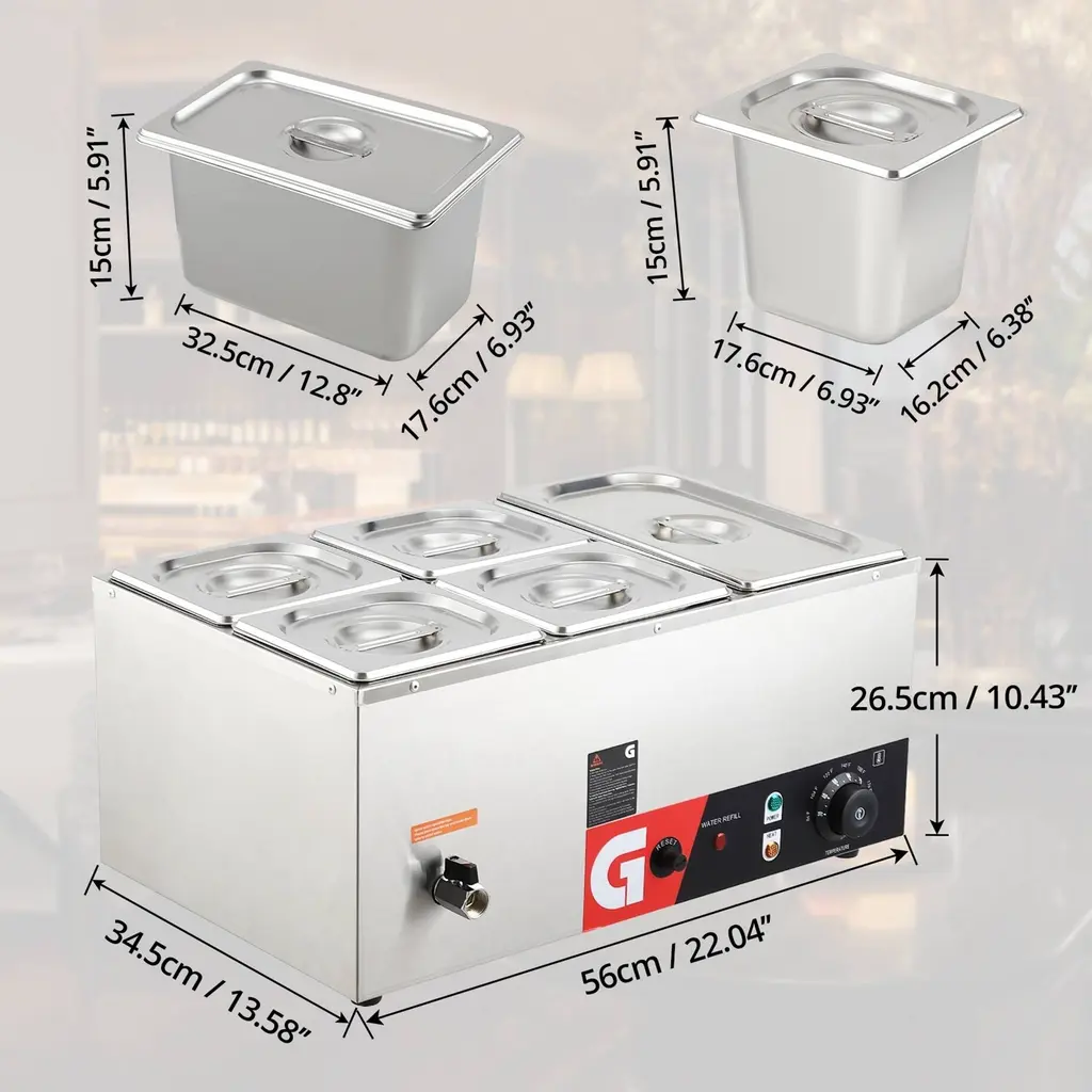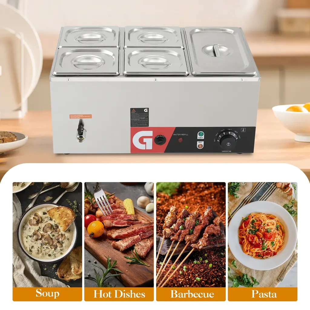 Efficient and Uniform Heating - This electric countertop food warmer features a powerful 1200-watt stainless steel heating tube that quickly warms your food. Thanks to its specially designed internal heating elements, this warmer keeps your prepared dishes at ready-to-eat temperatures for hours. The U-shaped design ensures even heat distribution for consistent results.Long-lasting Insulation - The electric food warmer comes with a temperature-adjustable knob for effective heat preservation. It maintains food temperatures between 86-185°F, so you can enjoy warm meals whenever you like!Considerate Details - Each pan is accompanied by a practical notched lid, cleverly designed to maintain warmth while sealing in flavor. This electric food warmer also features a drainage faucet for easy water release. Plus, we've included a soup ladle and a perforated ladle for effortless serving.Food-Grade Stainless Steel - The food-grade stainless steel construction ensures this countertop food warmer is resistant to rust and corrosion. The thickened walls provide durability and sturdiness, putting your mind at ease about deformation or scratches. Additionally, the detachable pans make cleaning and maintenance a breeze.Wide Application - Keep your steaming vegetables, chicken wings, fluffy eggs, or sizzling bacon hot and ready to serve with this steam table food warmer. It's a perfect, space-saving addition to your buffet, concession stand, home-style restaurant, cafeteria, or hotel breakfast bar, built to meet daily demands with ease.
