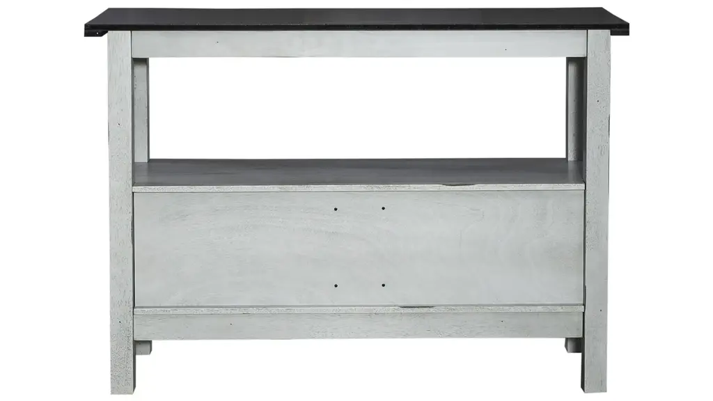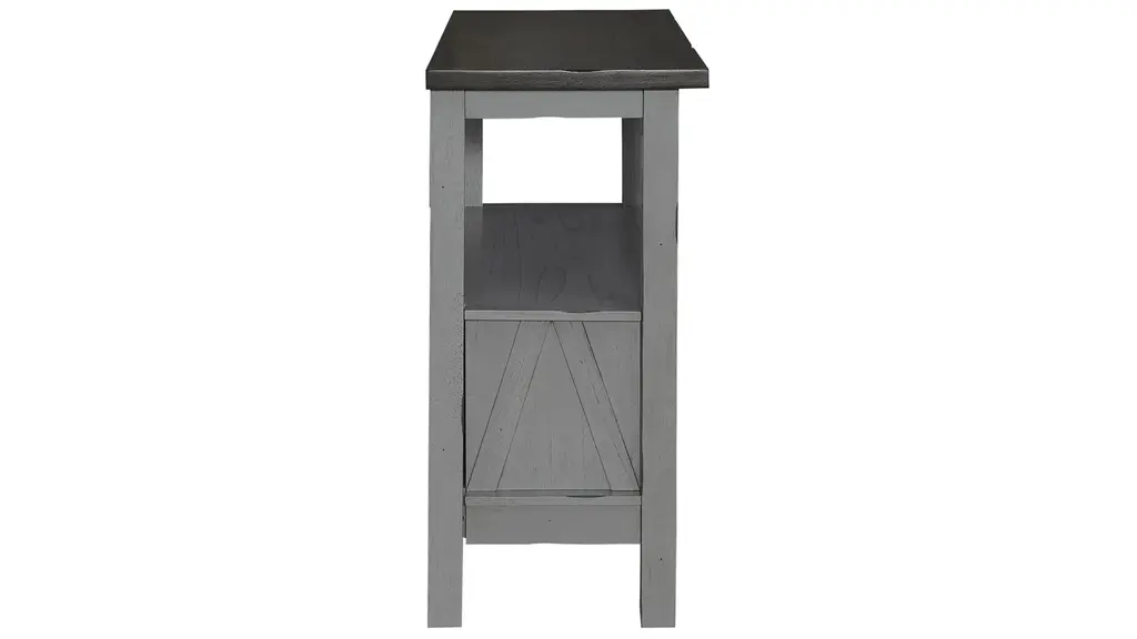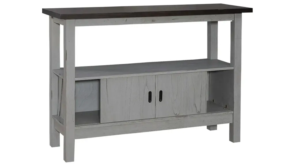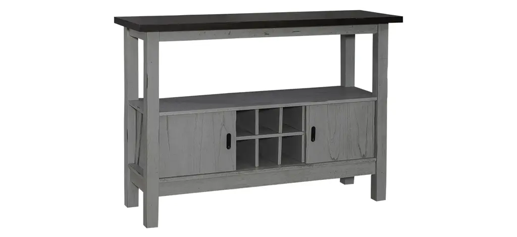 Feel at home with the Newport Server. Crafted with excellence using rubberwood solids and mindy veneers, this server features a Smokey Grey finish with a Carbon Grey top. There are two sliding doors accented with black finger groove hardware on a metal track system. A six bottle wine rack is in the center flanked by a fixed shelf on each side. There is a large open shelf that runs the length of the server that is perfect for extra storage or display items. Feel comfortable and elegant at the same time with the Newport server.
