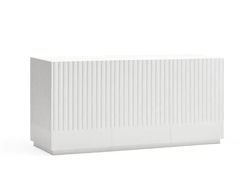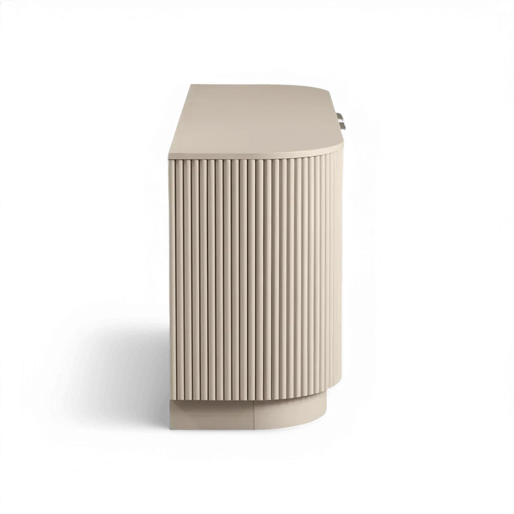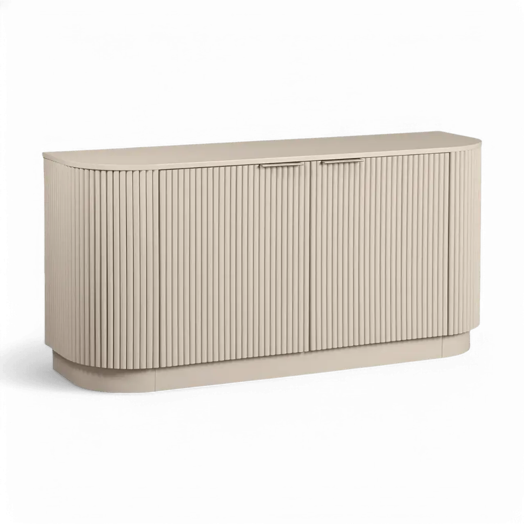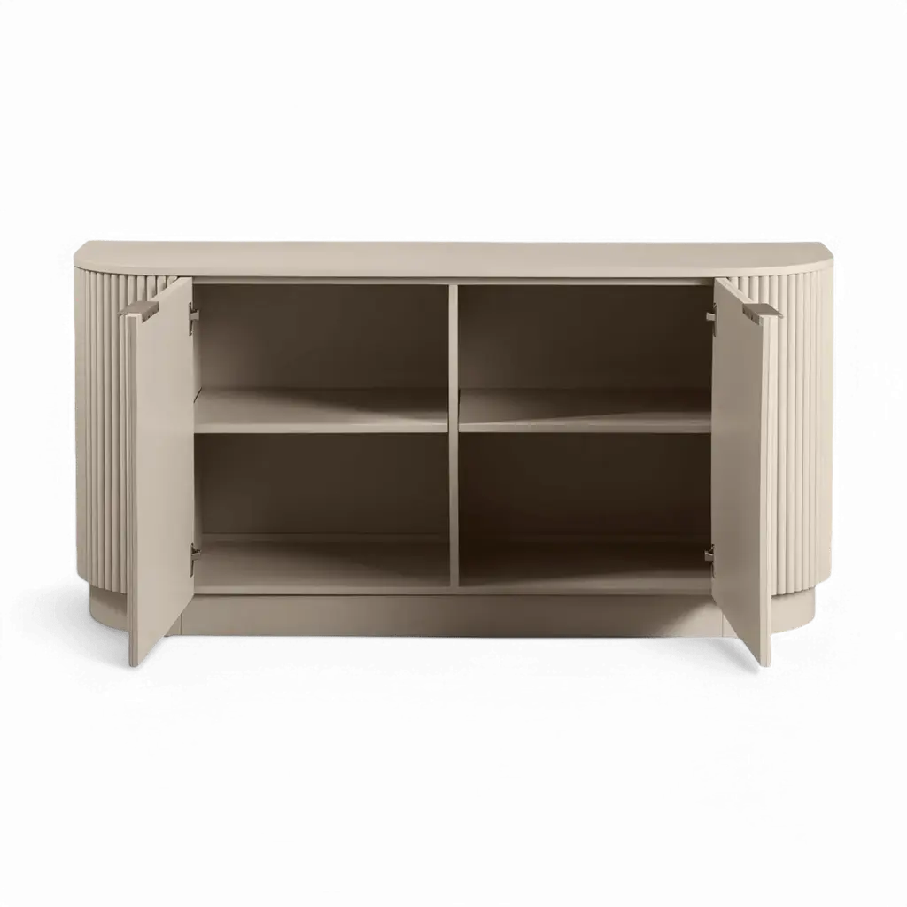 The Oxford Buffet in Alabaster is a stylish and functional storage solution that combines contemporary elegance with practical design. Finished in a sophisticated alabaster color, it showcases a neutral palette that complements a variety of interior styles. The buffet's softly rounded sides add a touch of refinement, creating a smooth silhouette that blends seamlessly into any space. The standout feature is the vertical slat wood detailing on the sides and doors, lending texture and visual interest to its clean, modern lines. With its thoughtful design and versatile aesthetic, the Oxford Buffet Alabaster is perfect for storing and displaying essentials in dining rooms, living spaces, or entryways. Also avaiable in Greige Oak and Black Wood.Top Finish: MDF | Inner Frame Material: Rubberwood | Base Material: Rubberwood