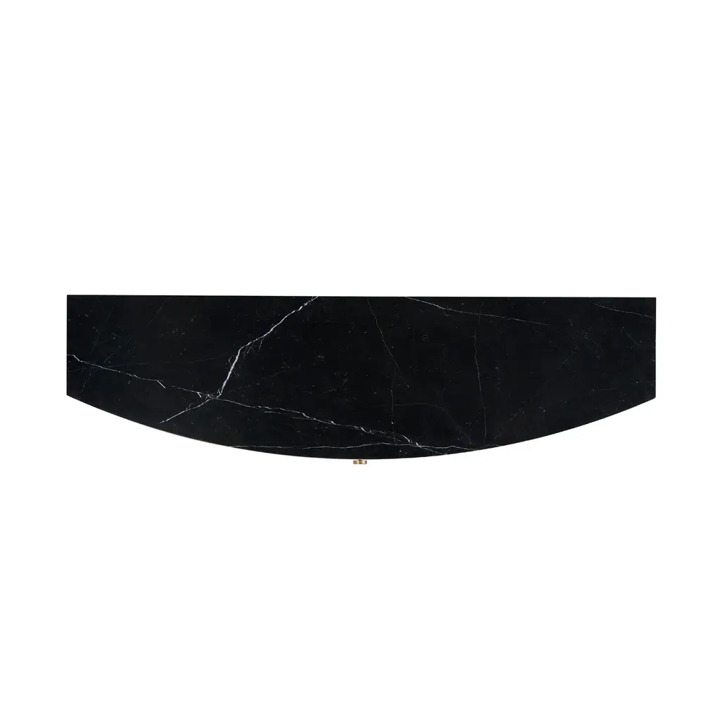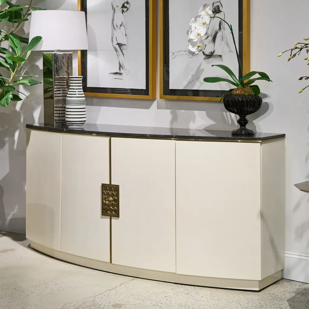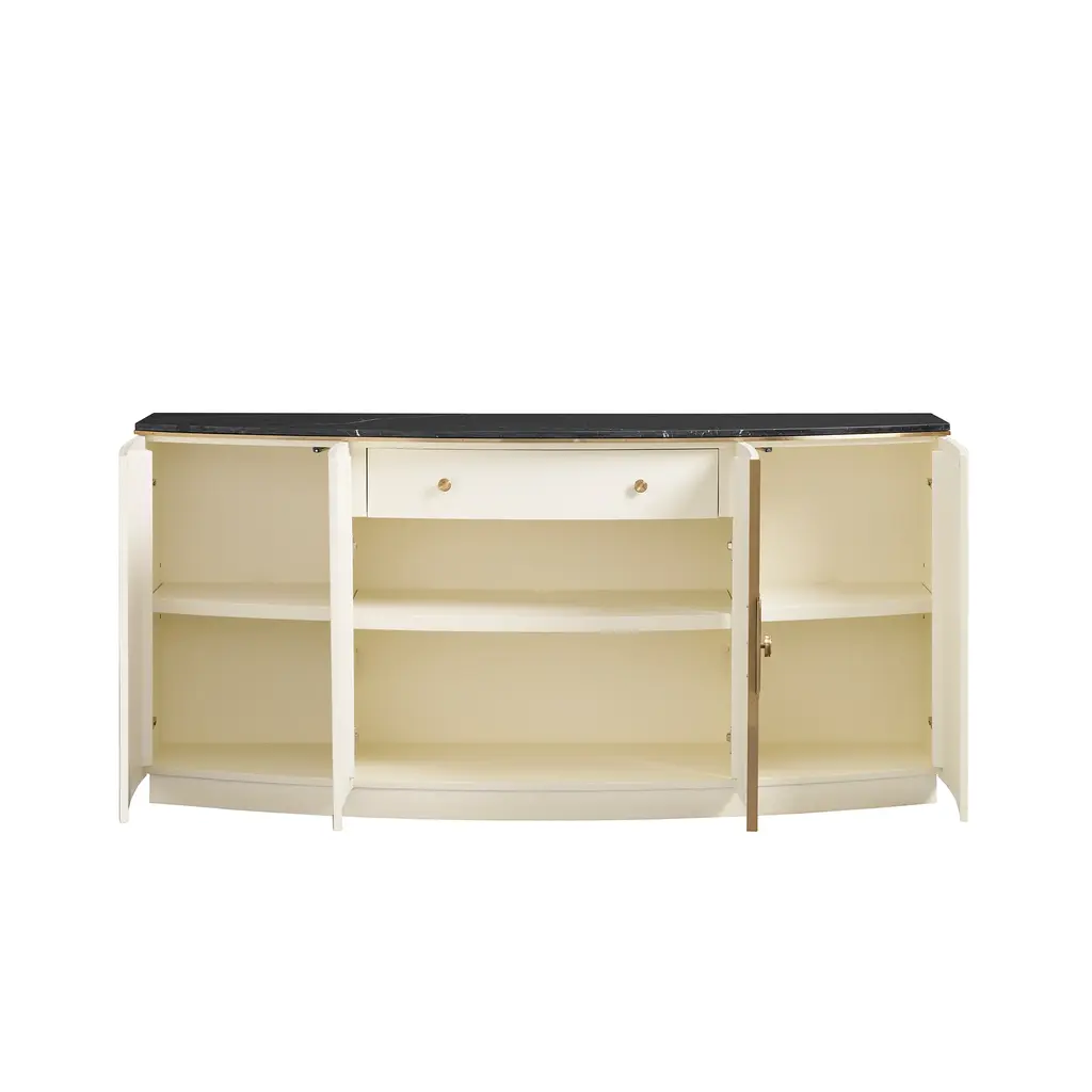 An elegant spin on a contemporary shape, the Paulina Server features a beautiful Ivory Faux Vellum finish and Black Nero Marquina top. Paired with the intricate brass hardware and accents, this statement piece makes a wonderful addition to hallways, living spaces, and dining rooms alike. Arrange fresh florals atop it to add extra warmth, or an assortment of abstract art pieces and sculptures to elevate it's contemporary style. It's four doors contain six shelves and a hidden drawer. Ships In 4-5 Weeks Brass hardware and accents Black Nero Marguina Marble top Ivory Faux Vellum Rounded front This image is for illustrative purposes only. The colors shown are accurate within the constraints of lighting, photography, and the color accuracy of your screen.