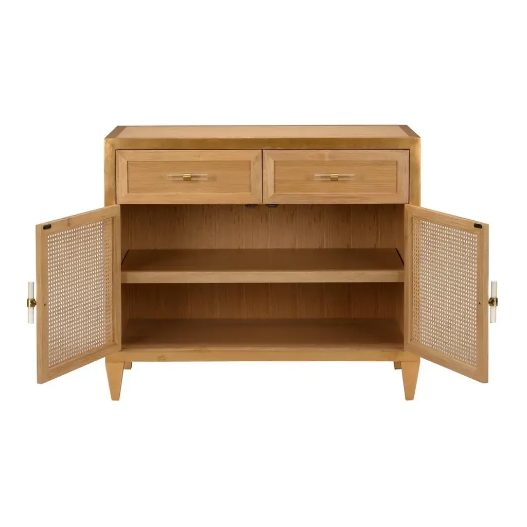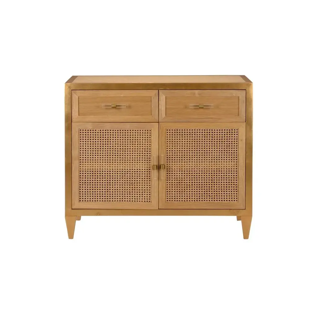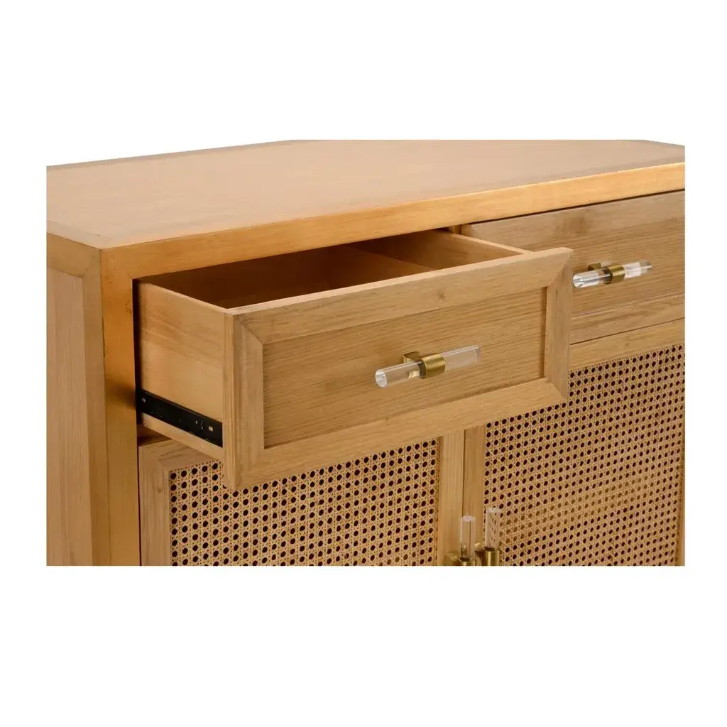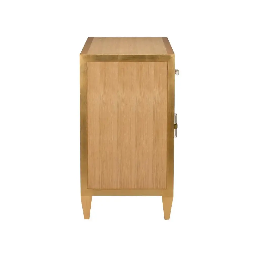 Warm and sophisticated, the Petite Caned Buffet designed by Kristi Nelson, features natural oak wood highlighted with subtle gold leaf accents and finished with acrylic and brass hardware and rich caned front panels. The result is a tailored, organic vibe that offers beautiful storage and functionality. Not intended for clothing storage.