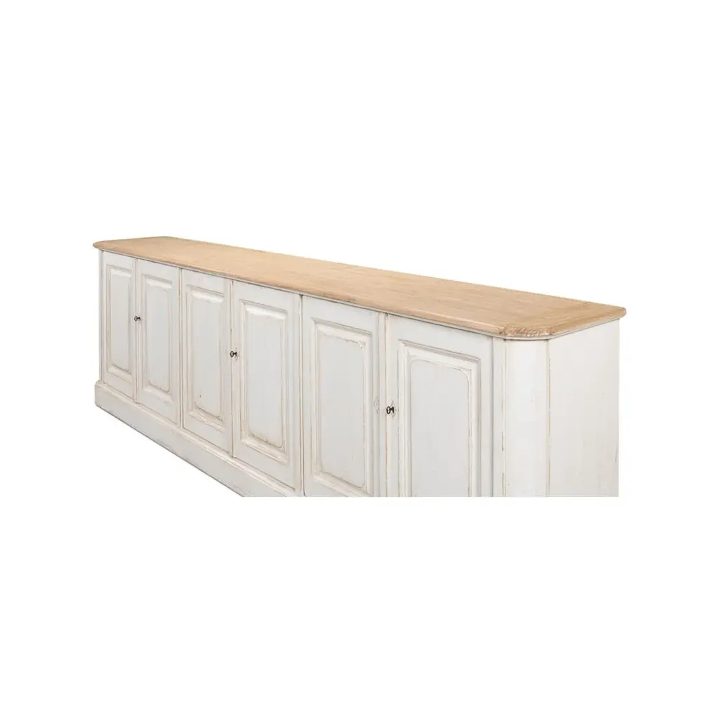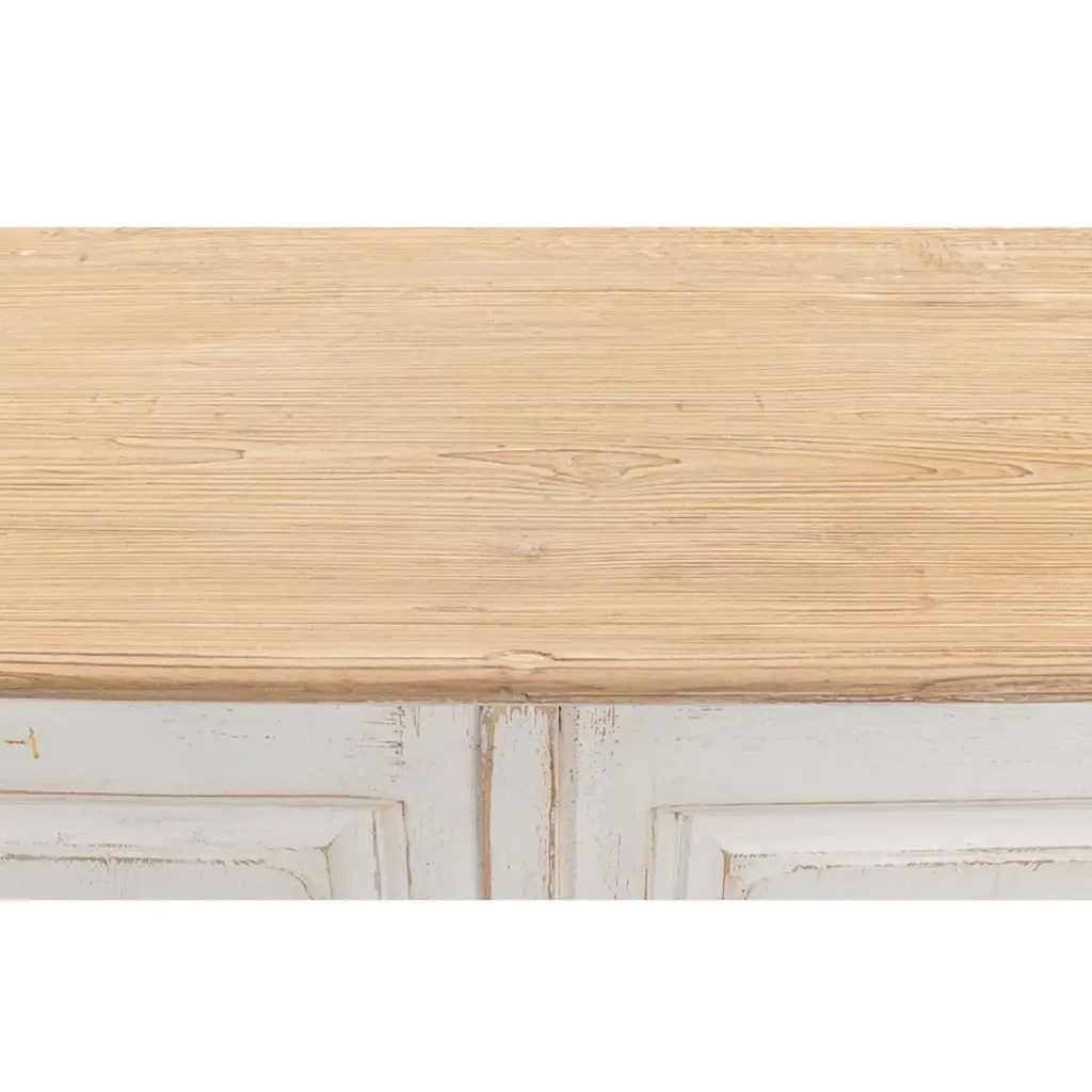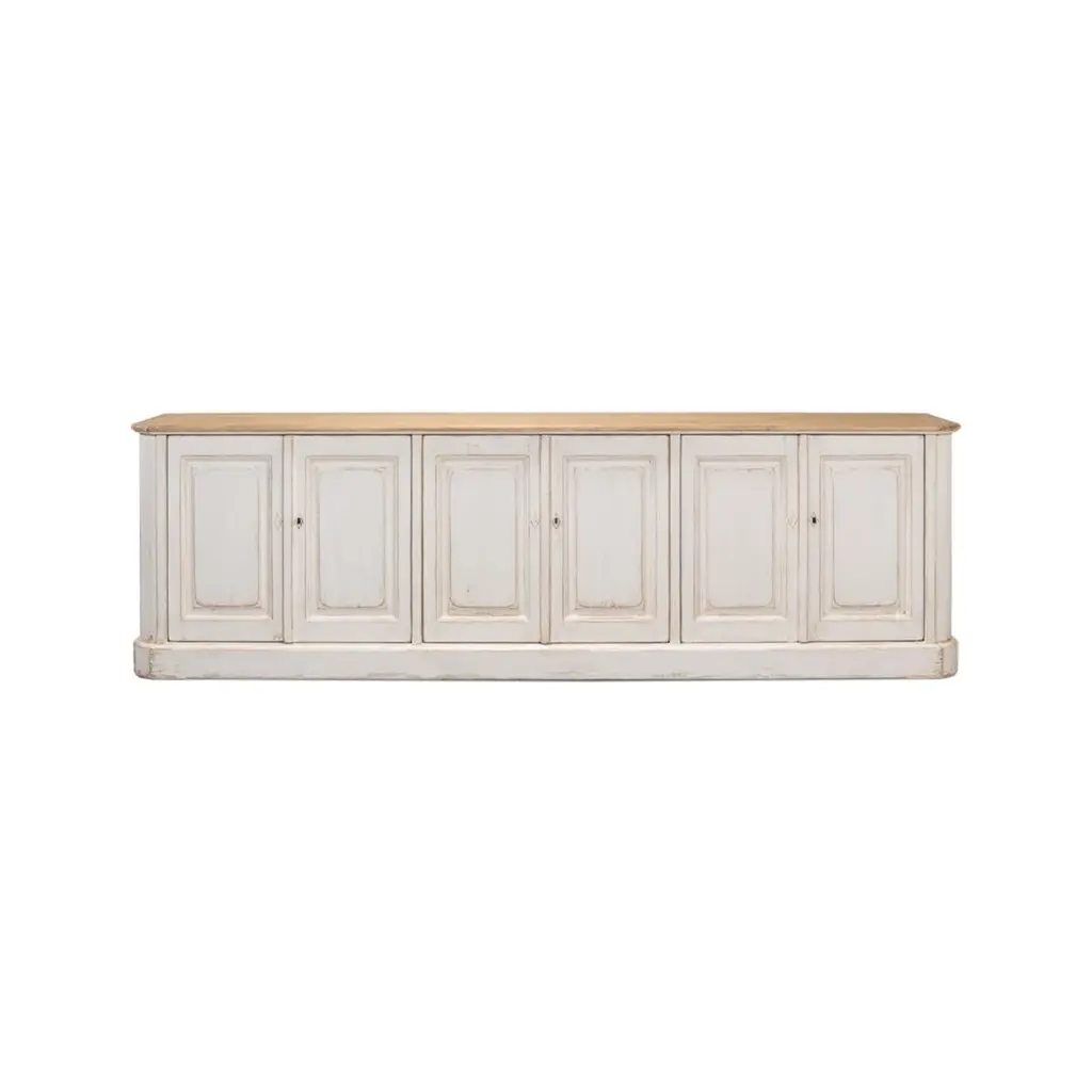 Made with reclaimed pine. The six-door long sideboard buffet is painted in an antiqued rustic whitewash paint and has a natural pine top with a molded edge. The painted interior has removable shelves.Dimensions: 119" W x 20" D x 36" H