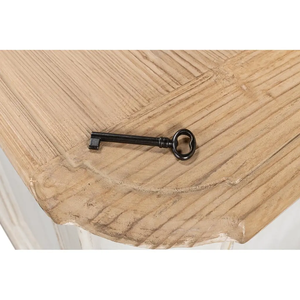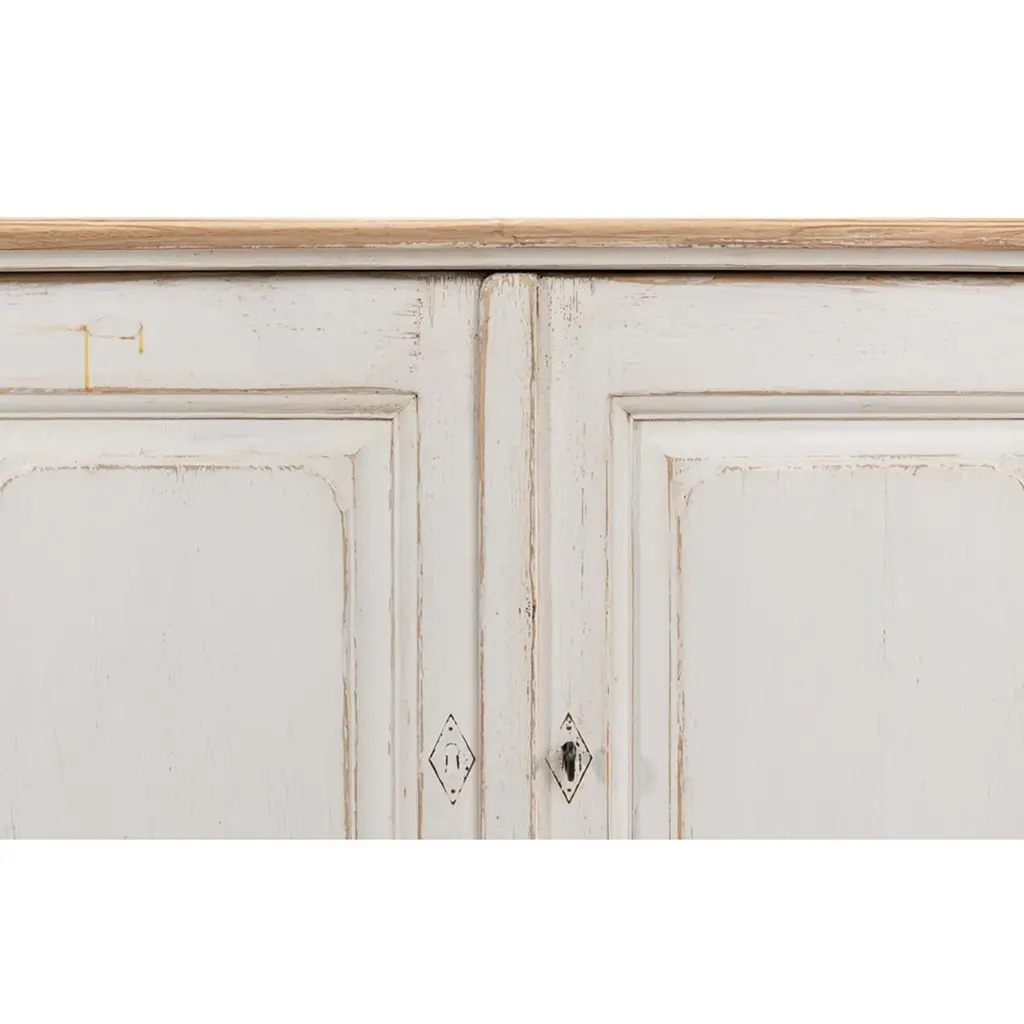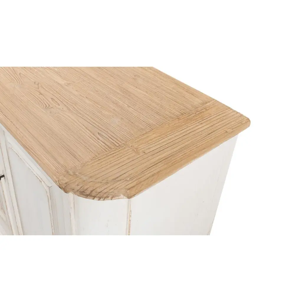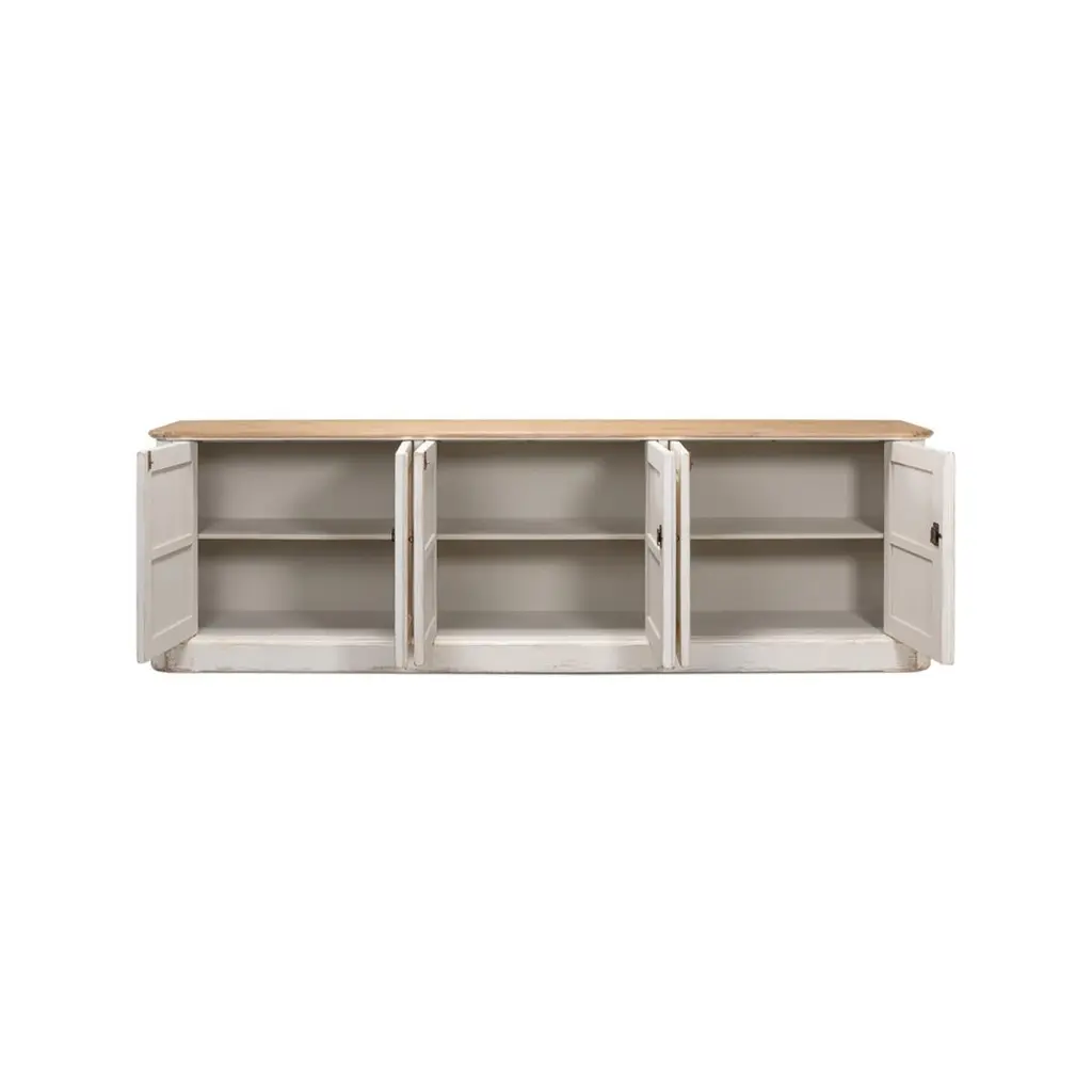 Made with reclaimed pine. The six-door long sideboard buffet is painted in an antiqued rustic whitewash paint and has a natural pine top with a molded edge. The painted interior has removable shelves.Dimensions: 119" W x 20" D x 36" H