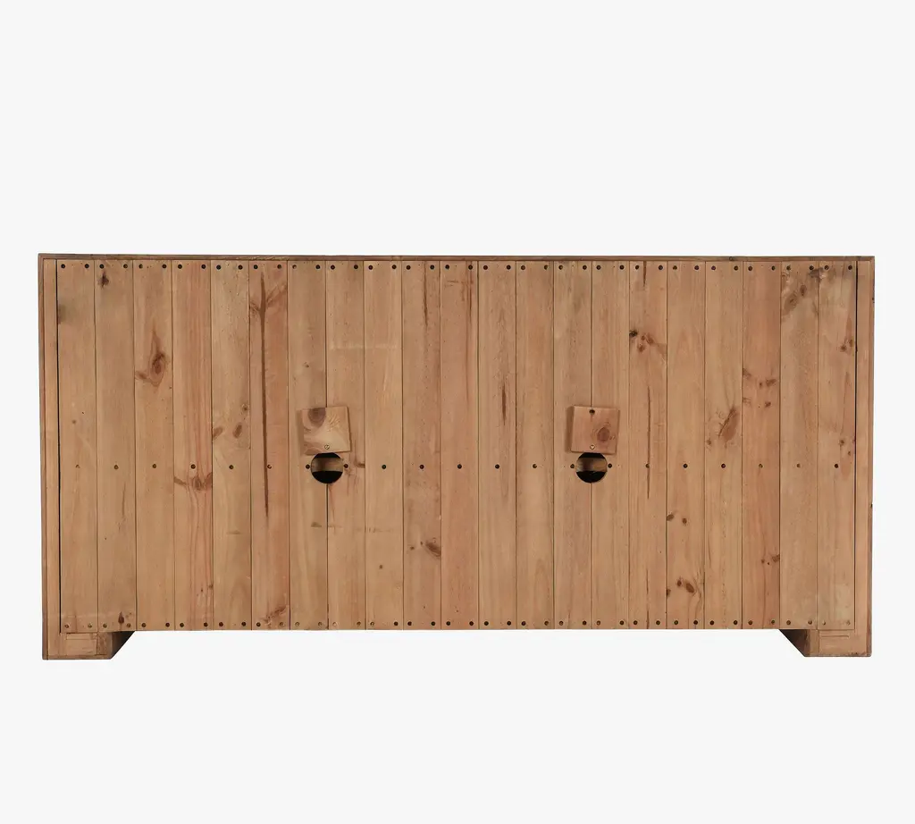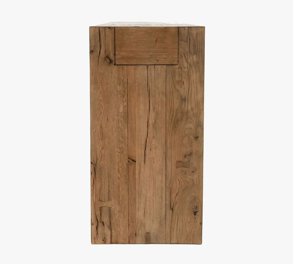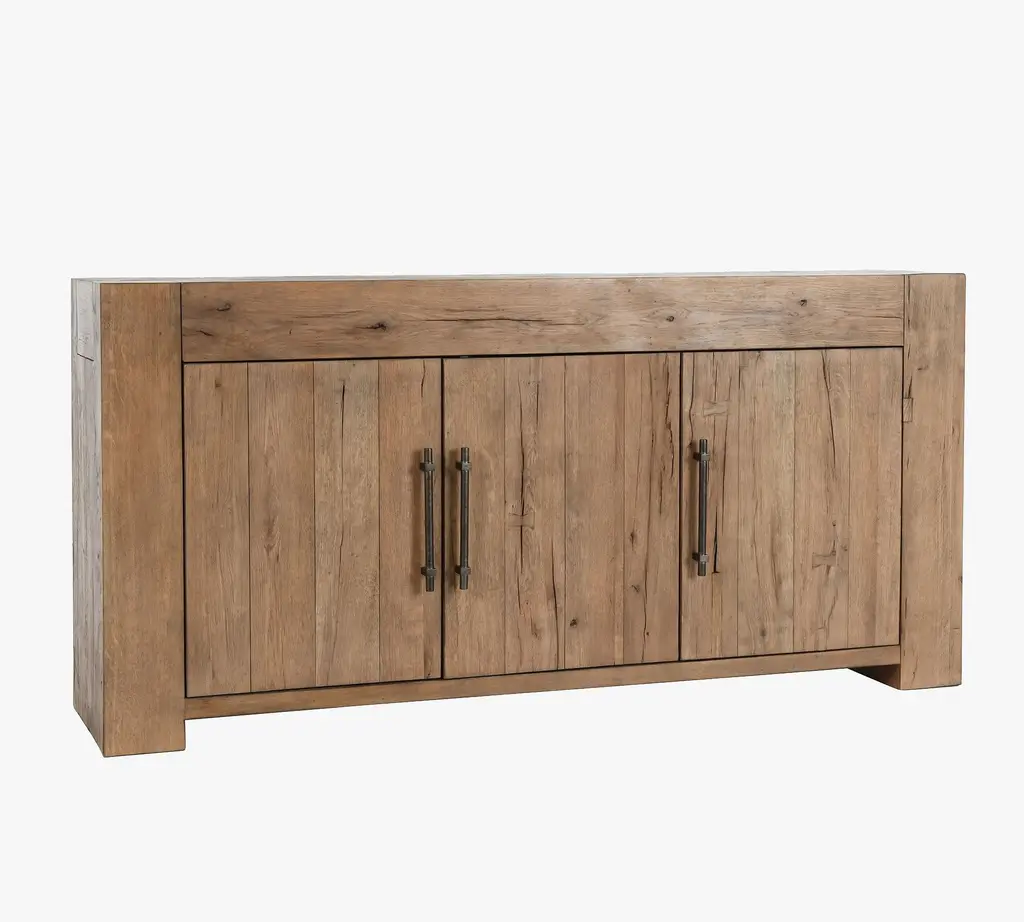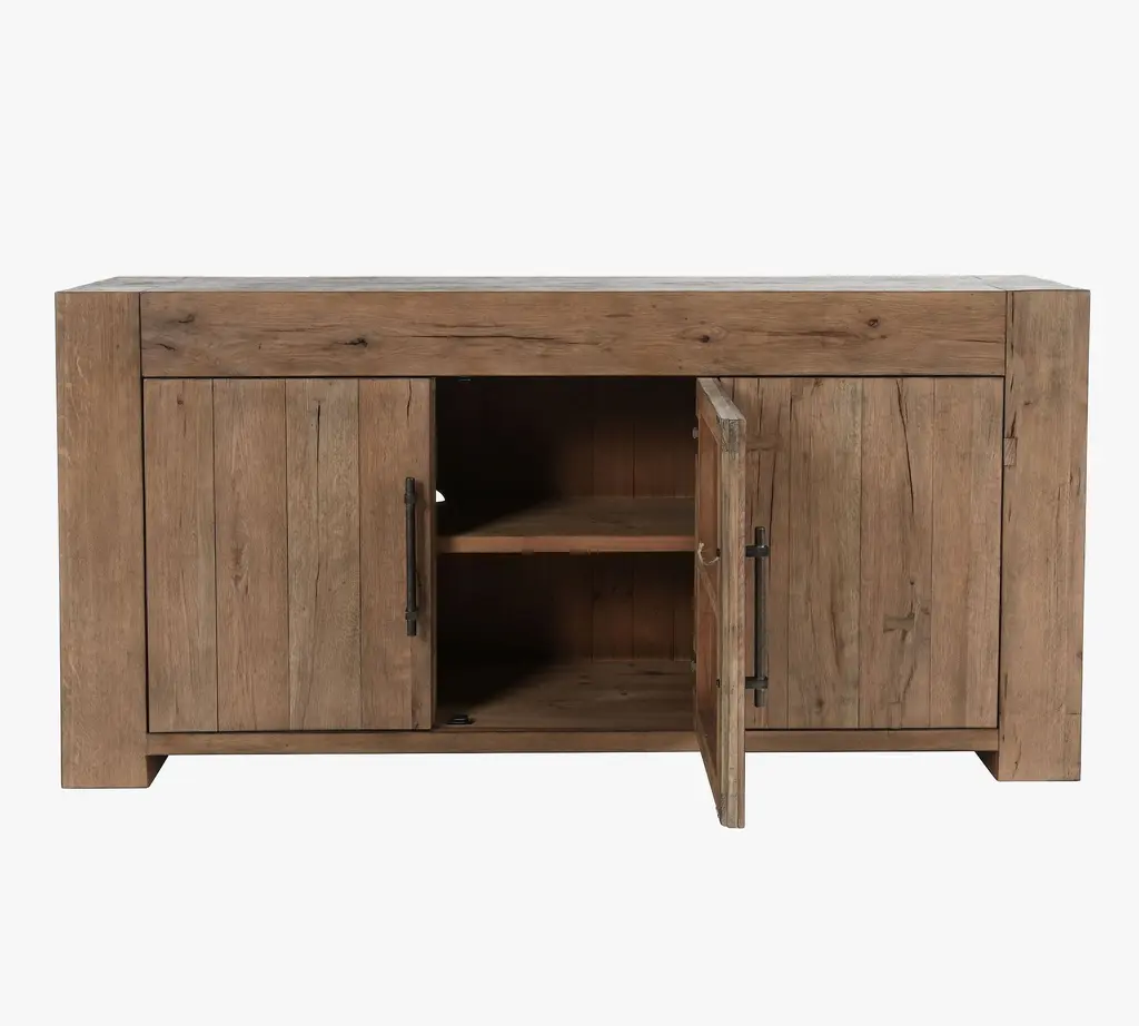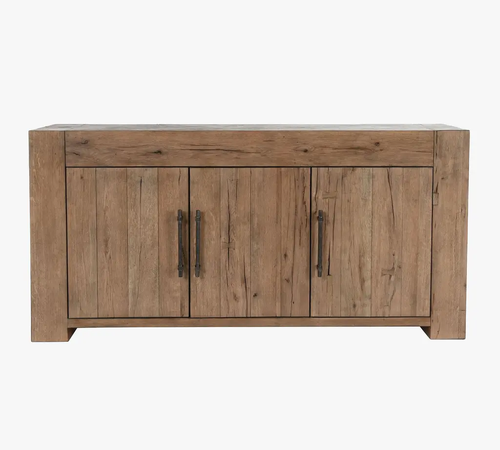 Crafted with reclaimed oak wood and designed in the spirit of oversized dovetail joinery, the Raymond Collection is a salute to traditional craftsmanship. Each piece of recycled lumber is selected for its rugged beauty; unique variations in tone and texture should be expected (and embraced). The buffet offers plenty of storage room for dinnerware and glassware, as well as a broad surface for serving and displaying.