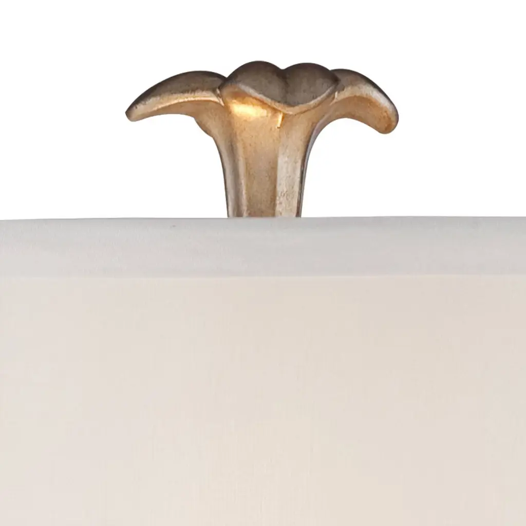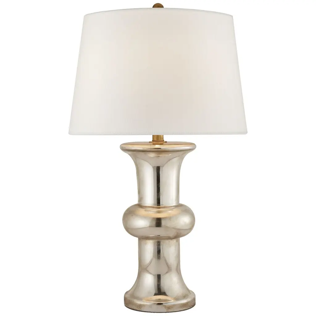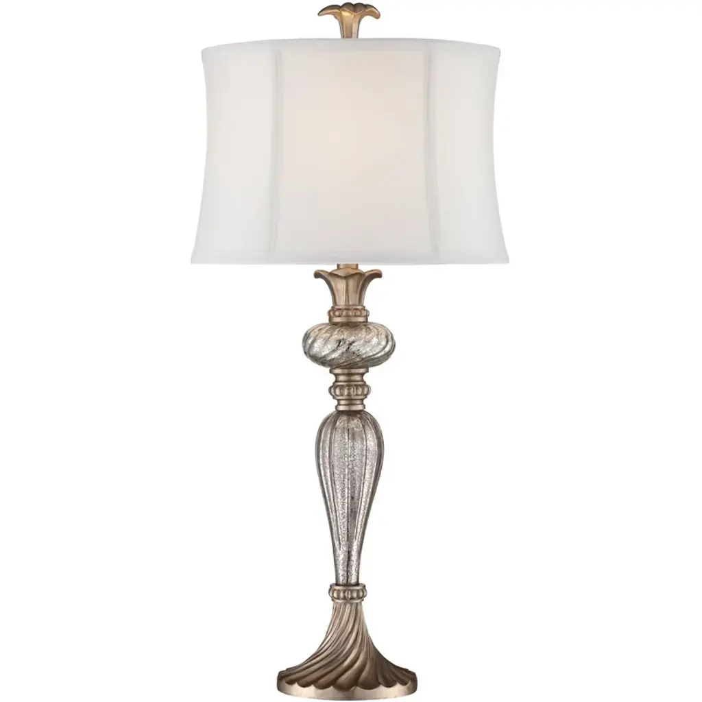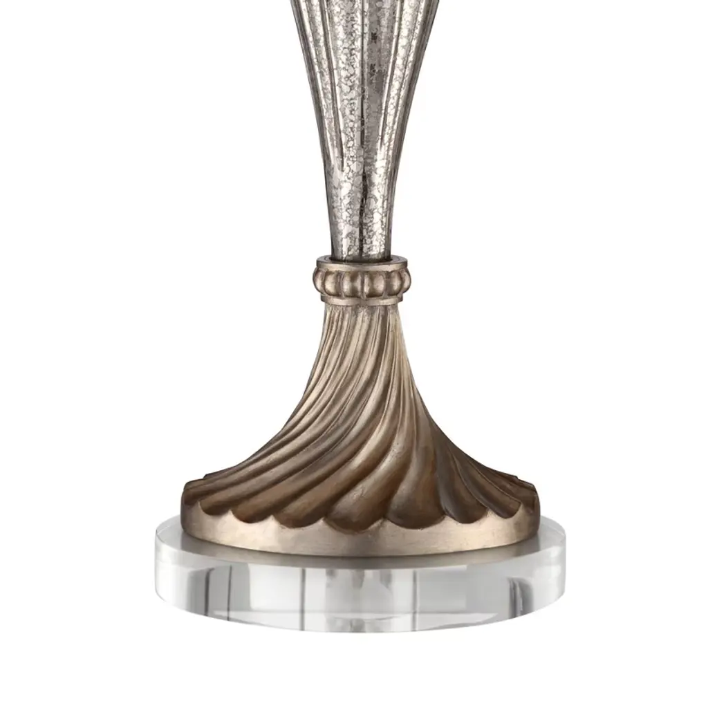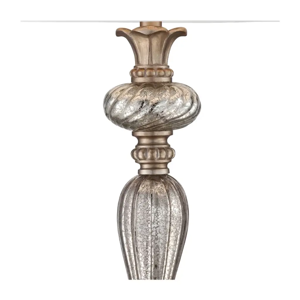 Create a chic and luxurious space with this mercury glass table lamp with 7" wide round riser. Adorned with a silver champagne finish that pairs beautifully with a bright white lamp shade.