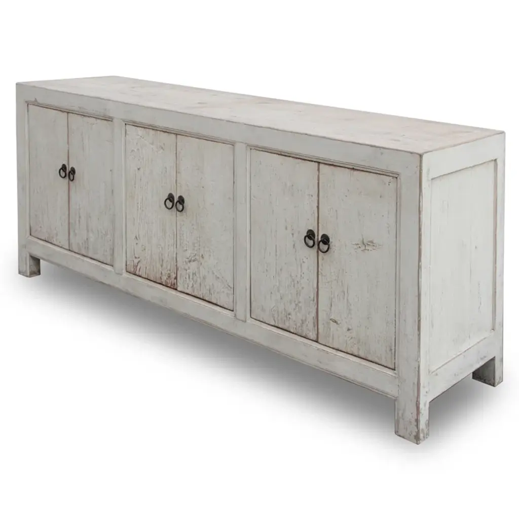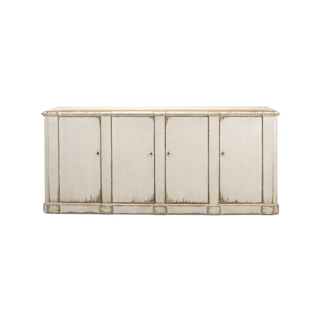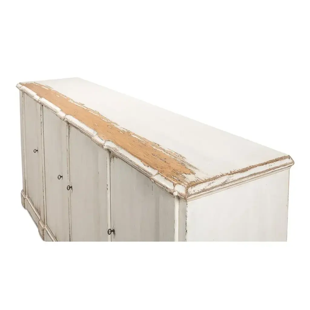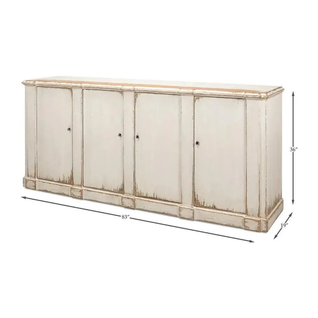 This piece captures the romantic essence of country style with its distressed white finish and vintage charm. The sideboard's generous length, accented by four doors that open to a fitted interior with removable shelves, offers substantial storage space, perfect for keeping dining essentials or living room items neatly organized. The worn edges and rustic patina of the highly distressed finish invite a sense of nostalgia, making this sideboard not just a piece of furniture, but a storyteller in your home. Dimensions: 83" W x 19" D x 36" H