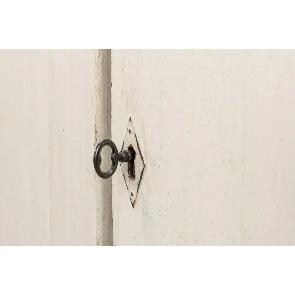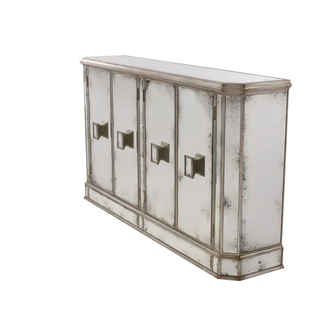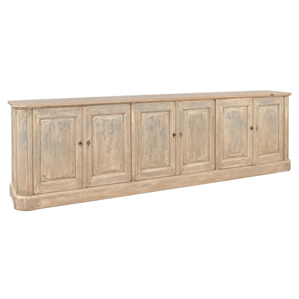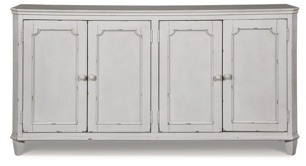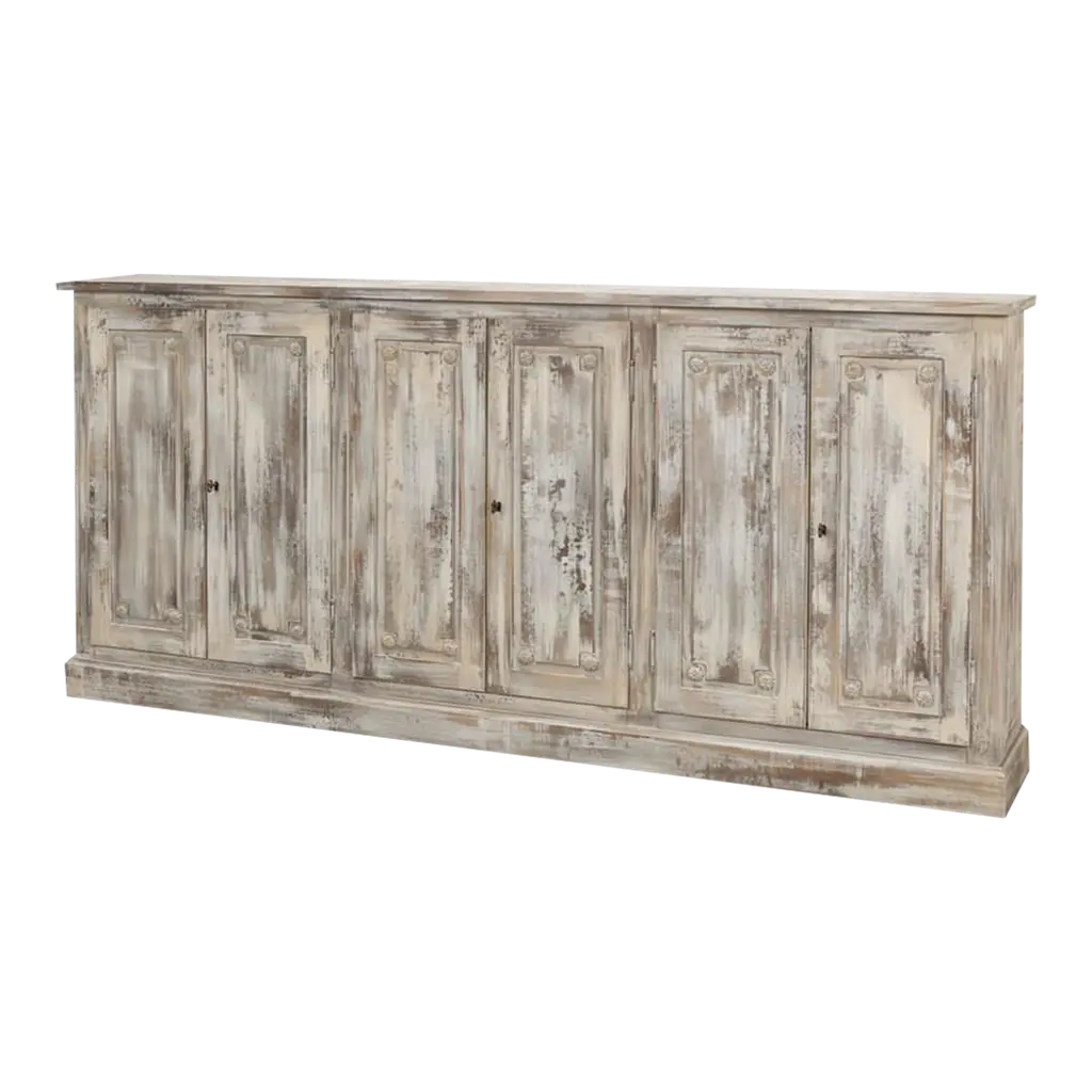 This piece captures the romantic essence of country style with its distressed white finish and vintage charm. The sideboard's generous length, accented by four doors that open to a fitted interior with removable shelves, offers substantial storage space, perfect for keeping dining essentials or living room items neatly organized. The worn edges and rustic patina of the highly distressed finish invite a sense of nostalgia, making this sideboard not just a piece of furniture, but a storyteller in your home. Dimensions: 83" W x 19" D x 36" H