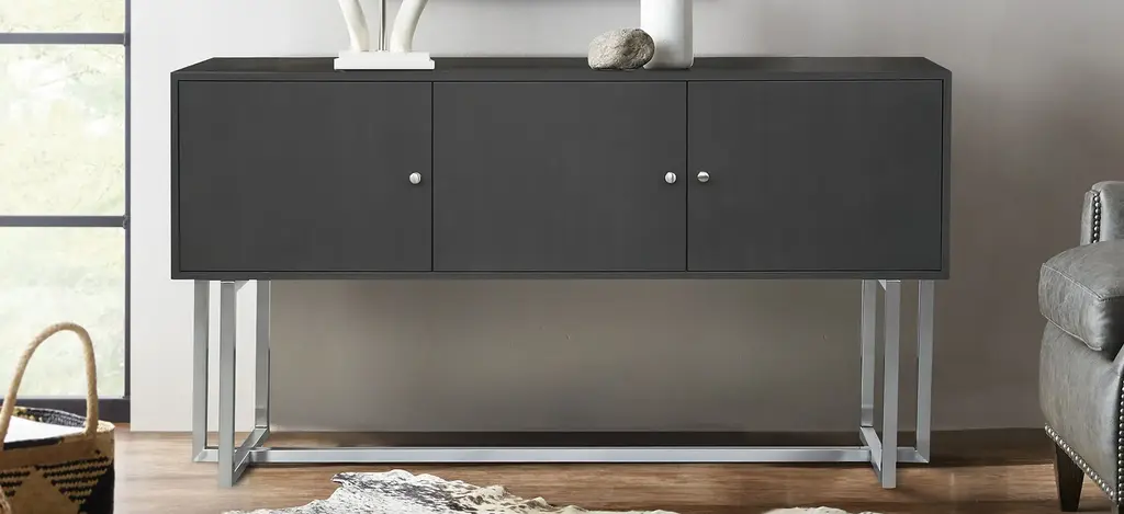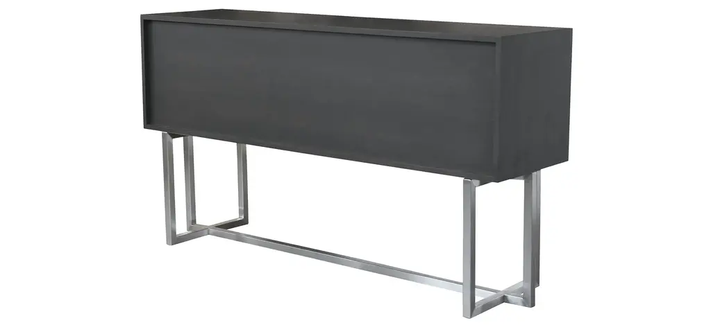The Samson buffet is perfect for the modern household. Not just an ordinary buffet, the Samson combines elegant brushed stainless steel finish cross legs with a practical top design ideally suited for the living room, but functional in just about any room of the house. Featuring a two door and a single door cabinet, the Samson offers the perfect storage space solution for books, magazines, and other unnecessary clutter. The cabinet nobs are made of the same metal material as the Samson's legs, assuring aesthetic cohesion and a truly chic contemporary experience.