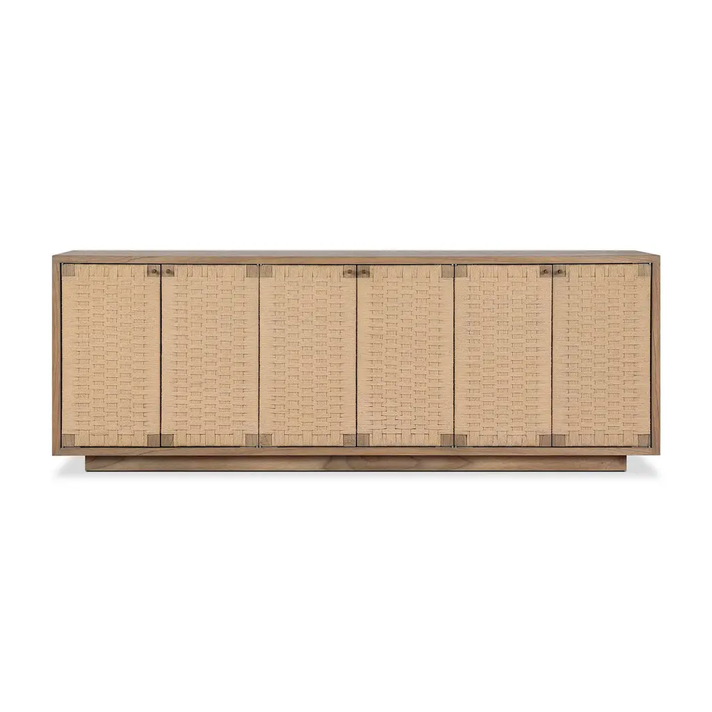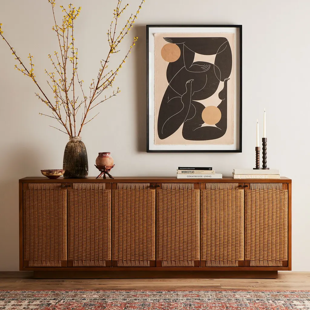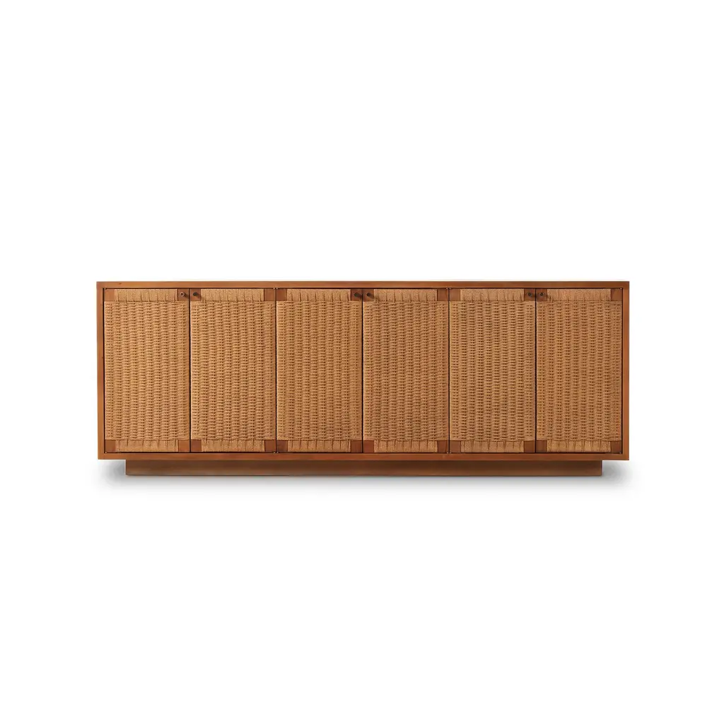 The blend of Danish and mid-century design inspiration. Sits atop a plinth-style base. Its woven paper cord door fronts add lovely texture. Rear cutouts make cord management simple.