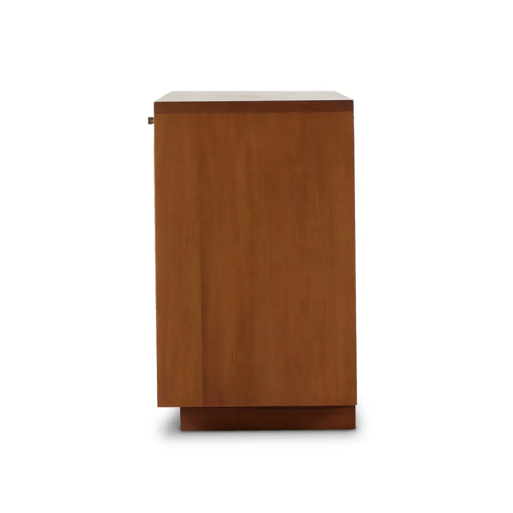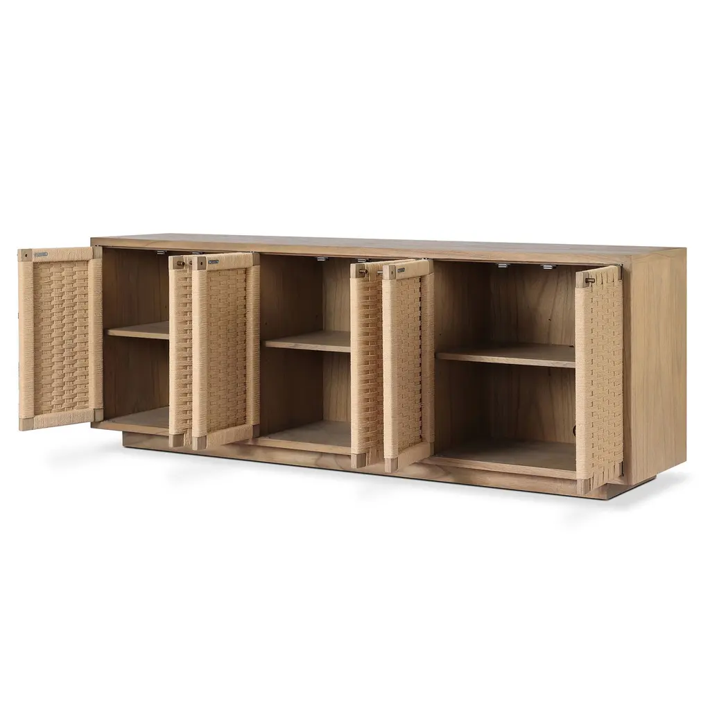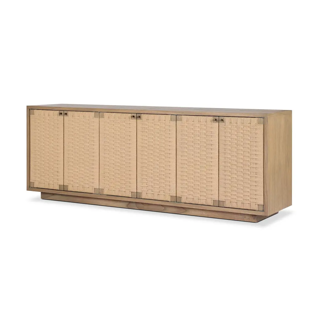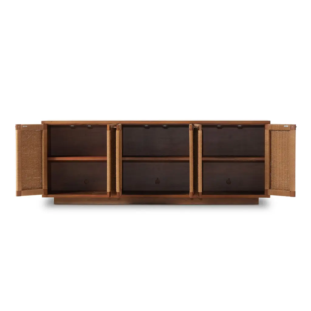The blend of Danish and mid-century design inspiration. Sits atop a plinth-style base. Its woven paper cord door fronts add lovely texture. Rear cutouts make cord management simple.