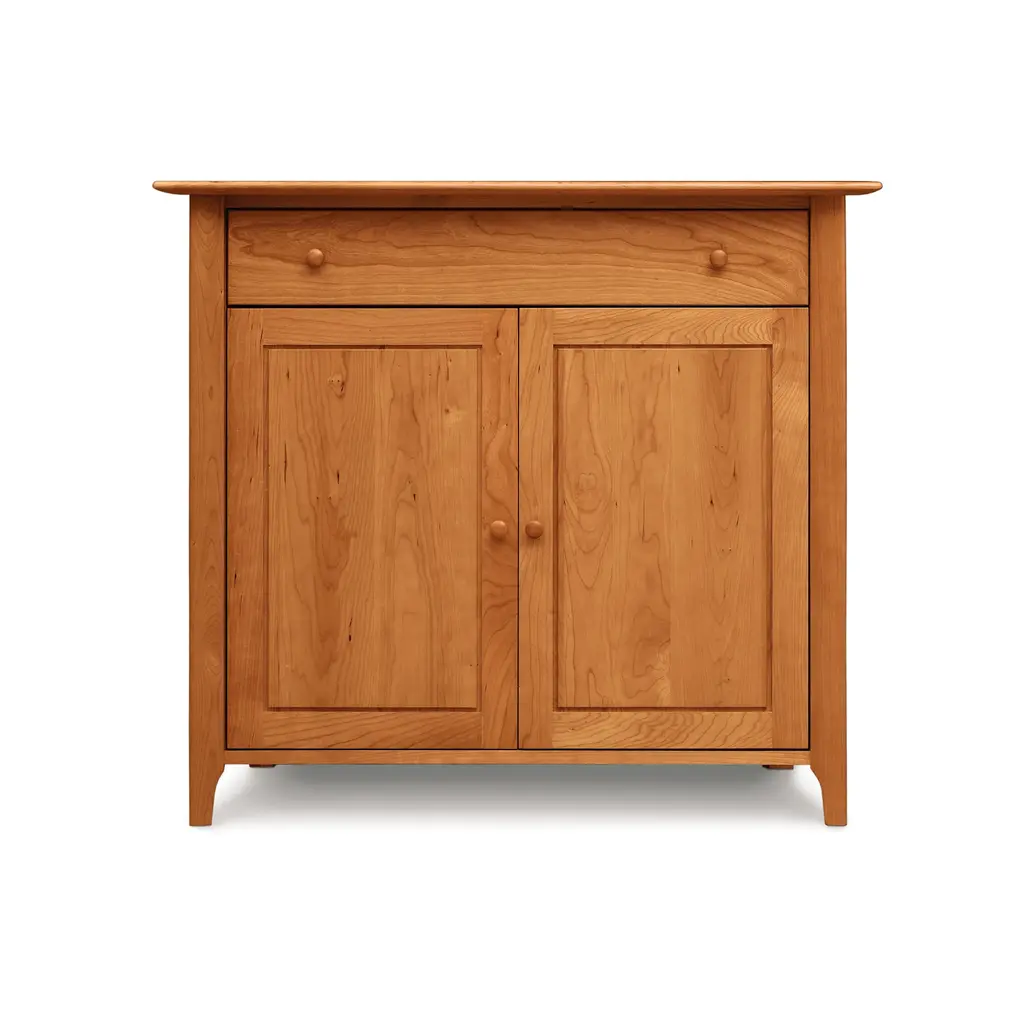 Copeland's luxury Sarah Shaker 2 Door, 1 Drawer Small Buffet with adjustable interior shelves and removable silverware tray with Guardian Anti Tarnish lining and cloth for the drawer.The Sarah Shaker Collection is real solid wood fine dining furniture crafted for generations of service in your natural home. Handmade to order so you can customize online in your favorite finish. Best in its class of authentic custom fine dining furniture, this small buffet is destined to be a cherished family heirloom!Clean, simple and natural design characterizes this elegant buffet which features the traditional flat panel doors, reverse bevel tops and round button pulls of the Shaker period. Construction details include solid wood frame and panel structural design, solid wood top, 1/4" top-grade veneer panels integrated into the case sides and back, fully finished solid wood drawer boxes with solid wood drawer fronts/sides/backs, asymmetrical English dovetails and adjustable two glide wooden spring-loaded drawer slides for sturdy, smooth operation. USA made in VT.Base price represents buffet in natural cherryShown in natural cherryMatching furniture available in our Sarah Shaker Furniture Collection Natural variations in solid wood and hand applied finishes make each piece unique. Slight grain and finish irregularities tell you that the furniture has been crafted from solid wood and are considered hallmarks of quality.