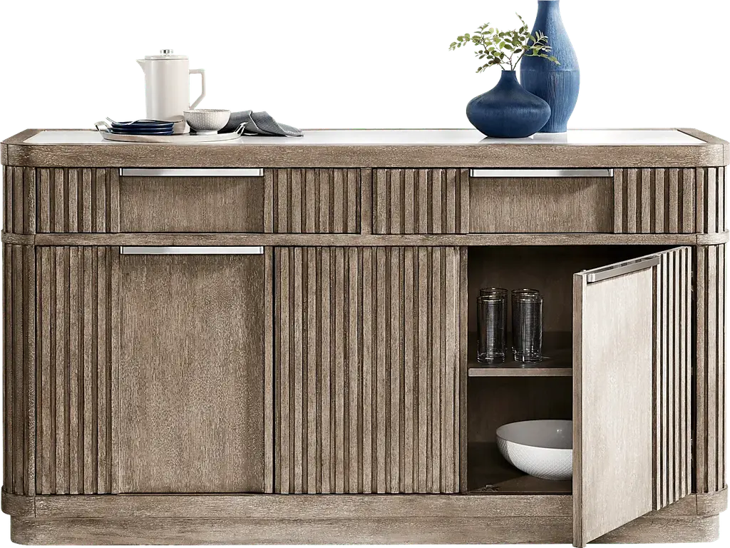 Boldly confident with a gentle touch of softness, the Sausalito buffet from Drew and Jonathan punctuates the day with a quiet double-take at its red carpet-worthy looks. Contemporary in style, this piece's commanding silhouette is crafted with oak veneers while the channeled detailing and recessed door embellishments add visually provocative contours. The drawers are constructed of French joints on front and English on back, complimented by ball bearing glides with full extension for ease of opening and maximum use of the available space. Hidden behind its doors is a space to store wine as well as shelves that offer plenty of room for necessities. Metal pulls add a unique contrast while a stone inlay on top provides the final, authoritative detail.