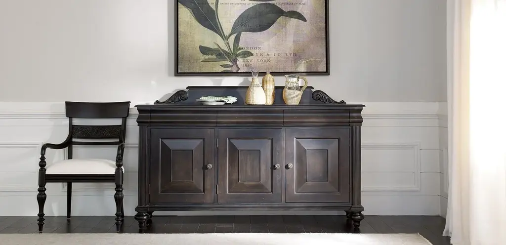 Handcrafted in our American workshops. Well-crafted and handsome, this beautiful Saxton buffet is the epitome of elegance and grace. It has wide beveled doors, impressive turned feet, and delicately beaded moldings. With a detachable carved back panel for optional use.