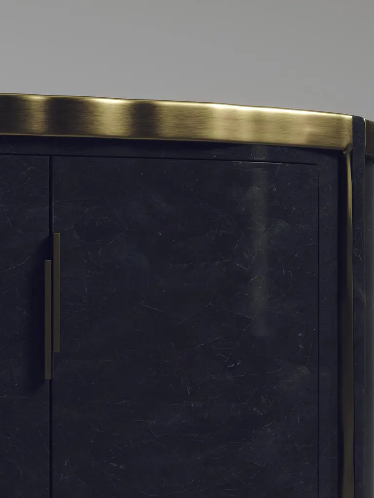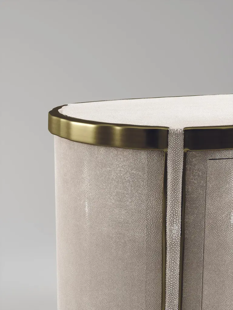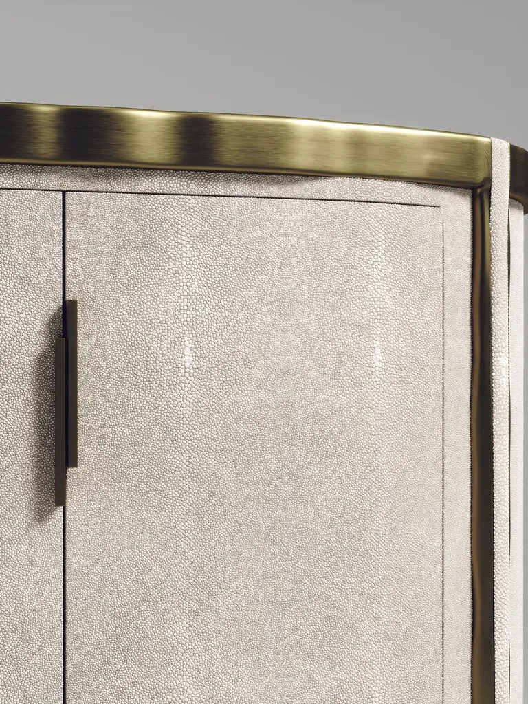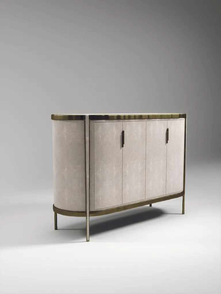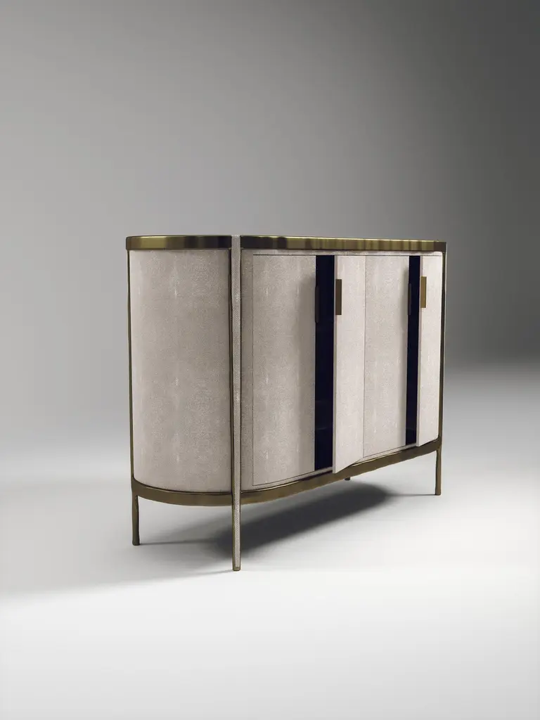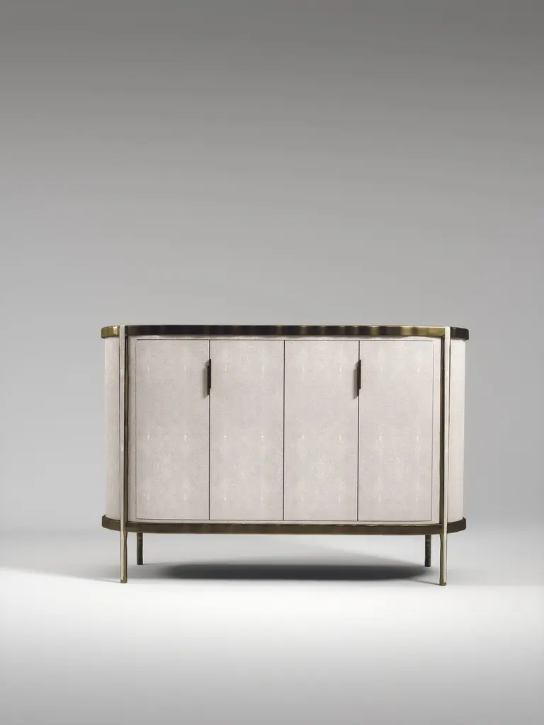 The Paris based label has distinguished themselves since their launch, with their iconic use of shagreen mixed with brass and other exotic materials. All furniture is handcrafted by skilled artisans, ultimately making each piece unique, designed in Paris and produced in the Philippines.The Melting Buffet by R&Y Augousti is an elegant piece for any space. The cream shagreen inlaid piece is classic, but accentuated by their signature organic melting bronze-patina brass frame. This credenza includes 4 doors that opens up to 3 shelves. This piece is part of the Melting Capsule, see images at end of slide of the collection. Available in other finishes, see images at end of slide. Custom sizing / finishing available in requestMeasures: 150 x 40 x 85 cm All R & Y Augousti pieces are handmade by artisans, ultimately making each piece unique. Custom color/sizing available on request. Wipe clean with soft dry cloth.Acclaimed design duo Ria & Yiouri Augousti have established themselves since the 1990s as pioneers of modern-vintage style through their luxurious Art Deco inspired collections.The Paris based label has distinguished themselves since their launch, with their iconic use of shagreen mixed with brass and other exotic materials. All furniture is handcrafted by skilled artisans, ultimately making each piece unique. All shagreen-covered items should be kept out of direct sunlight, color variants may occur on the stingray and other exotic finishes, but this showcases the Parisian label's commitment to creating authentic luxurious products using natural components.