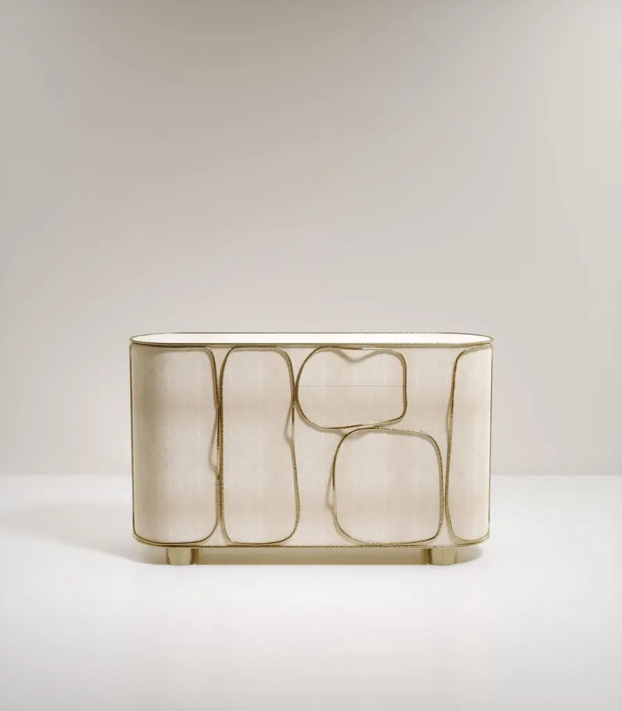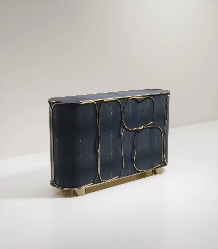 The Paris based label has distinguished themselves since their launch, with their iconic use of shagreen mixed with brass and other exotic materials. All furniture is handcrafted by skilled artisans, ultimately making each piece unique, designed in Paris and produced in the Philippines.The Arianne Buffet by R&Y Augousti is one of a kind statement piece. The overall piece is inlaid in a denim blue shagreen accentuated with intricate bronze-patina brass details that have the signature Augousti "melting" effect. The interior of the piece is in wood veneer and opens with various compartments & drawers like a "cabinet of curiosities". This piece is part of the Arianne Capsule, see images at end of slide of the collection. Available in other finishes, see images at end of slide. Custom sizing / finishing available in requestMeasures: 183 x 53 x 110.75 cm All R & Y Augousti pieces are handmade by artisans, ultimately making each piece unique. Custom color/sizing available on request. Wipe clean with soft dry cloth.Acclaimed design duo Ria & Yiouri Augousti have established themselves since the 1990s as pioneers of modern-vintage style through their luxurious Art Deco inspired collections.The Paris based label has distinguished themselves since their launch, with their iconic use of shagreen mixed with brass and other exotic materials. All furniture is handcrafted by skilled artisans, ultimately making each piece unique. All shagreen-covered items should be kept out of direct sunlight, color variants may occur on the stingray and other exotic finishes, but this showcases the Parisian label's commitment to creating authentic luxurious products using natural components.