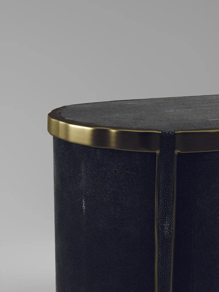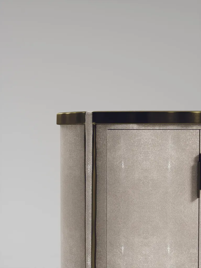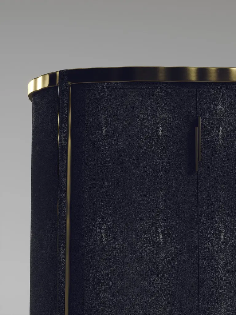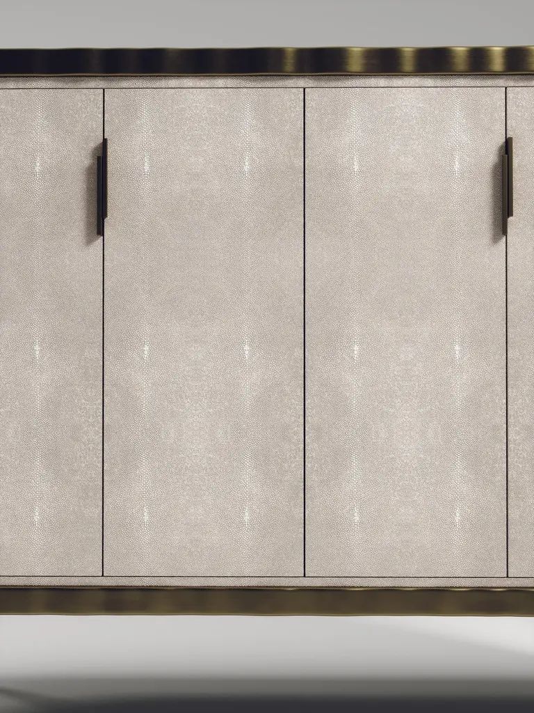 The Paris based label has distinguished themselves since their launch, with their iconic use of shagreen mixed with brass and other exotic materials. All furniture is handcrafted by skilled artisans, ultimately making each piece unique, designed in Paris and produced in the Philippines.The Melting Buffet by R&Y Augousti is an elegant piece for any space. The black pen shell inlaid piece is classic, but accentuated by their signature organic melting bronze-patina brass frame. This credenza includes 4 doors that opens up to 3 shelves. This piece is part of the Melting Capsule, see images at end of slide of the collection. Available in other finishes, see images at end of slide. Custom sizing / finishing available in requestMeasures: 150 x 40 x 85 cm All R & Y Augousti pieces are handmade by artisans, ultimately making each piece unique. Custom color/sizing available on request. Wipe clean with soft dry cloth.Acclaimed design duo Ria & Yiouri Augousti have established themselves since the 1990s as pioneers of modern-vintage style through their luxurious Art Deco inspired collections.The Paris based label has distinguished themselves since their launch, with their iconic use of shagreen mixed with brass and other exotic materials. All furniture is handcrafted by skilled artisans, ultimately making each piece unique. All shagreen-covered items should be kept out of direct sunlight, color variants may occur on the stingray and other exotic finishes, but this showcases the Parisian label's commitment to creating authentic luxurious products using natural components.