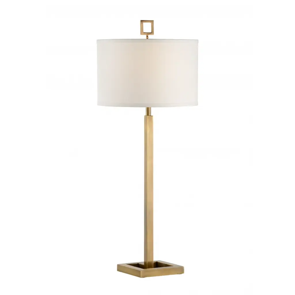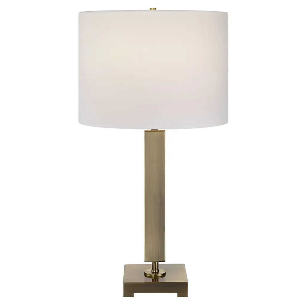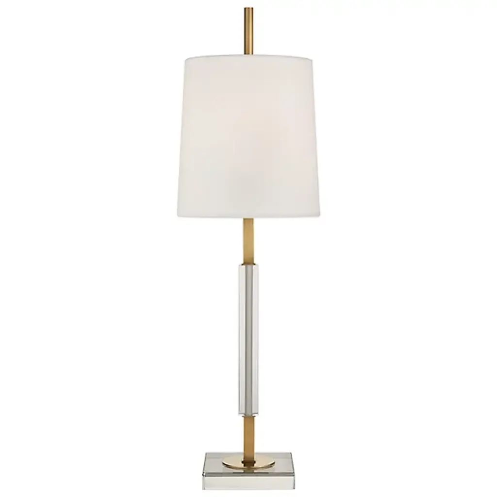 This Antique Brass Buffet Lamp by Silver Orchid adds an elegant touch to any room in your home. This buffet lamp features a slender metal body finished in antique brass, sitting atop a crystal base. A round white linen hardback shade completes the sophisticated look. Illuminate your space with the timeless elegance of the Silver Orchid Buffet Lamp. Features