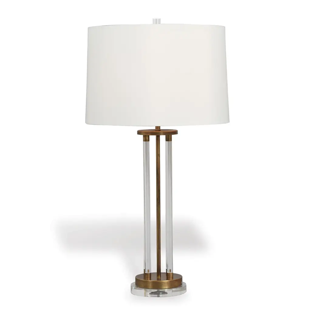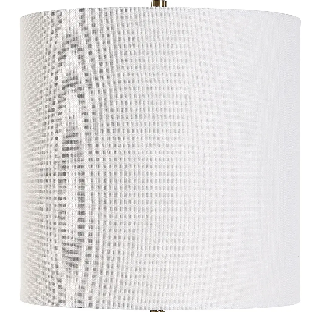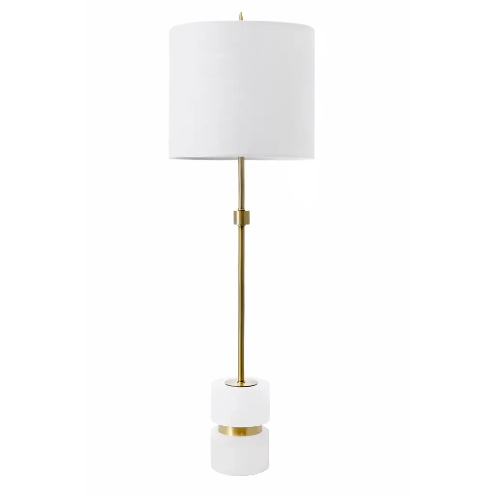 This Antique Brass Buffet Lamp by Silver Orchid adds an elegant touch to any room in your home. This buffet lamp features a slender metal body finished in antique brass, sitting atop a crystal base. A round white linen hardback shade completes the sophisticated look. Illuminate your space with the timeless elegance of the Silver Orchid Buffet Lamp. Features