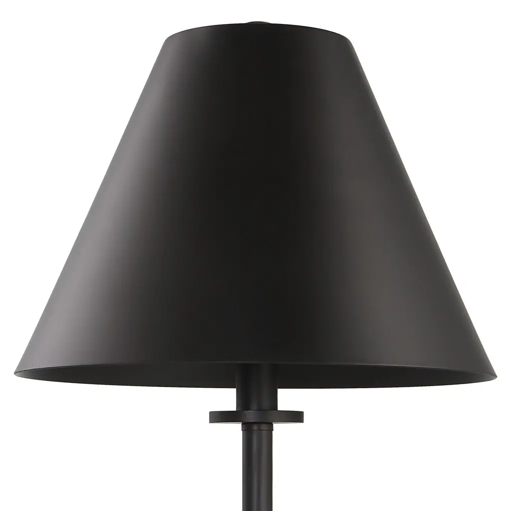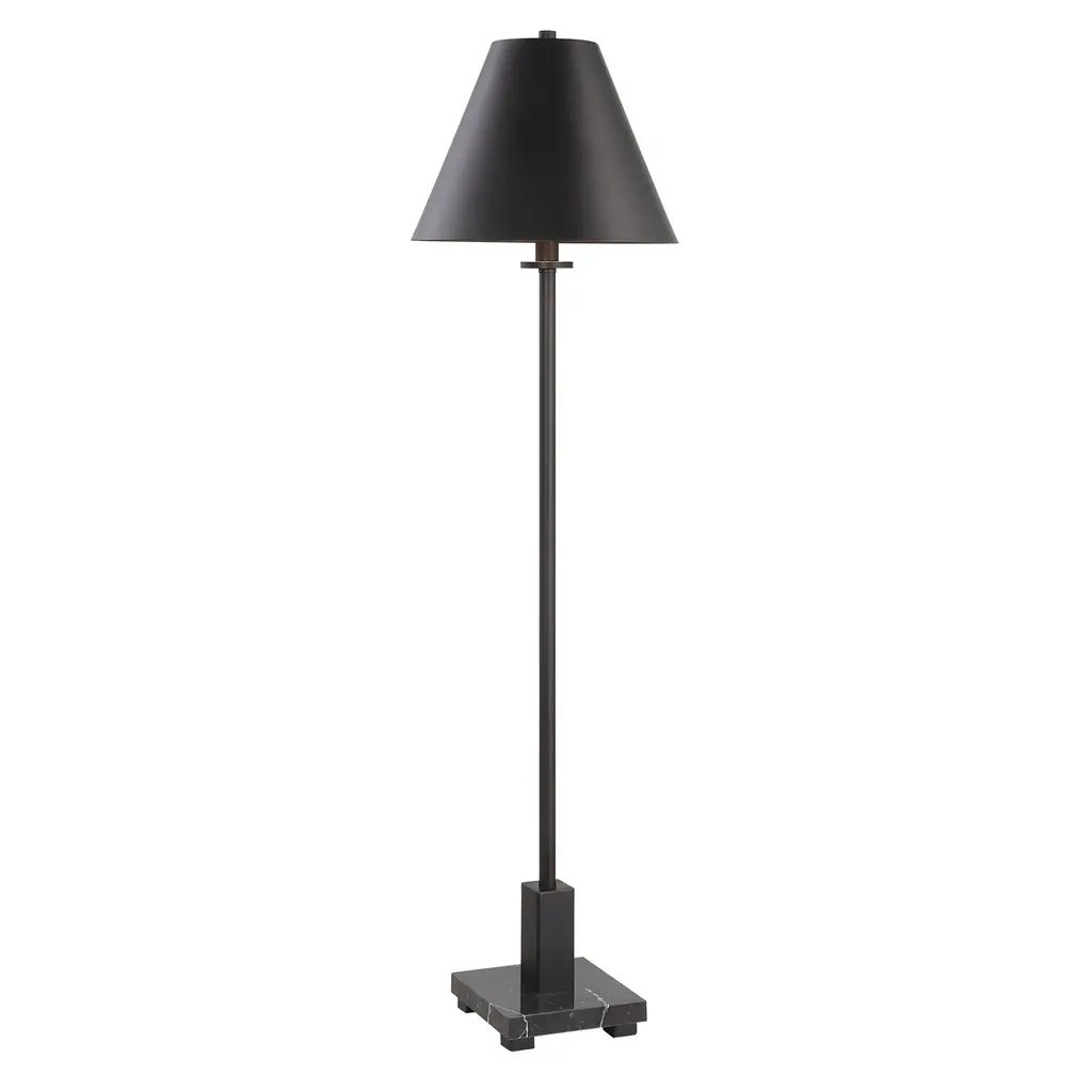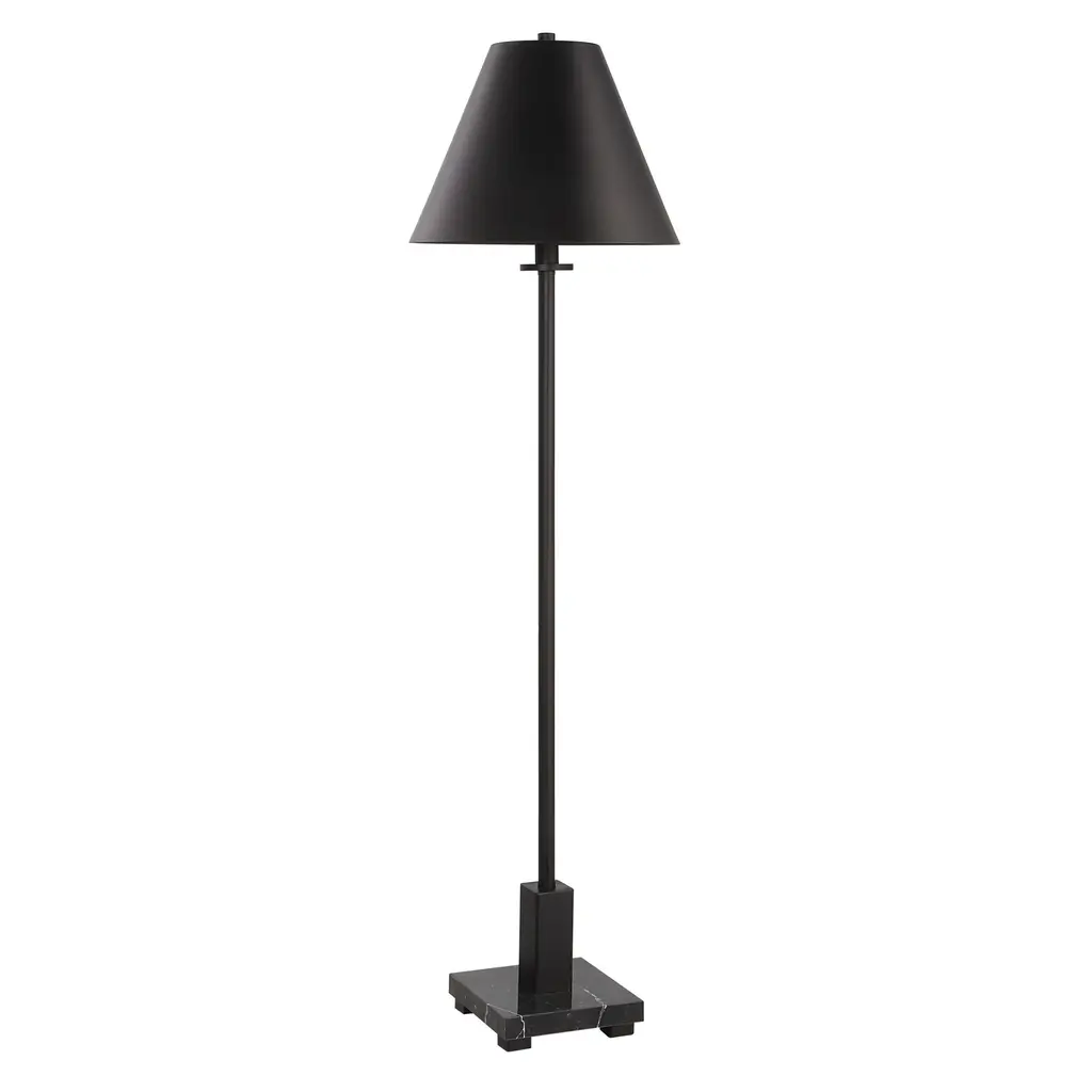 Illuminate your space with the sophisticated buffet lamp, showcasing a slender construction in a satin finish. Topped with a coordinating metal empire shade, it exudes contemporary design. The lamp is anchored by an elegant black marble foot featuring natural white veining, adding timeless allure and classic elegance to your living room. Product Features: Black slender buffet lamp Buffet lamp features a marble foot with natural white veining Includes a solid Empire shade Recommended for indoor use only Additional Features: Wattage: 60W Bulb type: E12 Socket type: on-off Switch type: socket switch Dimensions: Overall height: 36.5" high x 10" diameter Shade dimensions: 8" high x 10" diameter Material(s): metal/marble