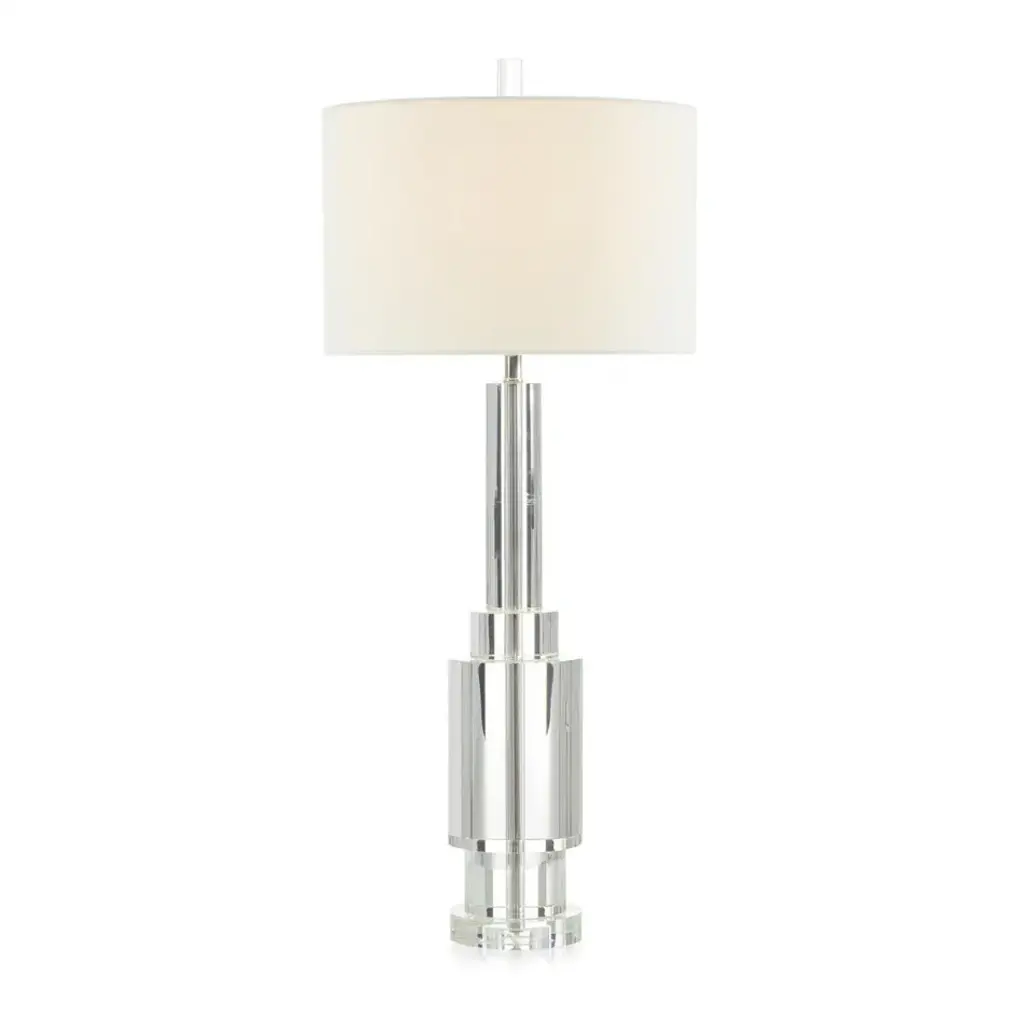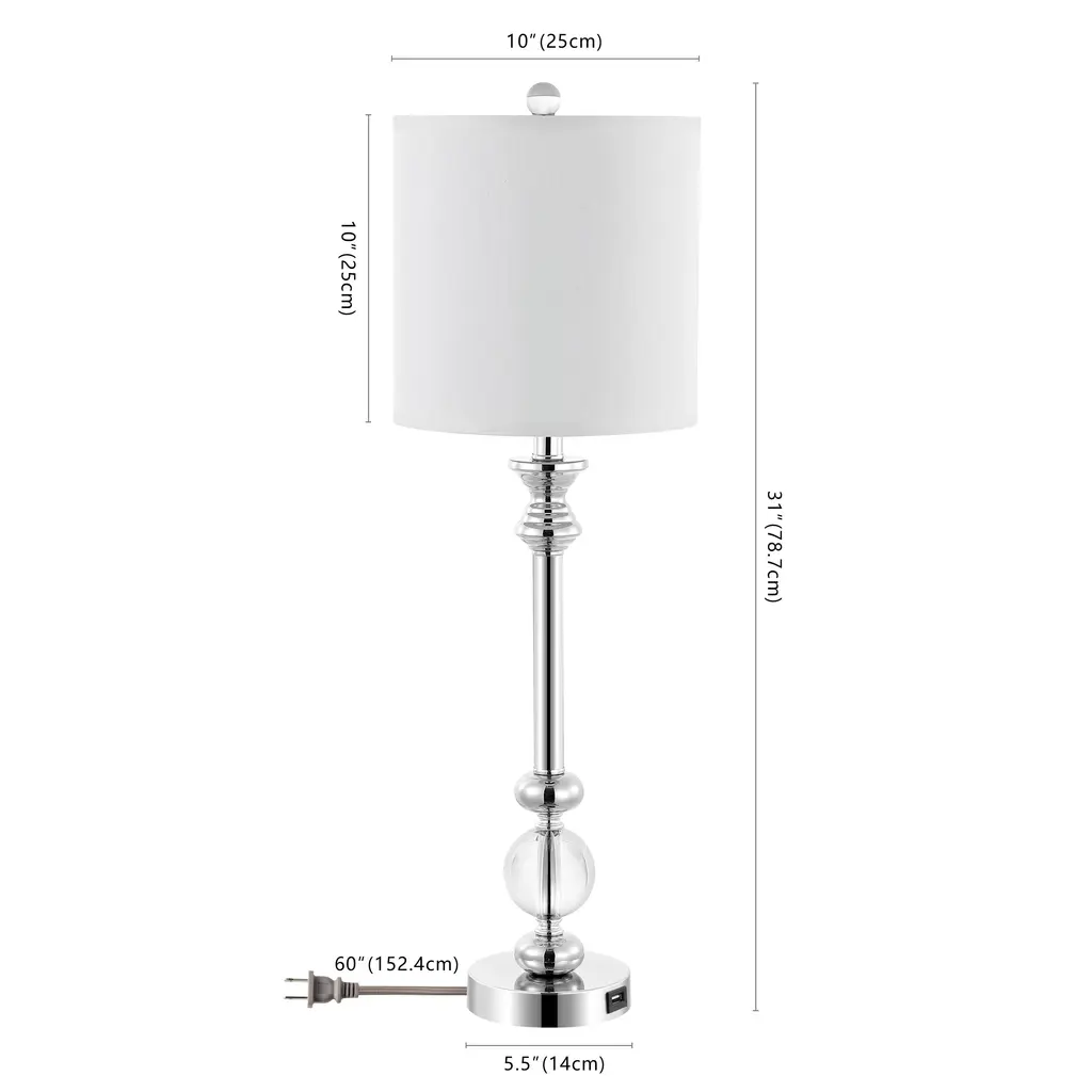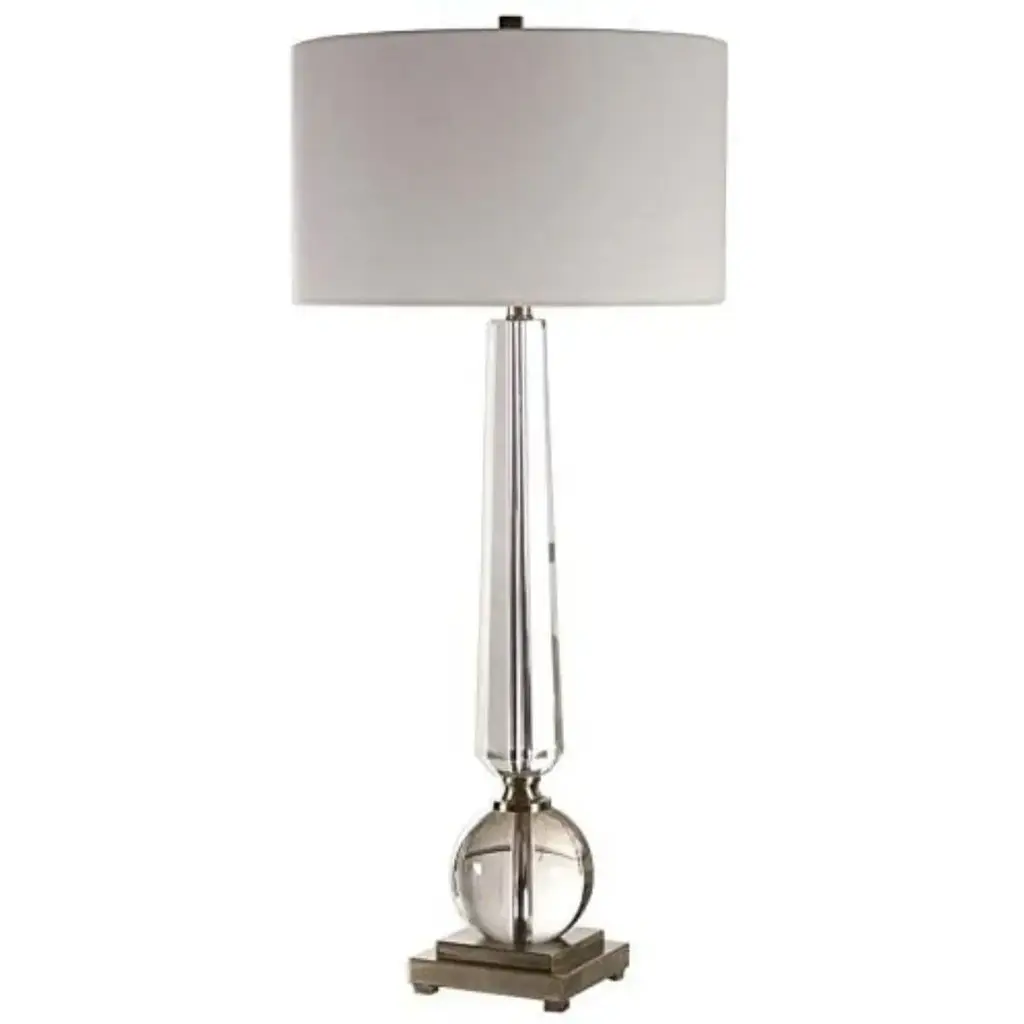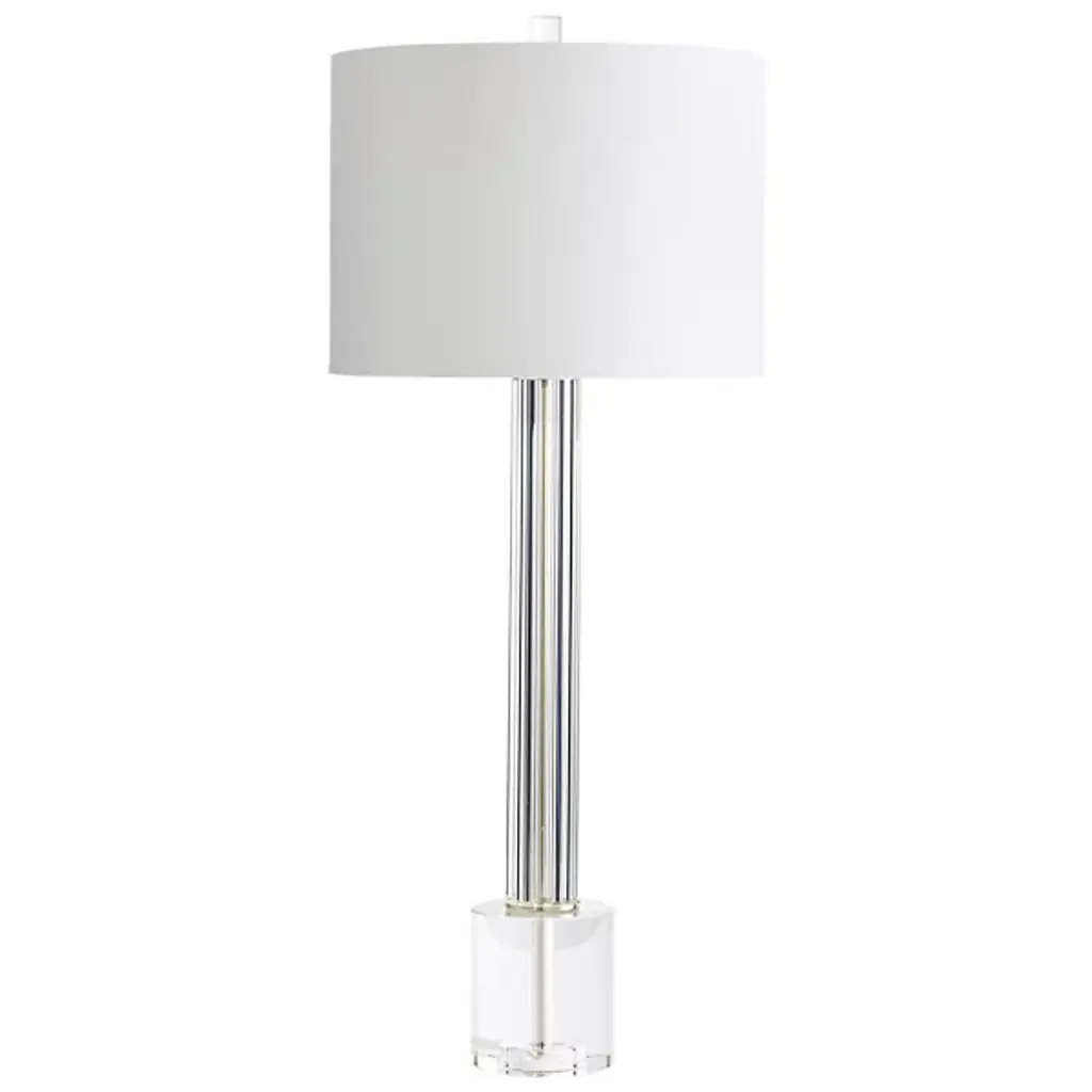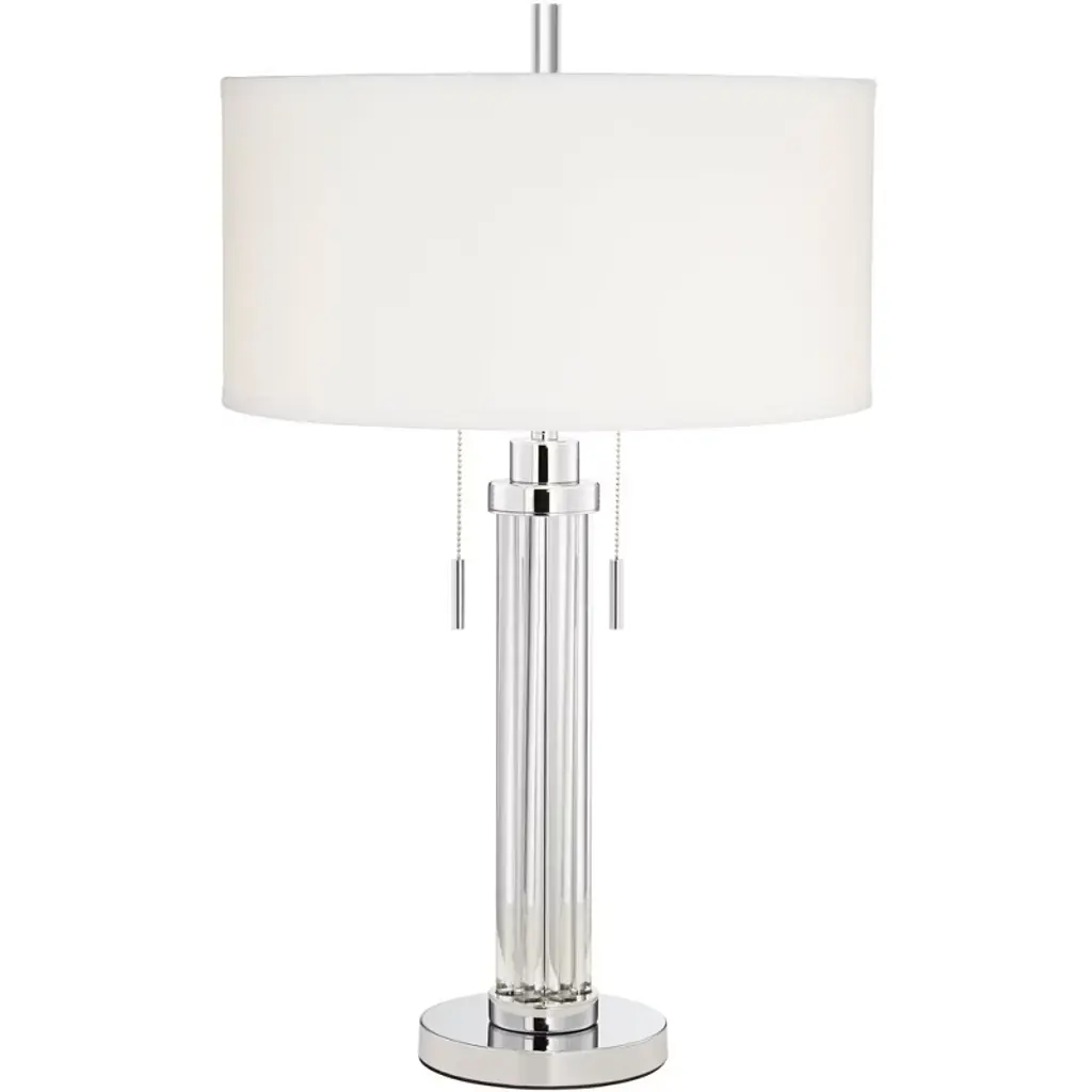 This table lamp is an elegant piece that combines materials such as glass, steel and fabric to create a stylish accessory for your interior decor. With its subtle design, it blends seamlessly into any living room, bedroom, or office setup. Its acrylic element gives it a contemporary twist. This table lamp is the finishing touch your space has been longing for, exuding both functional illumination and aesthetic appeal.Due to the production process, each piece is unique and no two are exactly alike.Perfect for enhancing the style quotient of living rooms, offices or bedroomsMade from a blend of glass, steel, fabric and acrylic for a modern aestheticIncludes a 2-way single pull chain switchOffers a unique design due to the individual production processMaterial: 40% Glass, 35% Steel, 20% Fabric, 5% AcrylicWeight: 3.5 poundsSwitch Type: 2 way Single Pull ChainSwitch Location: SocketSystem Type: Plug-InSocket Quantity: 1Bulb Shape: A19Socket Type: E26Voltage: 120VFixture Dimmable: No