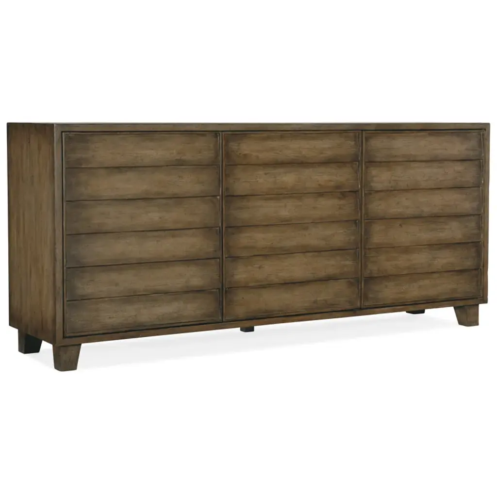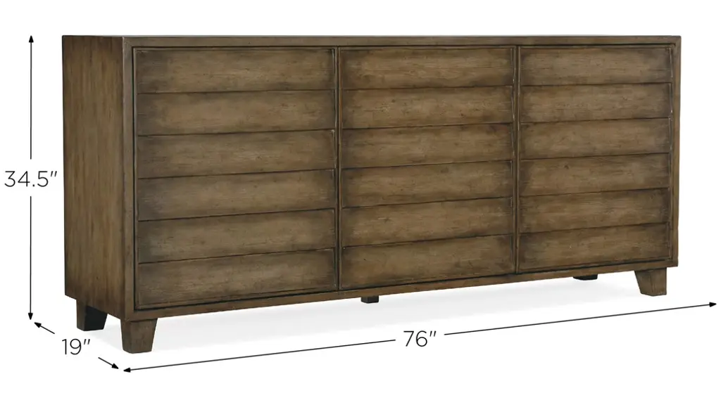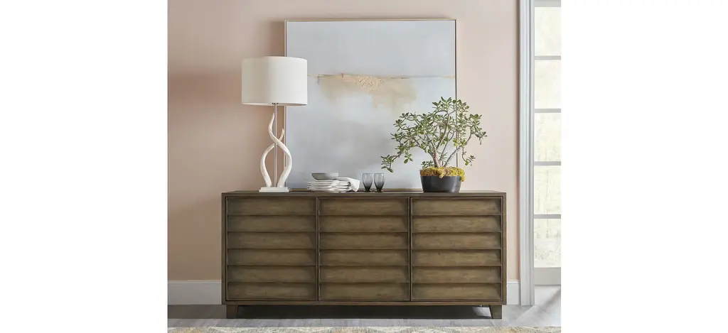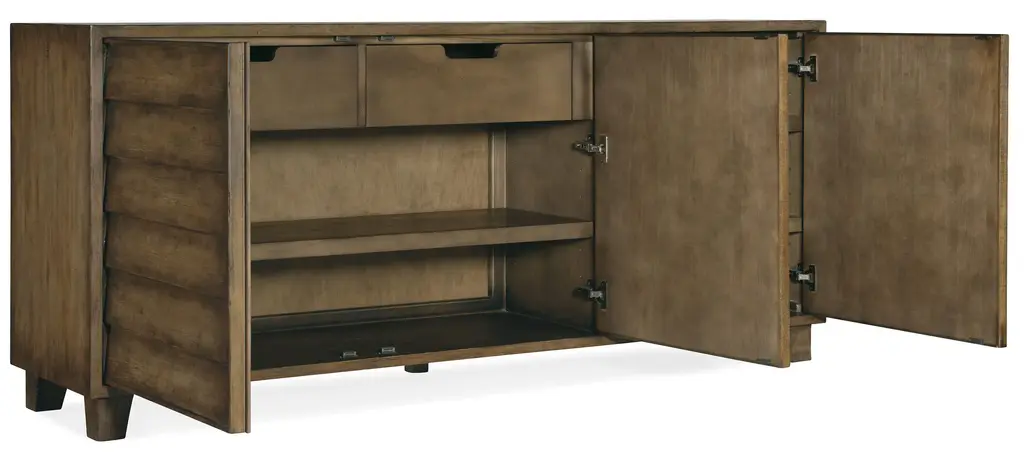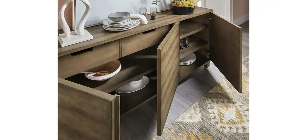 With a modern mountain aesthetic, the Surfrider Buffet strikes a serene profile with resort-inspired shutter-like door fronts. The buffet features 3 doors with touch latches and soft-close hinges and two self-closing drawers behind a left pair of doors. The left drawer has a removable drop-in felt liner, and the right drawer has a removable felt silverware tray. There's one adjustable shelf behind the left pair of doors and two adjustable shelves behind the right door. Crafted of Quartered Pine and Maple Veneers with a Solid-Wood edge top and finished in the rich brown Cliffside.