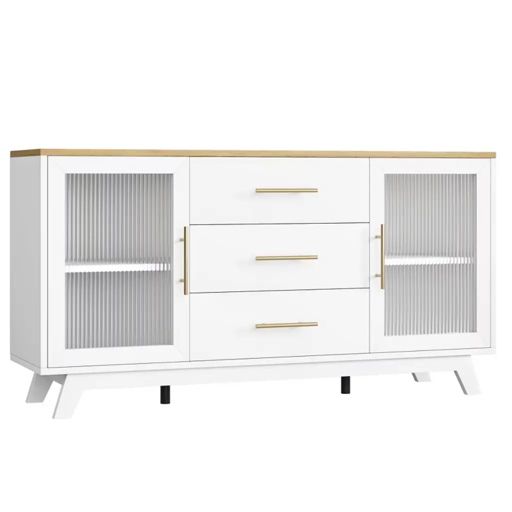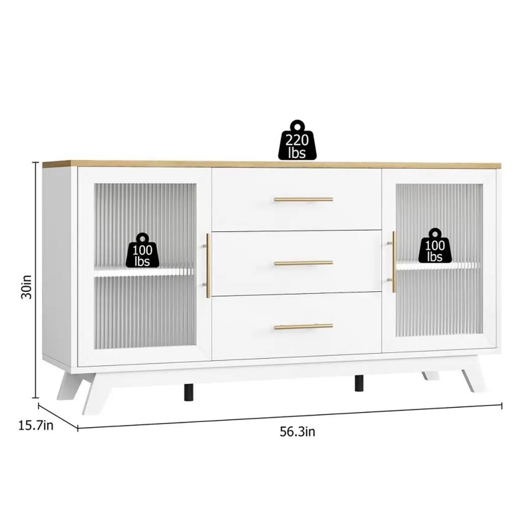 £ºTROPOW 60" Modern Sideboard Buffet Cabinet ¨C White & Natural Coffee Bar with Drawers, Fluted Glass Doors & Adjustable ShelvesProduct Overview:Elevate your home with the TROPOW 60" Modern Sideboard Buffet Cabinet, a refined blend of modern functionality and vintage charm. Featuring a white top, gold accents, and fluted glass doors, this piece is both stylish and practical. Ideal as a coffee bar, dining room storage, or media console, it offers adaptable organization with adjustable shelves and spacious drawers¡ªall built to last with a durable engineered wood frame.Key Features:Elegant Modern Design:Finished in white with natural wood accents, this cabinet features ribbed (fluted) glass doors and gold-tone hardware, offering a sophisticated vintage touch that suits contemporary, minimalist, or classic interiors.Customizable Storage Space:With 3 smooth-gliding drawers and adjustable interior shelves, this sideboard adapts to your storage needs¡ªideal for organizing dishware, barware, or electronics.Durable & Stable Construction:Built from moisture-resistant MDF and heavy-duty particleboard, the cabinet includes a scratch-resistant thickened top and reinforced legs for exceptional balance and longevity.Multi-Purpose Functionality:Whether used as a coffee station, dining room buffet, hallway console, or TV stand, its versatile design makes it a stylish and functional piece for any room.Easy Assembly & Support:Assembly is straightforward with clearly labeled parts and detailed instructions. TROPOW's responsive customer service ensures you have support every step of the way.Specifications:Brand: TROPOWColor: White TopProduct Dimensions (Assembled): 56.3"W x 15.7"D x 30"HShipping Dimensions: 62.99"D x 19.69"W x 7.09"HMaterial: Engineered Wood (Particleboard + MDF)Number of Drawers: 3Shelf Type: AdjustableMounting Type: Floor MountShape: RectangularItem Weight: 105.82 lbs