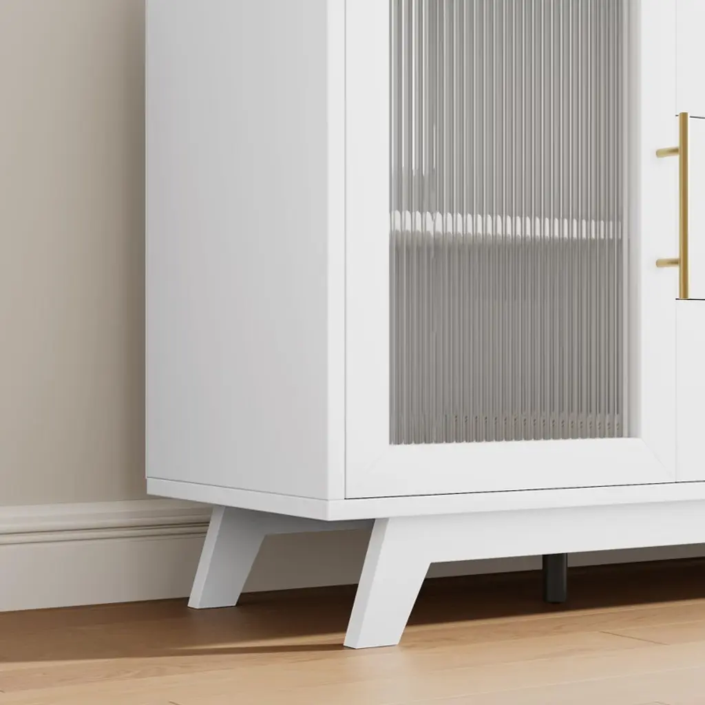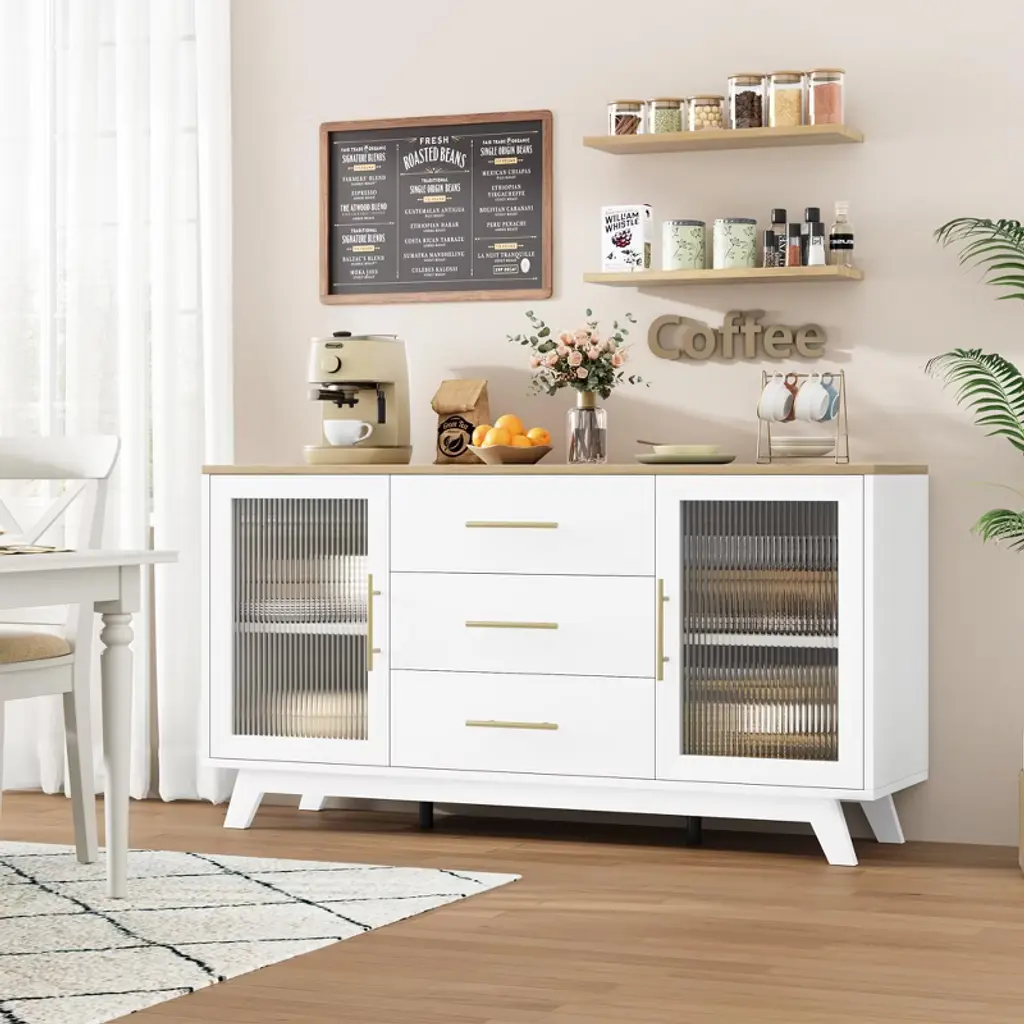 Tropow Buffet Cabinet - White & Natural Coffee Bar Storage With Drawers, Adjustable Shelves & Fluted Glass Doors For Kitchen & Dining Room