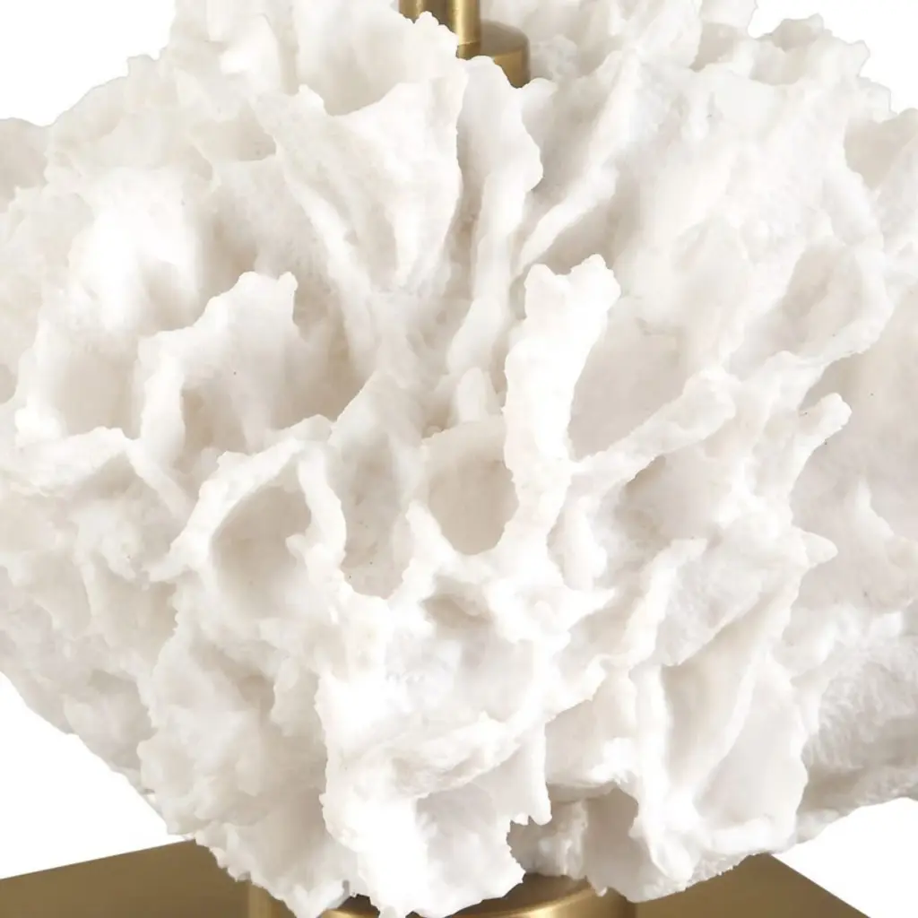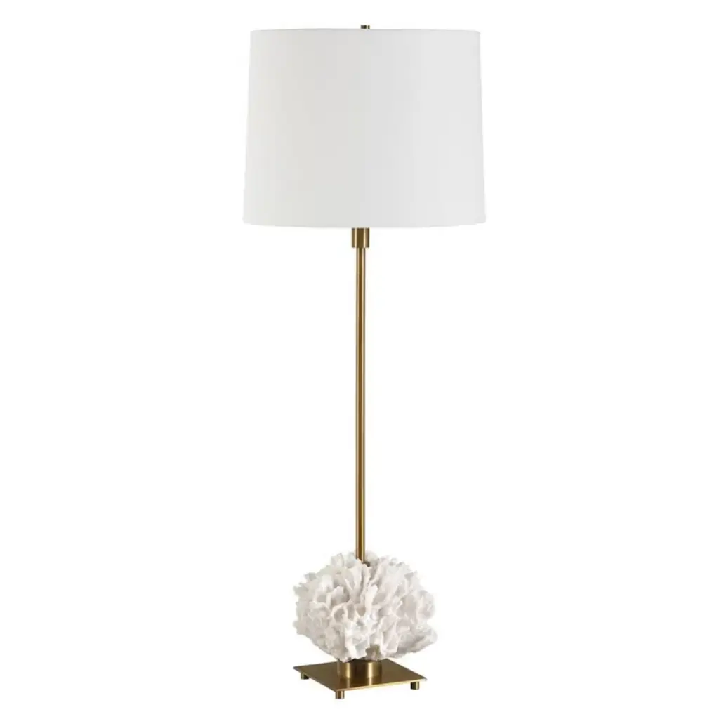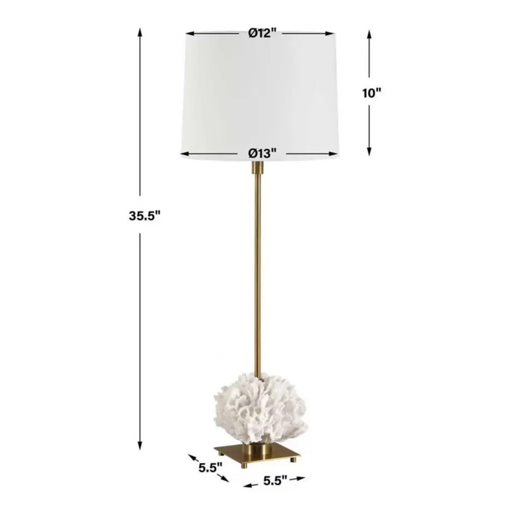 Caronia Buffet Lamp-Elegant Coral Base with Ivory Linen Shade Bring coastal elegance into your home with the Caronia Buffet Lamp, featuring a beautifully sculpted coral base in a soft ivory tone. This naturalistic design is elevated with antique brass plated iron accents, adding warmth and sophistication to its organic silhouette. Topped with a slightly tapered round hardback shade in casual ivory linen with subtle slubbing, this lamp blends texture, refinement, and seaside inspiration—perfect for adding character to entryways, consoles, or bedside spaces. Key Features: Ivory Coral Motif: Intricately formed coral-inspired base captures oceanic charm. Brass Plated Accents: Antique brass details lend warmth and contrast to the soft palette. Textured Linen Shade: Slightly tapered ivory shade adds relaxed sophistication. Stylish Versatility: Ideal for coastal, transitional, or nature-inspired interiors. Functional Specs: E26 standard socket (150W max), 3-way socket switch, linen hardback drum shade. Dimensions: 35.5" H x 13" W x 13" D This lamp transforms any surface into a serene and refined design statement.
