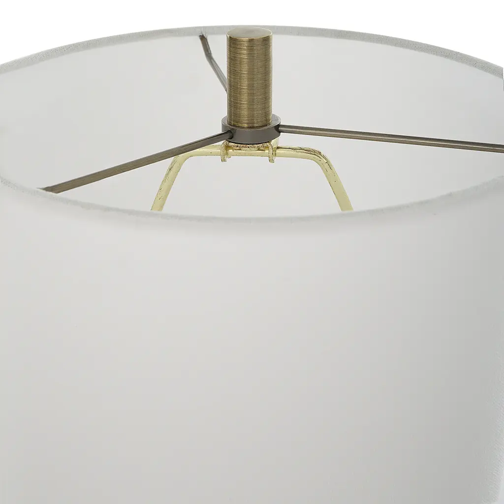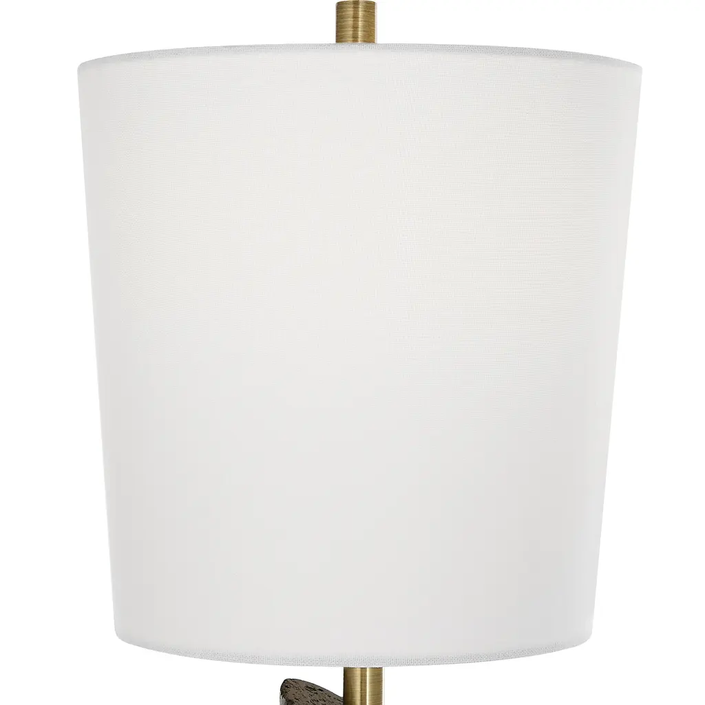 This futuristic buffet lamp design is made of cast black man-made stone with a noticeable pitted surface, paired with antique brass plated details. The white linen fabric shade is reversed tapered to follow the contour of the lamp base for a unique display. Uttermost's lamps combine premium quality materials with unique high-style design. With the advanced product engineering and packaging reinforcement, Uttermost maintains some of the lowest damage rates in the industry. Each product is designed, manufactured and packaged with shipping in mind. Features: Includes: One (1) Buffet Lamp Collection: Cypher Material: Steel, Rice Stone, Resin, Fabric Shade: Round Drum Hardback Shade Wattage: 100W Bulb Type: A 1 Light - 1 Bulb required Socket type: ON-OFF Designer: Carolyn Kinder No assembly required Dimensions: Dimensions: 36 inches high x 10 inches wide x 10 inches deep Shade size: Height: 10 inches, Top: 10 inches wide x 10 inches deep, Bottom: 8.5 inches wide x 8.5 inches deep Item weight: 10 lbs This product will be shipped to you in one (1) box. Accessories pictured are NOT included. WARNING: This product can expose you to chemicals including nickel which is known to the State of California to cause cancer. For more information, go to www.P65Warnings.ca.gov/furniture.