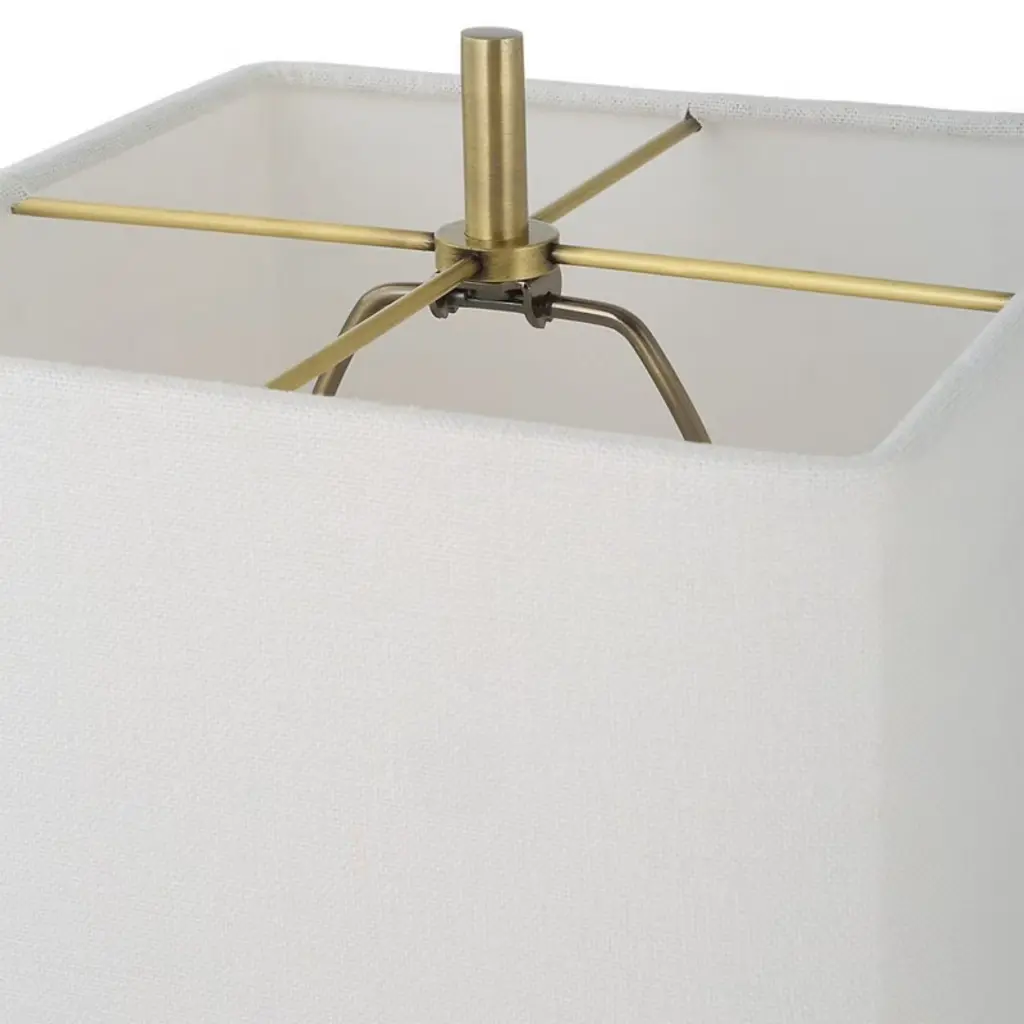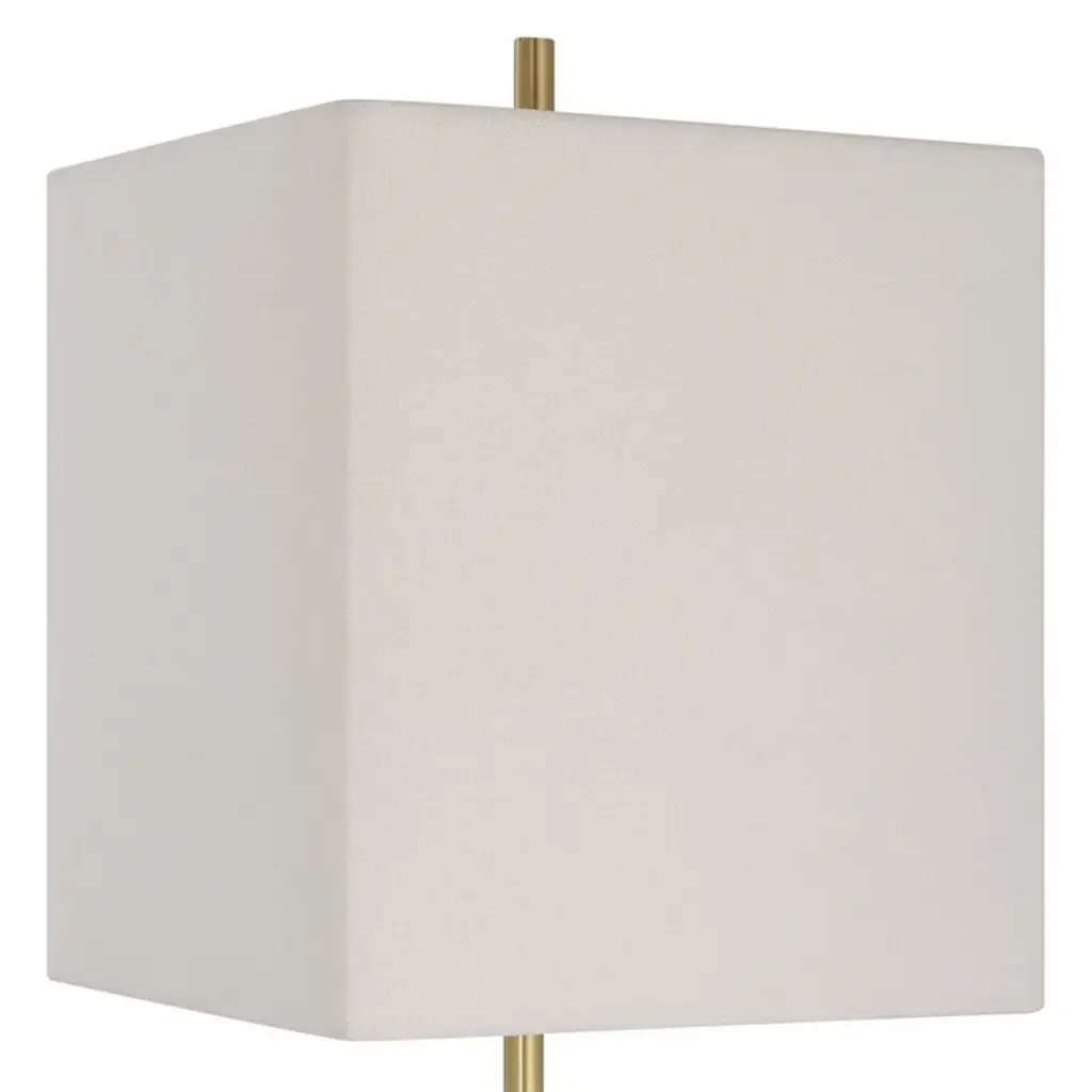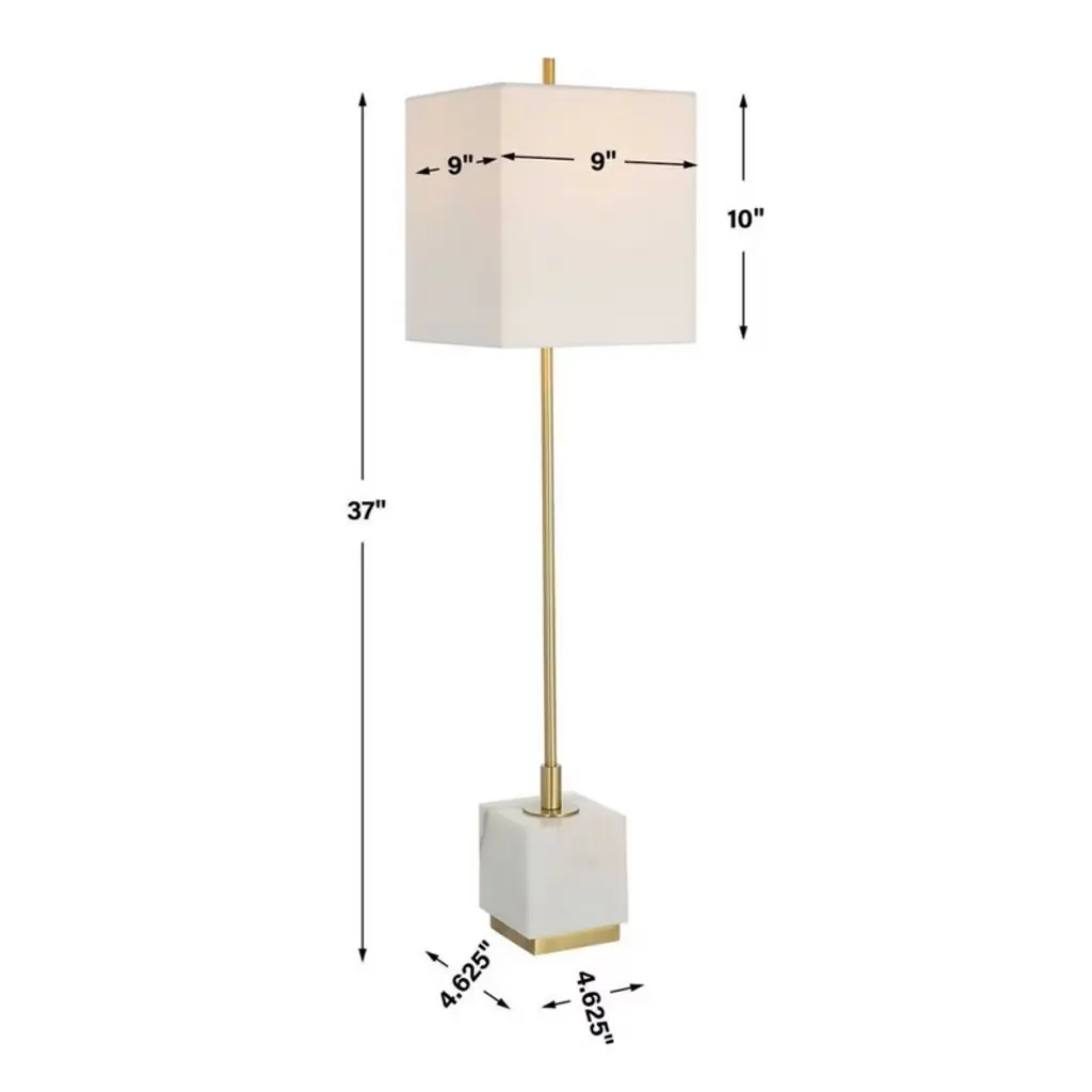 Enhance your decor with the Uttermost Escort Brass Buffet Lamp, a sophisticated combination of sleek design and natural materials. The slim metal base is finished in plated brushed brass and accented by a substantial white marble block foot with natural veining. Its square hardback shade, covered in slubbed white linen fabric, provides soft, diffused light for a warm ambiance. Measuring 37"H × 9"W × 9"D, this versatile lamp is ideal for sideboards, consoles, or nightstands, complementing contemporary, transitional, and modern interiors. Product Features: Material: Metal base with white marble foot and square linen shadeColor: Plated brushed brass, white marble, white linenFinish/Frame: Brushed brass with marble accentDimensions: 37"H × 9"W × 9"DShade: Square hardback, 10"H, top 9"W × 9"D, bottom 9"W × 9"DBulb: 100W, 1 TYPE A, ON-OFF socketStyle Match: Contemporary, transitional, modern interiors