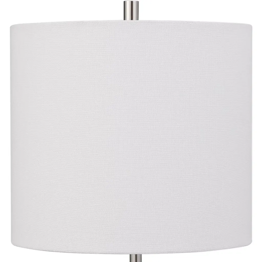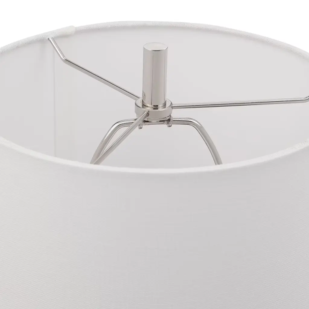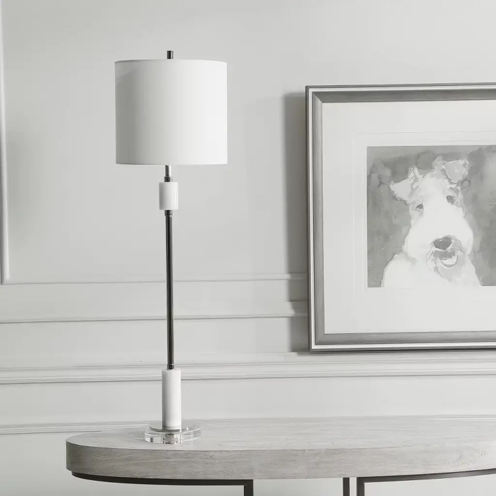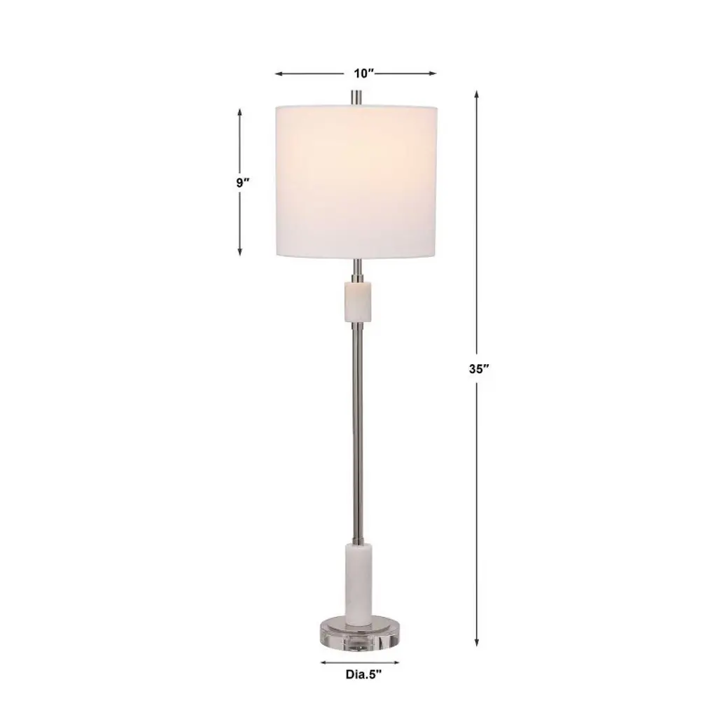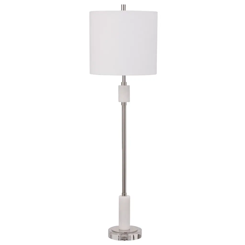 The Uttermost Sussex Nickel Buffet Lamp brings refined elegance to your space with its tall, slender silhouette and upscale material blend. Standing at 35 inches tall with a 10-inch square base, this transitional lamp showcases a polished nickel finish paired with sophisticated white marble accents and a thick, clear crystal foot for added luxury. It’s topped with a round hardback drum shade in crisp white linen featuring a lining background for subtle texture and glow. Crafted from crystal, marble, steel, and fabric, this lamp is ideal for flanking a buffet, illuminating a console, or bringing elegance to a bedroom or study. Its timeless design and premium materials make it both functional and decorative. Key Features: Materials: Crystal, white marble, steel, and fabric Finish: Plated polished nickel with marble and crystal accents Shade: Round hardback drum with lined background, white linen Dimensions: 35” H x 10” W x 10” D Bulb Type: 1 x Type A bulb, max 100W (bulb not included) Socket Type: On-off socket Voltage: 110V Weight: 5.75 lbs Design Style: Transitional with modern elegance