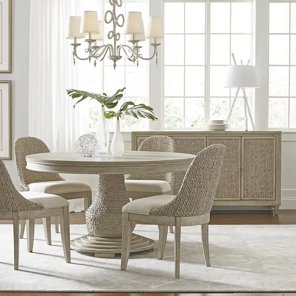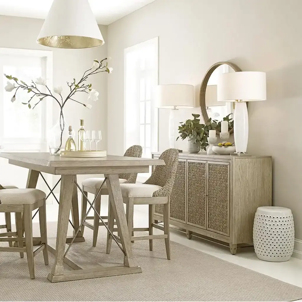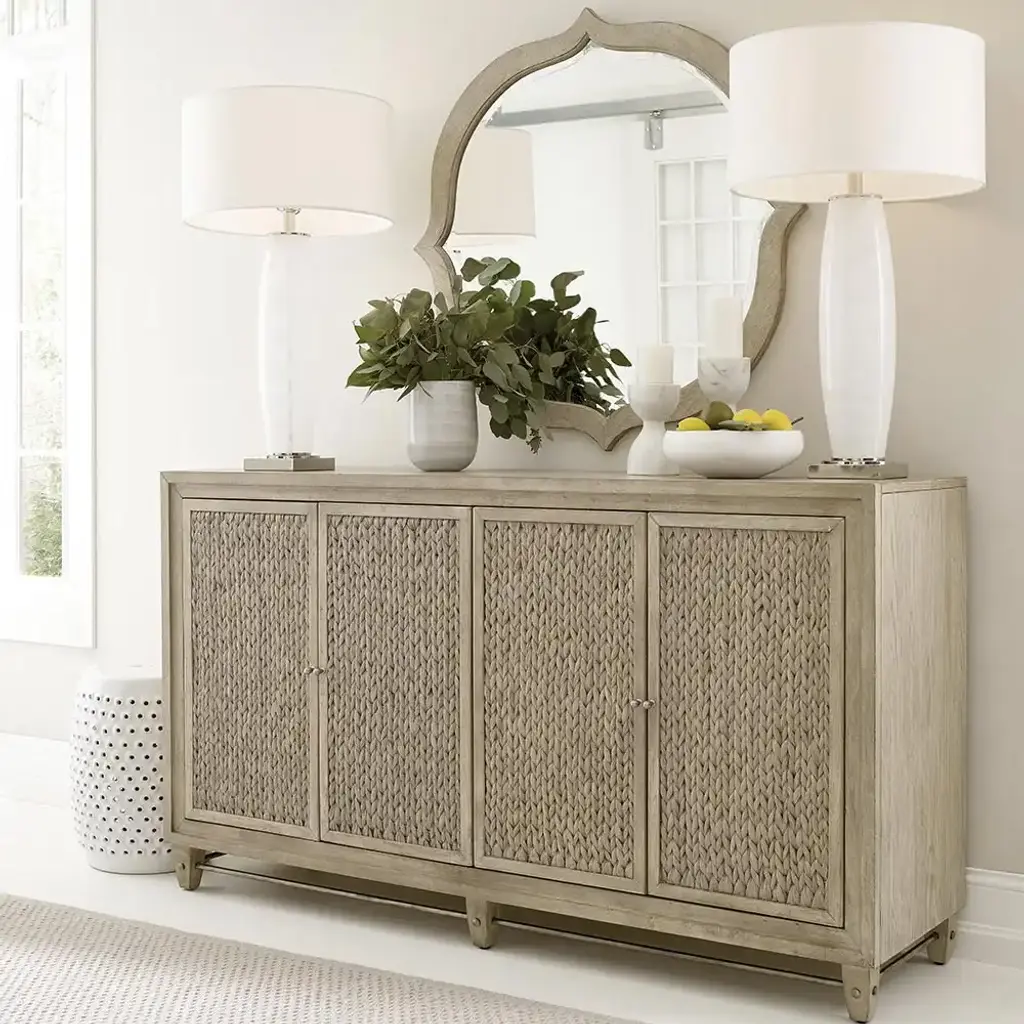 The Sterling Buffet from the Vista Collection blends rustic charm with modern elegance. Crafted with a combination of wood, seagrass door panels, and metal accents, it exudes timeless sophistication. Featuring White Oak and select hardwoods, this buffet offers durability and style. Behind its doors lie adjustable shelves, providing ample storage space, while two felt-lined drawers offer a touch of luxury. Whether hosting a dinner party or organizing everyday essentials, the Sterling Buffet adds both functionality and flair to any space.