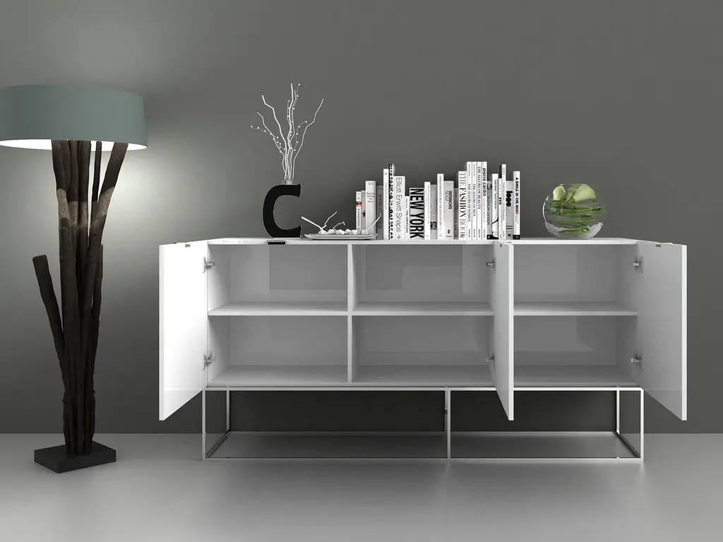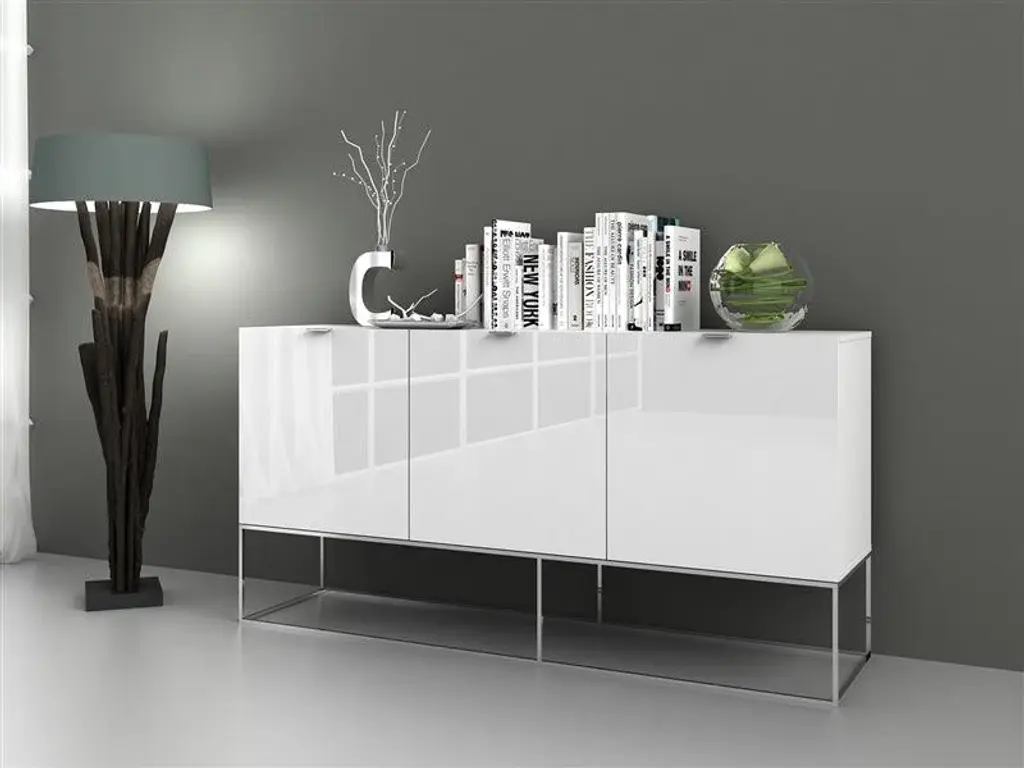 The VIZION High Gloss White Lacquer / Stainless Steel Buffet. Features clean and modern lines adding a sophisticated look and modern edge to any room.