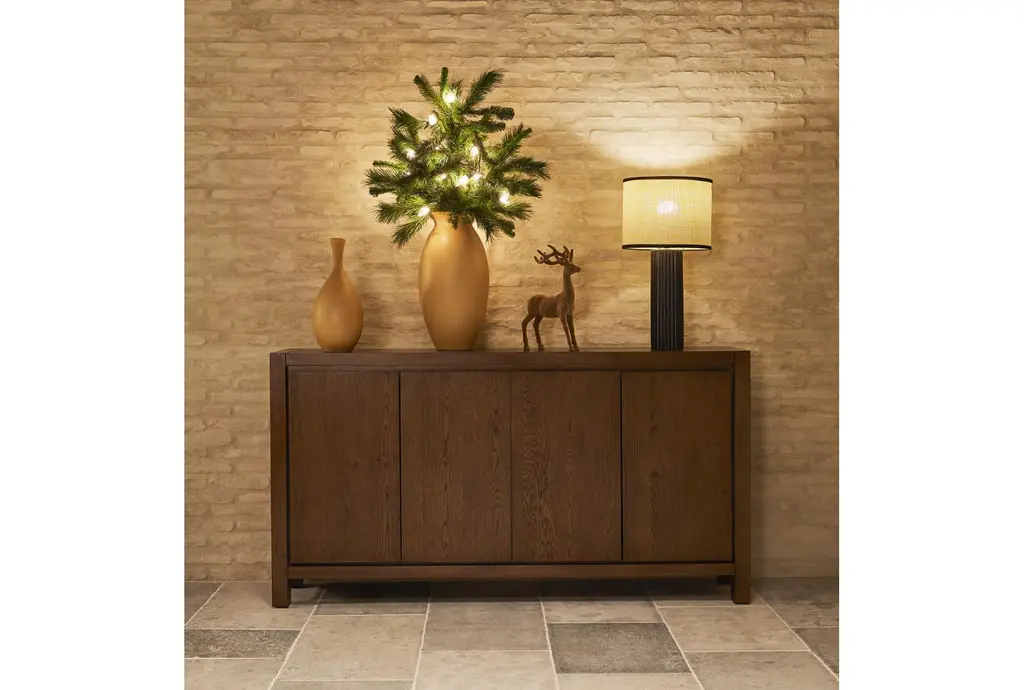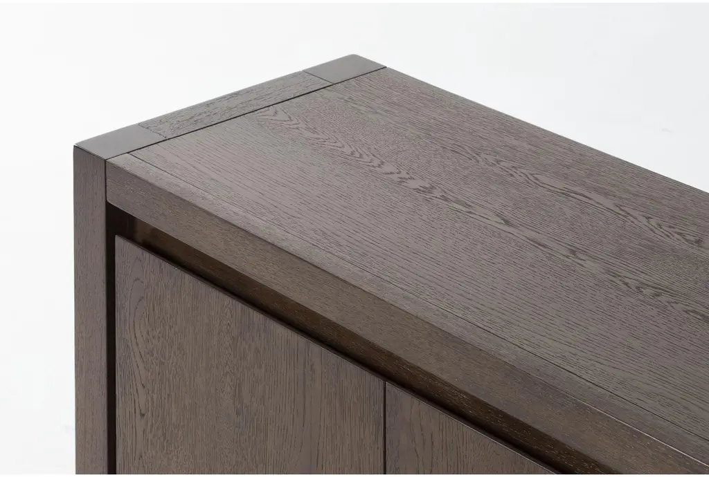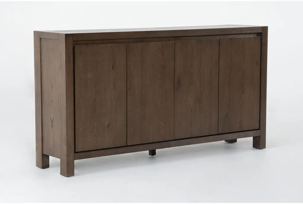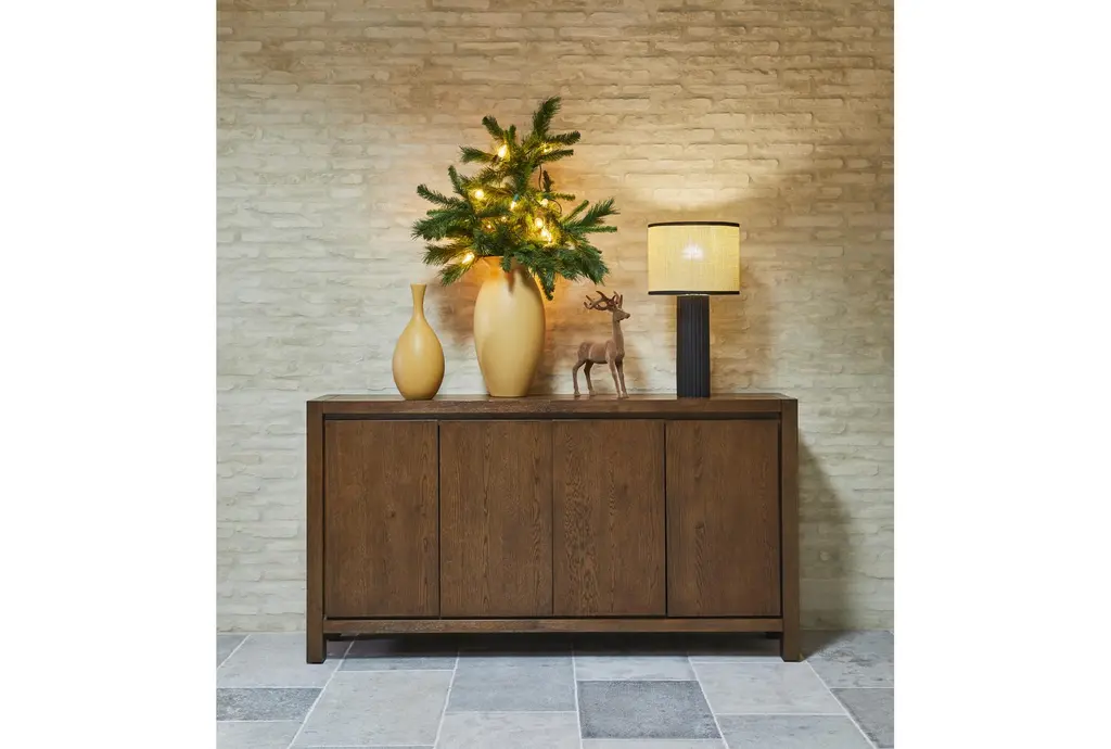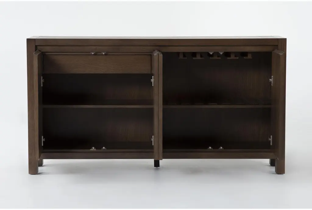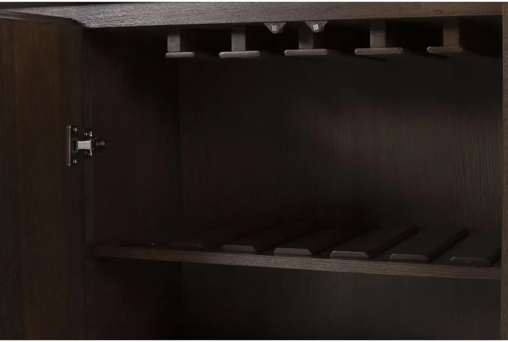 Building on their minimalist Voyage collection, Nate Berkus and Jeremiah Brent are introducing the same bestselling designs in a richer, darker finish. The Voyage Brown buffet presents a sophisticated, rustic take on the clean, modern lines of the original. Crafted with oak veneer and hardwood, this piece evokes intentionality, functionality and simplicity. Behind 4 doors, you'll find stemware racks and bottle racks, a felt-lined drawer for silverware and shelving.