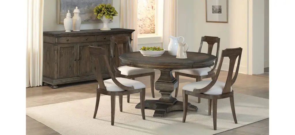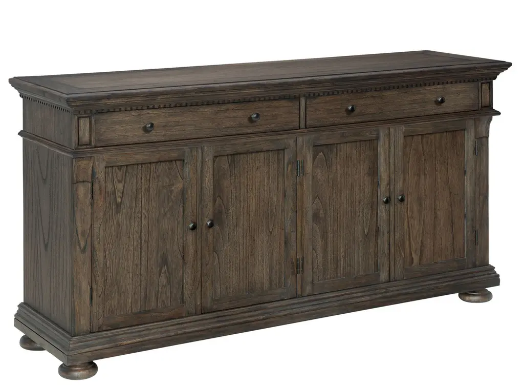 Simple in its presentation, but thoughtful in its subtle details, the Wellington Estates Dining Buffet is a classy addition to any dining room. Made of mindi veneers and select mindi solids. With two drawers that have silver tray and silver liners in top drawers. Shelves behind each door with rustic antique brass hardware.