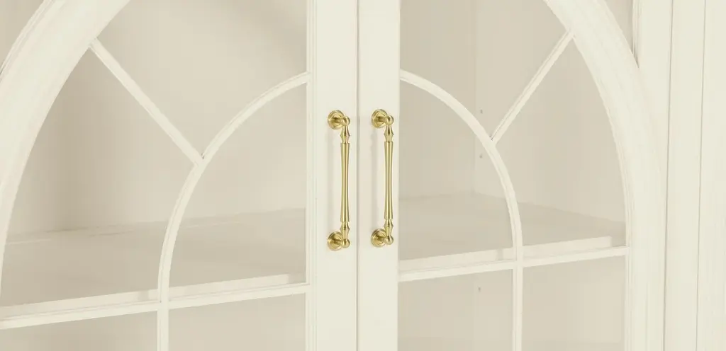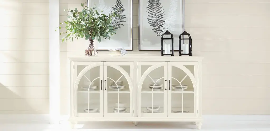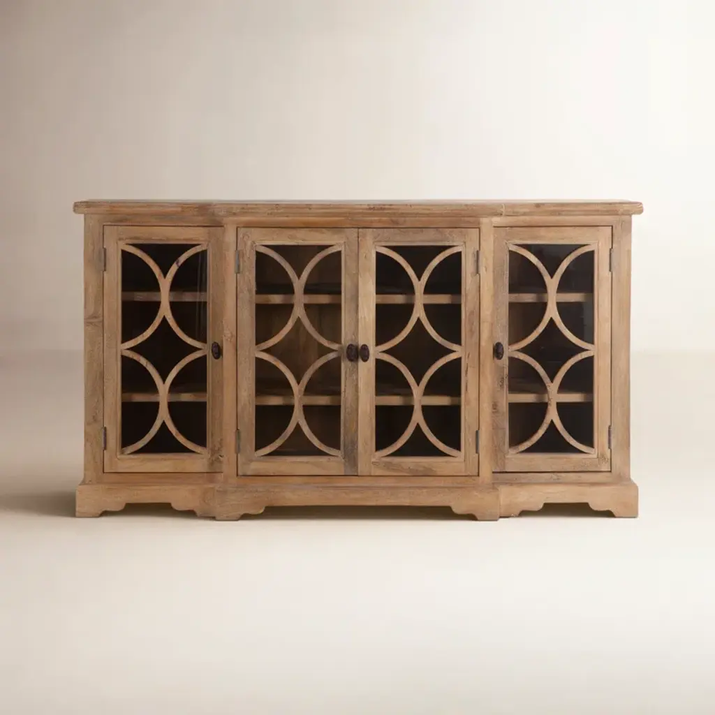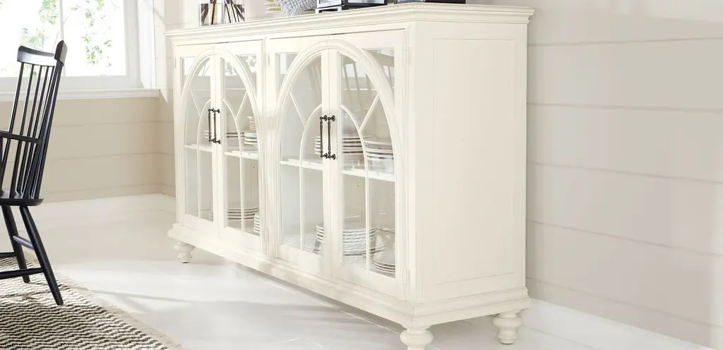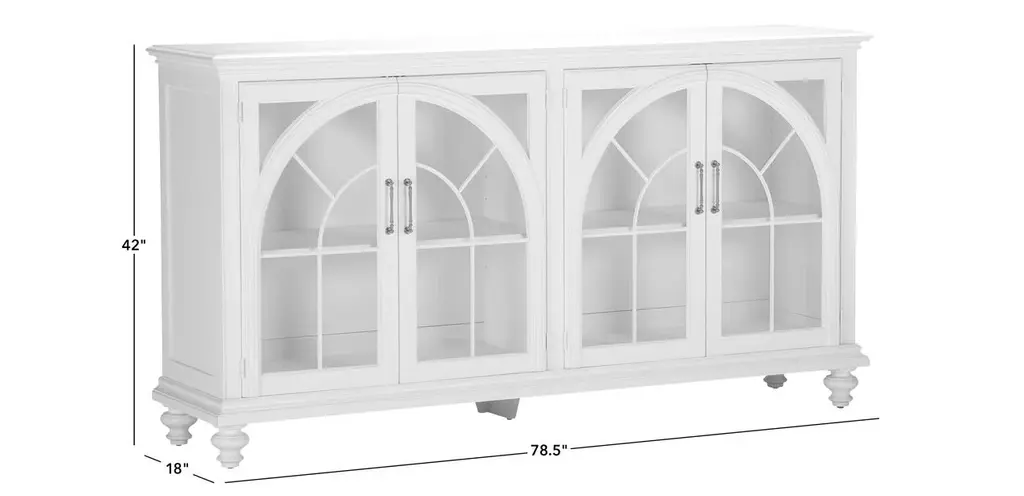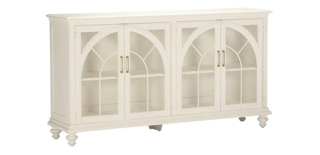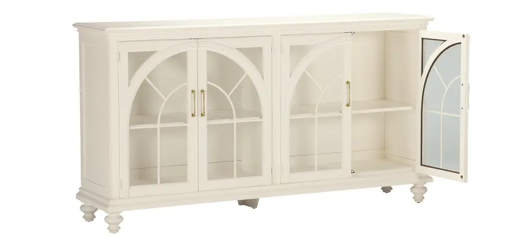 Inspired by vintage window shapes found at the peaks of cottages, our Zeta buffet cabinet features bun feet and inset carving at the pilasters—a vintage-inspired update. Layers of molding create the curved overlays found on each door. Stunning arches highlight the cabinet's doors, while tempered glass door panels show off dishes or collectibles.
