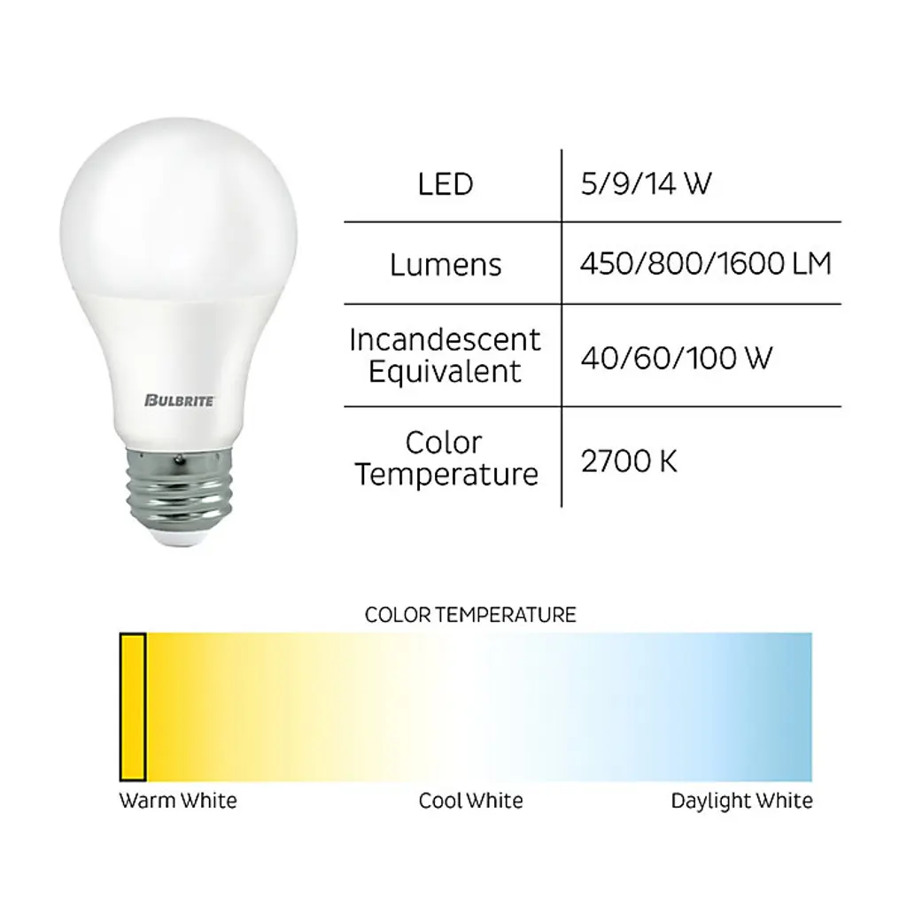 Designed in the shape of a classic incandescent bulb, our 3-Way LED Medium Light Bulb transitions smoothly between Low, Medium and High, so you can pick the perfect light for your mood and needs. Frosted glass bulb casts warm white light. Made to last an average of 25,000 hours, it's rated for wet locations. 3-Way 5/9/14W LED Medium Light Bulb features: